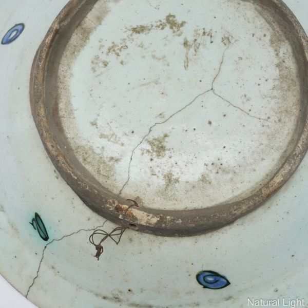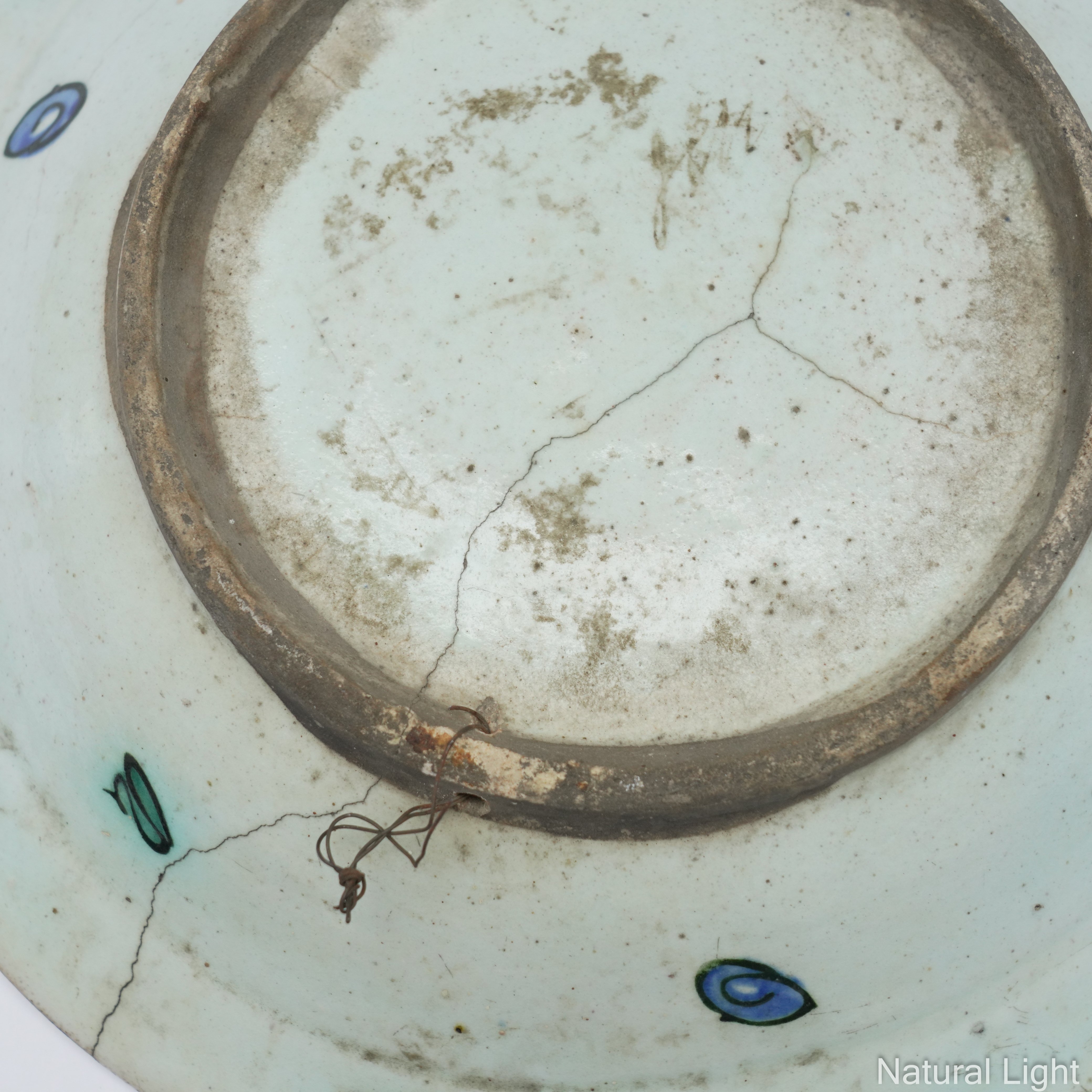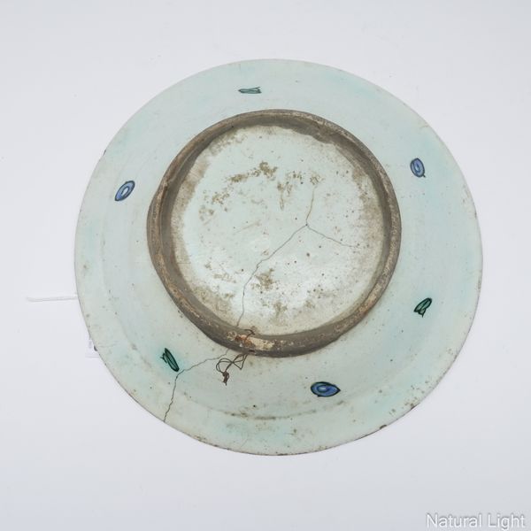 Haircrack to the rim which runs to the centre of the dish, approx. 18cm length, which then forks into two, each approx. 4cm. length. Two shallow chips and some glaze chips around the rim. Firing flaw to left centre of dish. Minor wear