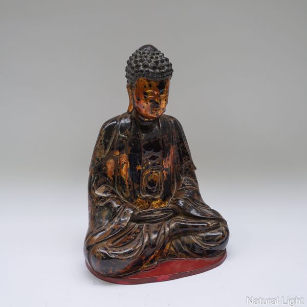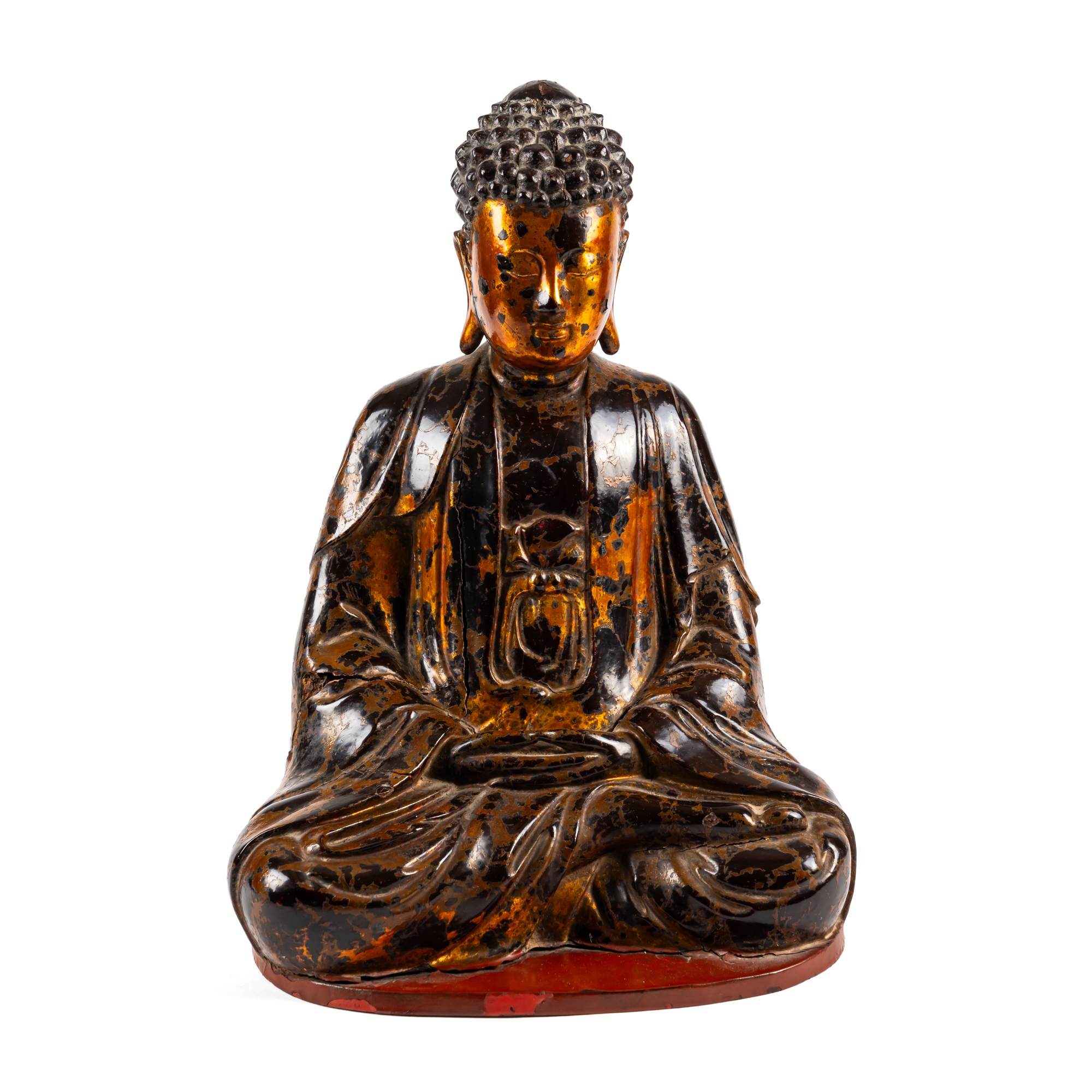 Modelled in seated virasana half-lotus pose, raised on a red lacquered base, 40cm high