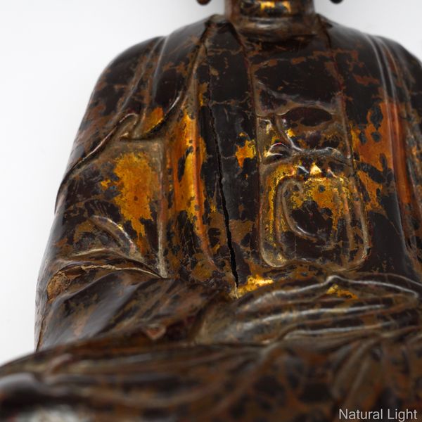 several significant splits, including horizontal and vertical extending full length of figure, wear commensurate with age and use including flakes to patina and lacquer