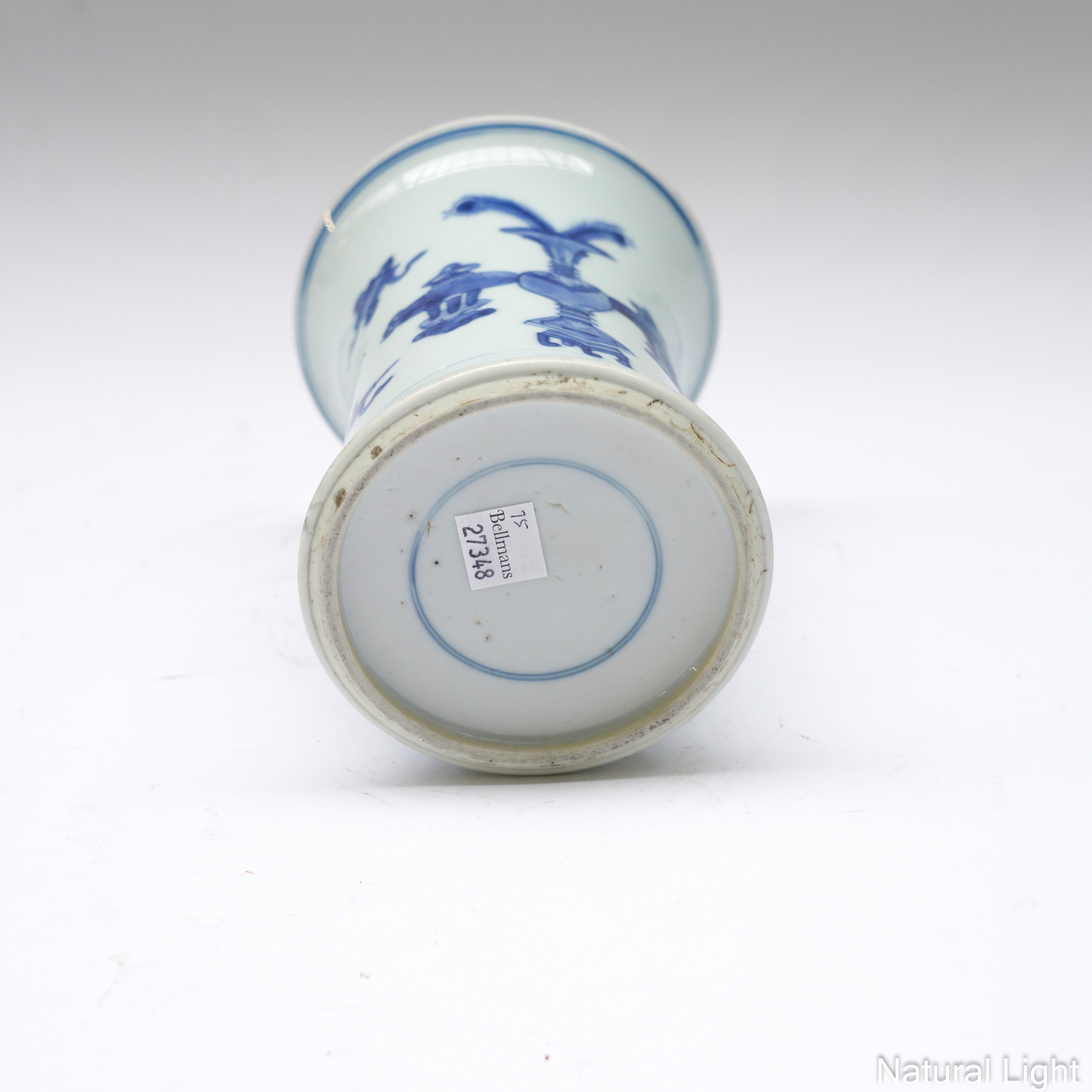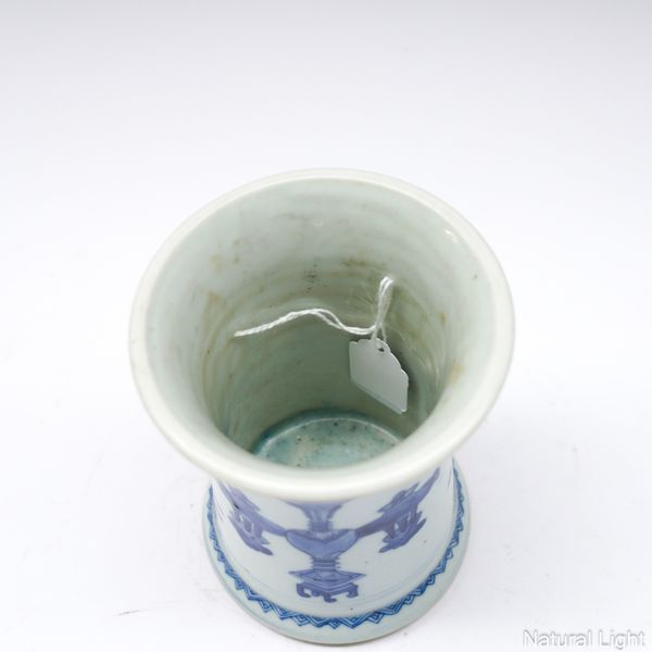 The waisted sides painted with archaic vessels and Buddhist emblems above a chevron border, 14cm high