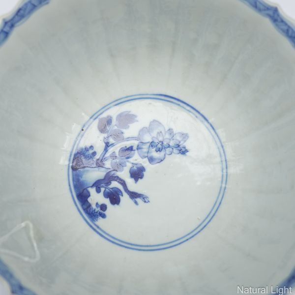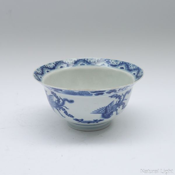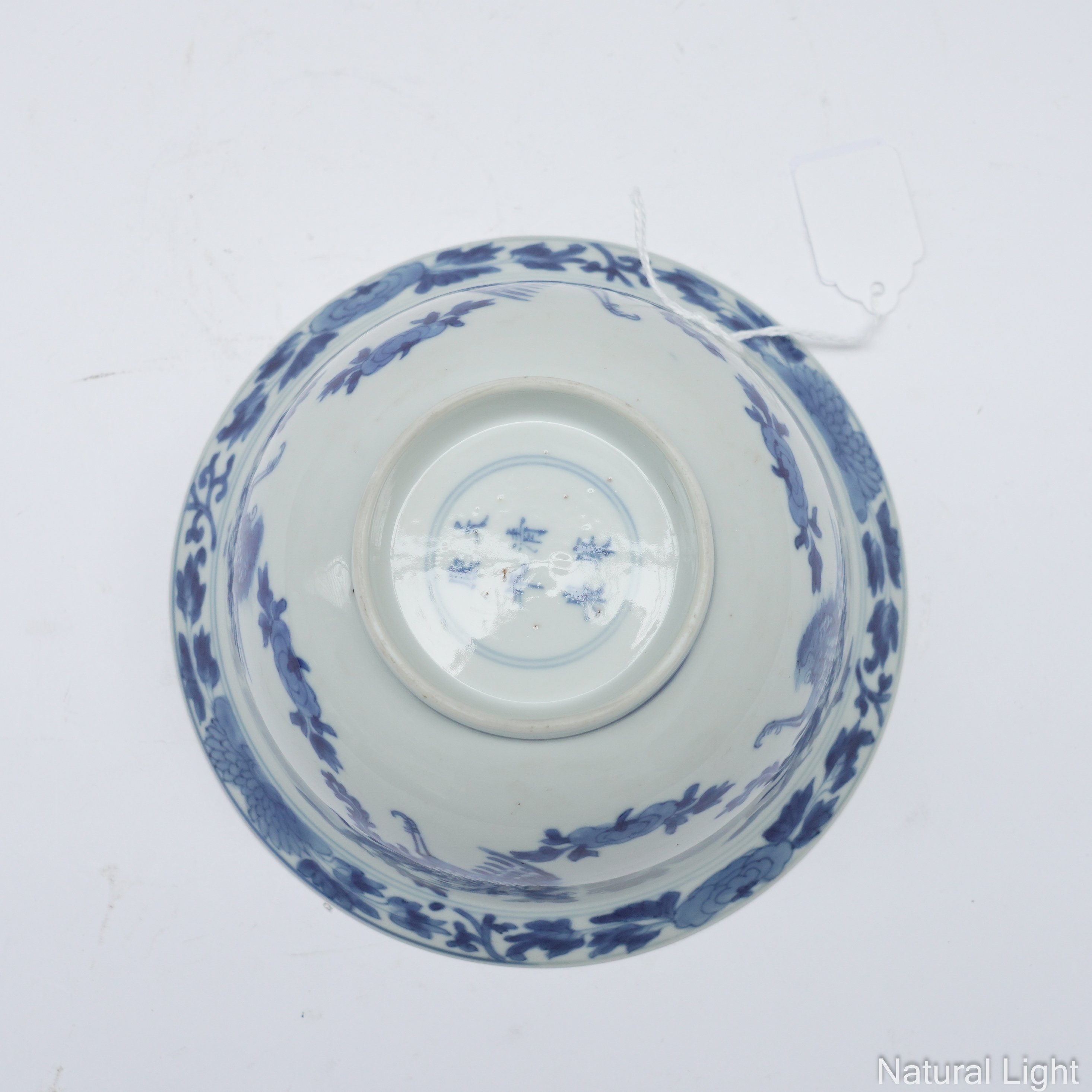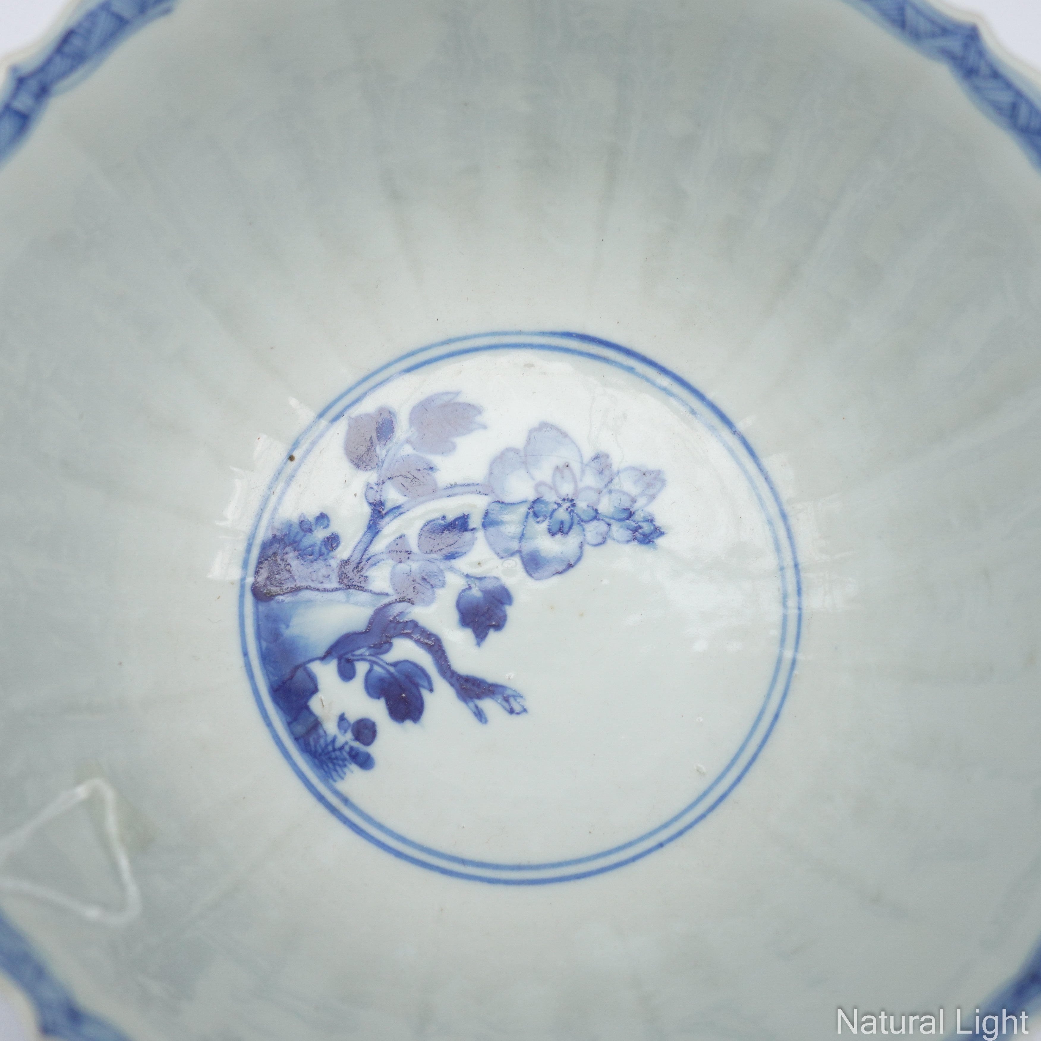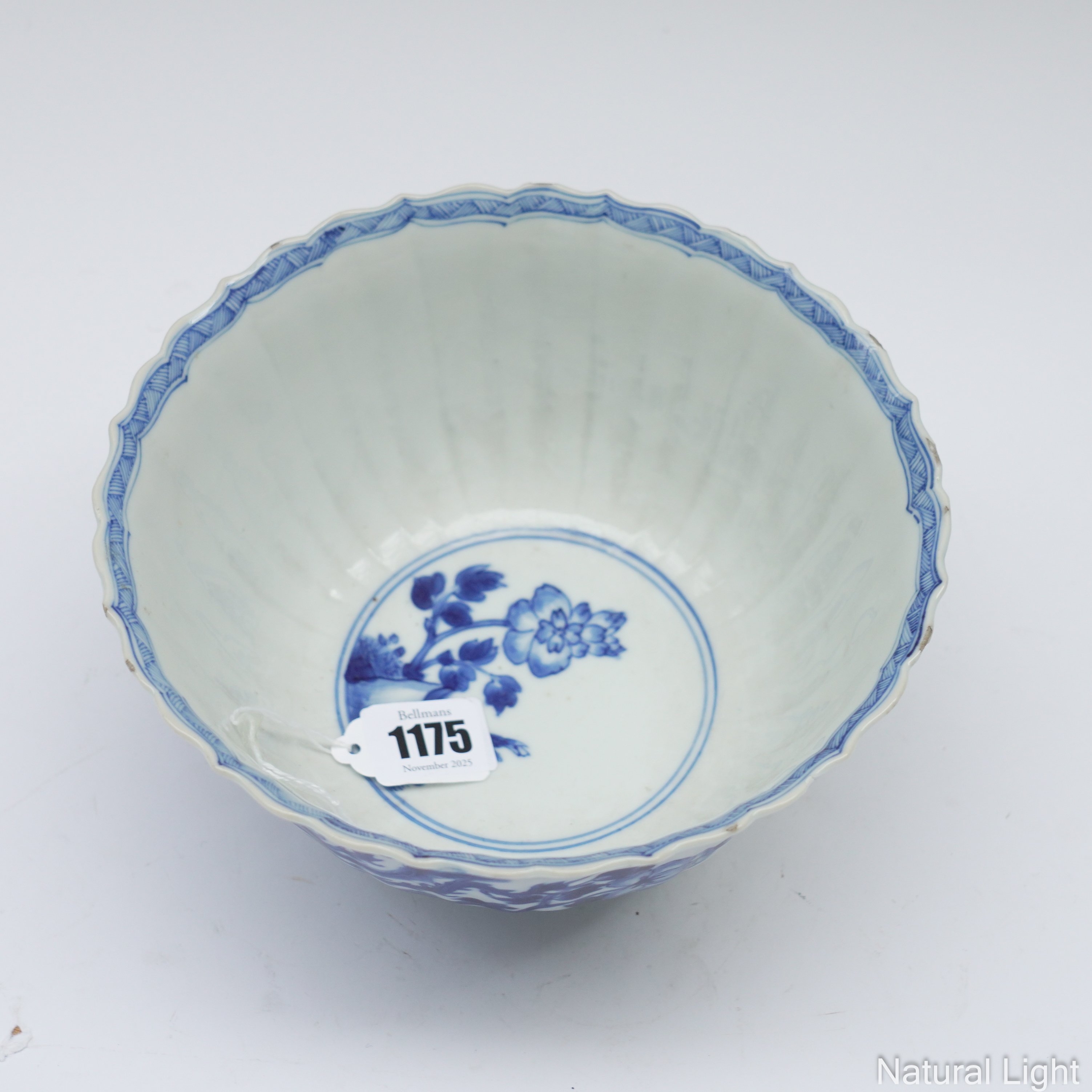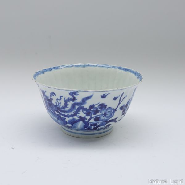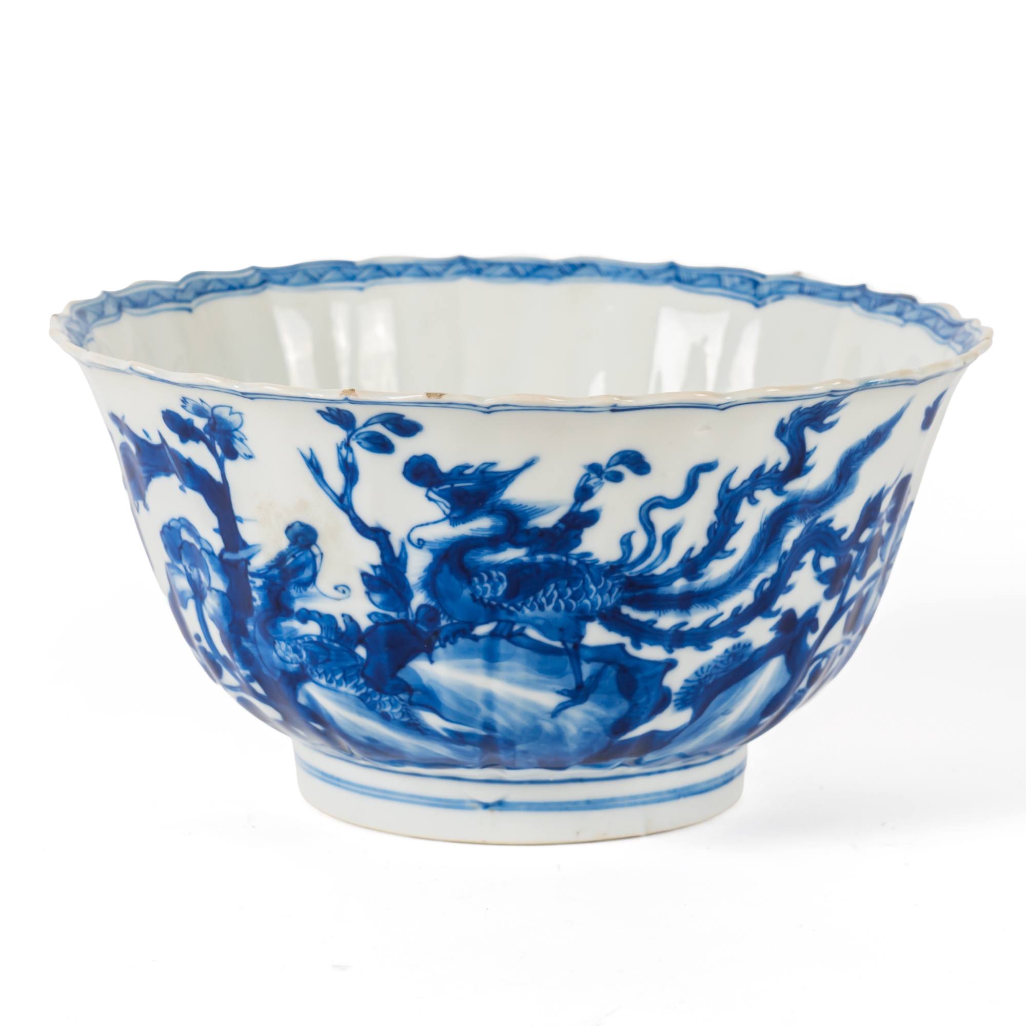 Of fluted form beneath a scalloped rim, decorated with phoenixes, birds, and flowers to exterior, the interior with central roundel of flowers, two character mark to base, 19.5cm diameter by 10cm high