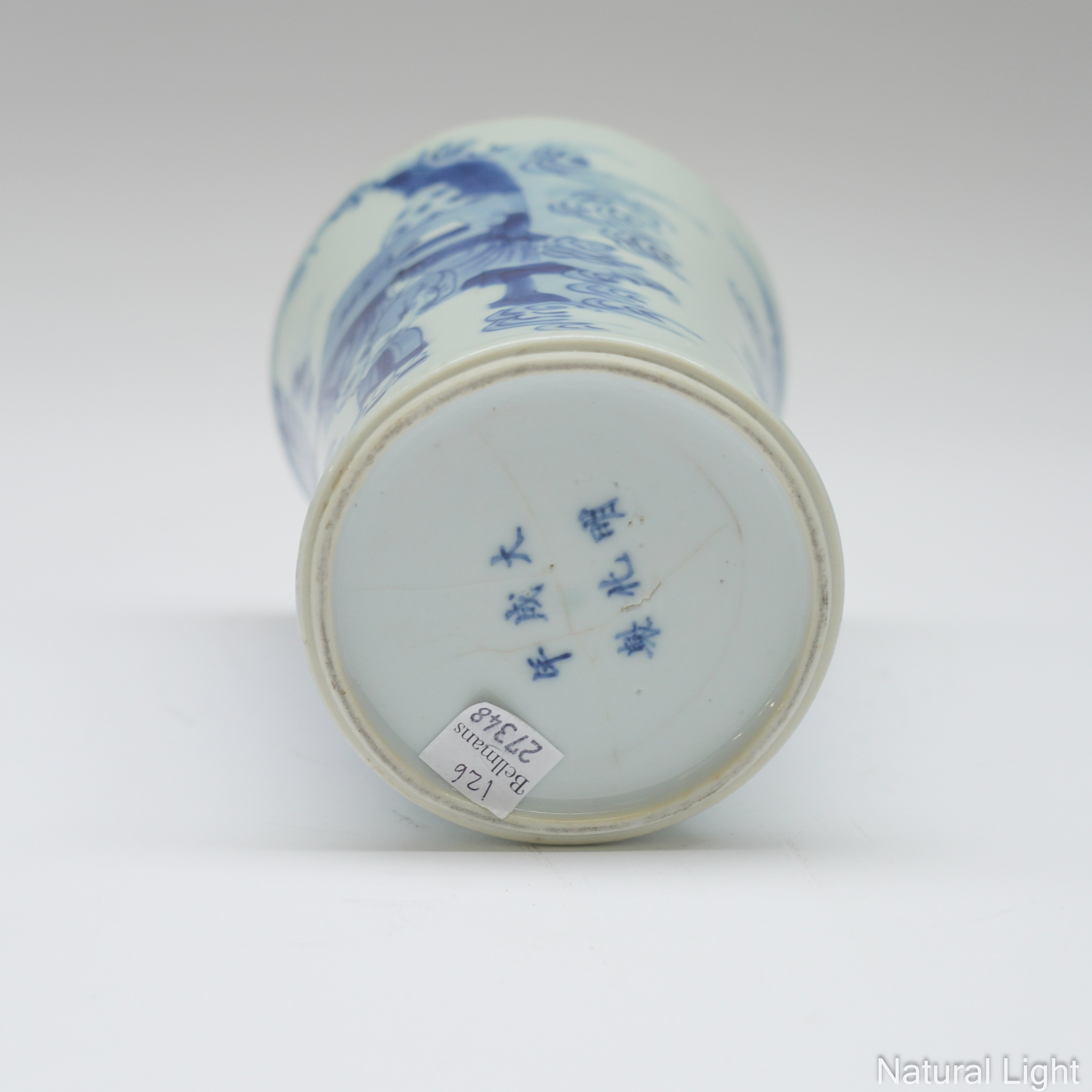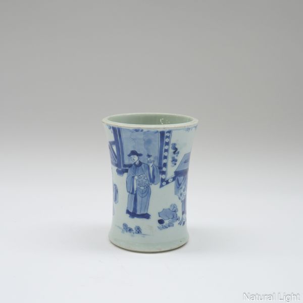 Of narrow gently flared form, painted with an official and attendants, a table in the background, apochryphal six-character Chenghua mark to base, 13.5cm high