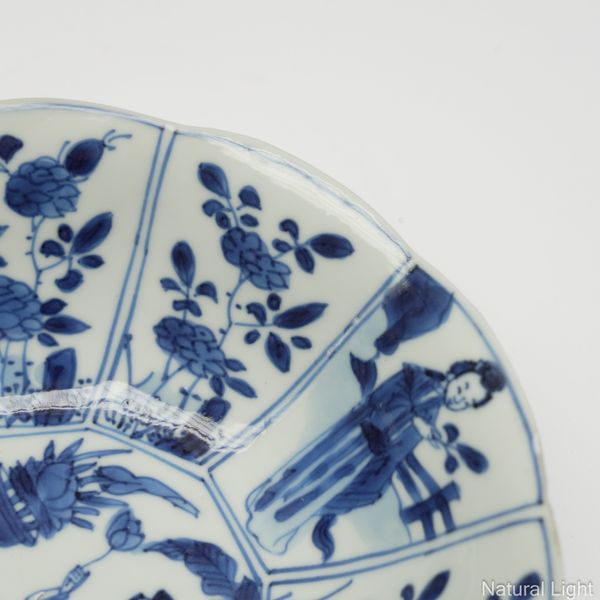 Decorated with panels of flowers and butterflies, the base marked yu (jade) within a double ring cartouche, 13cm diameter; together with a pair of late Qing Dynasty Kangxi Revival Kraak type plates decorated with panels of figures and flowers, the base marked yu within a double ring cartouche, 15cm diameter