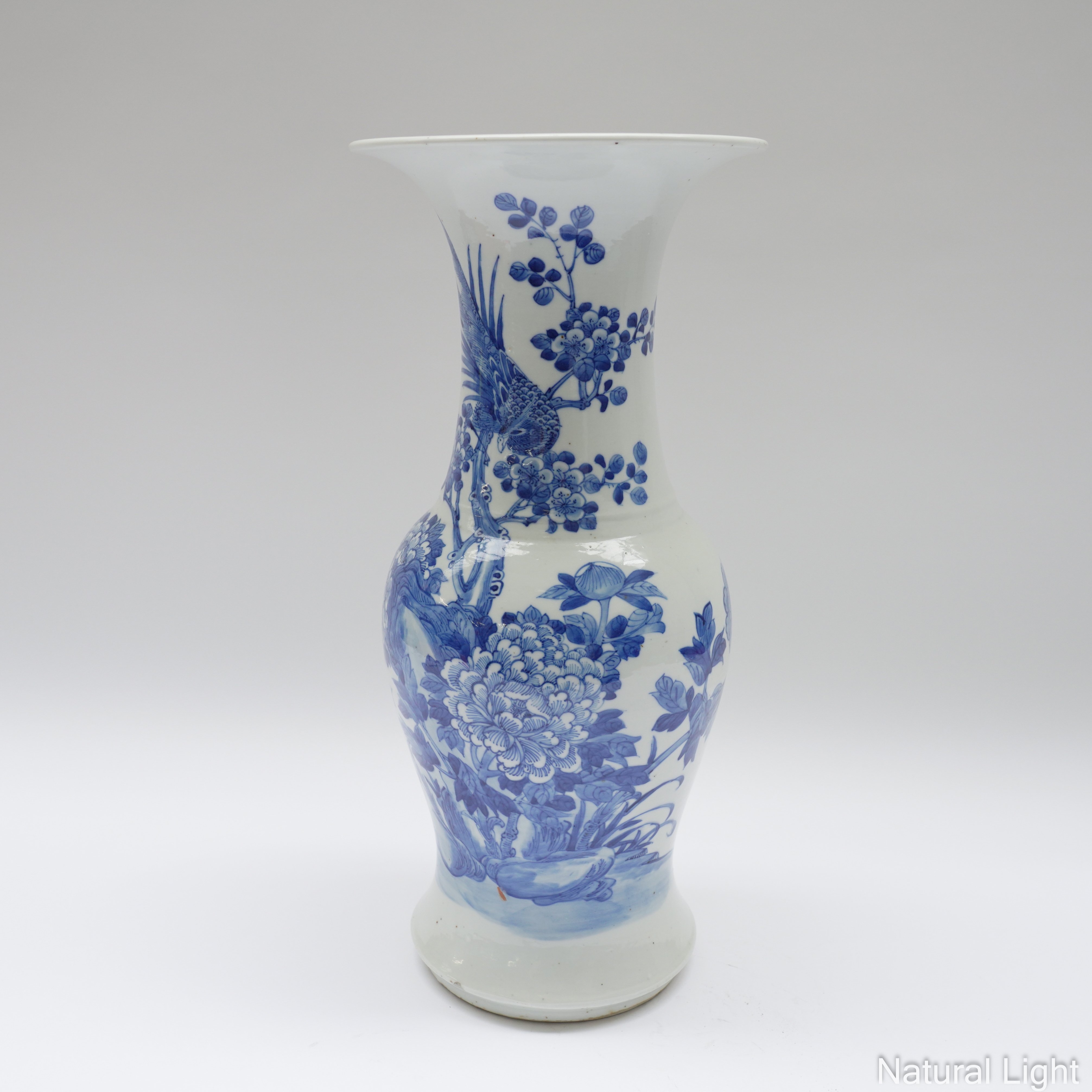 Painted with a pheasant perched on branches of flowering prunus blossom above rocks and peony, apochryphal four character Kangxi mark, 46cm high