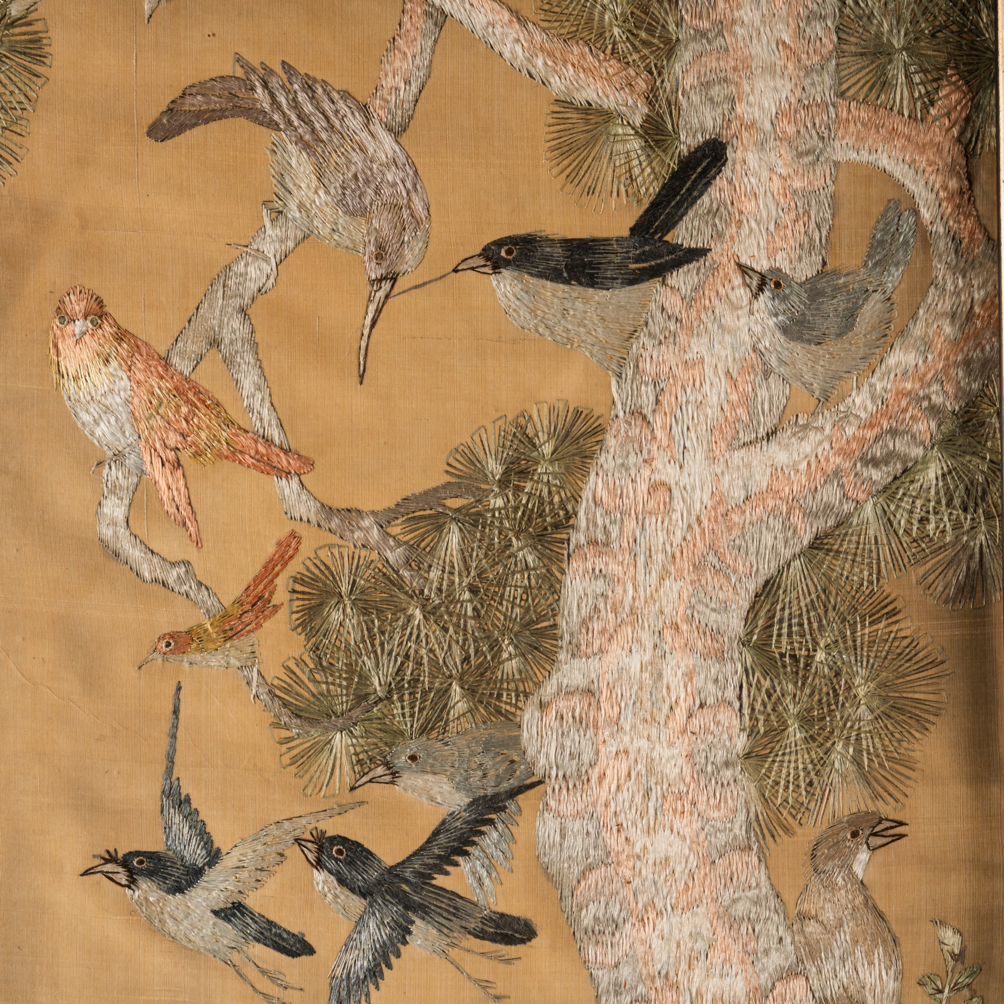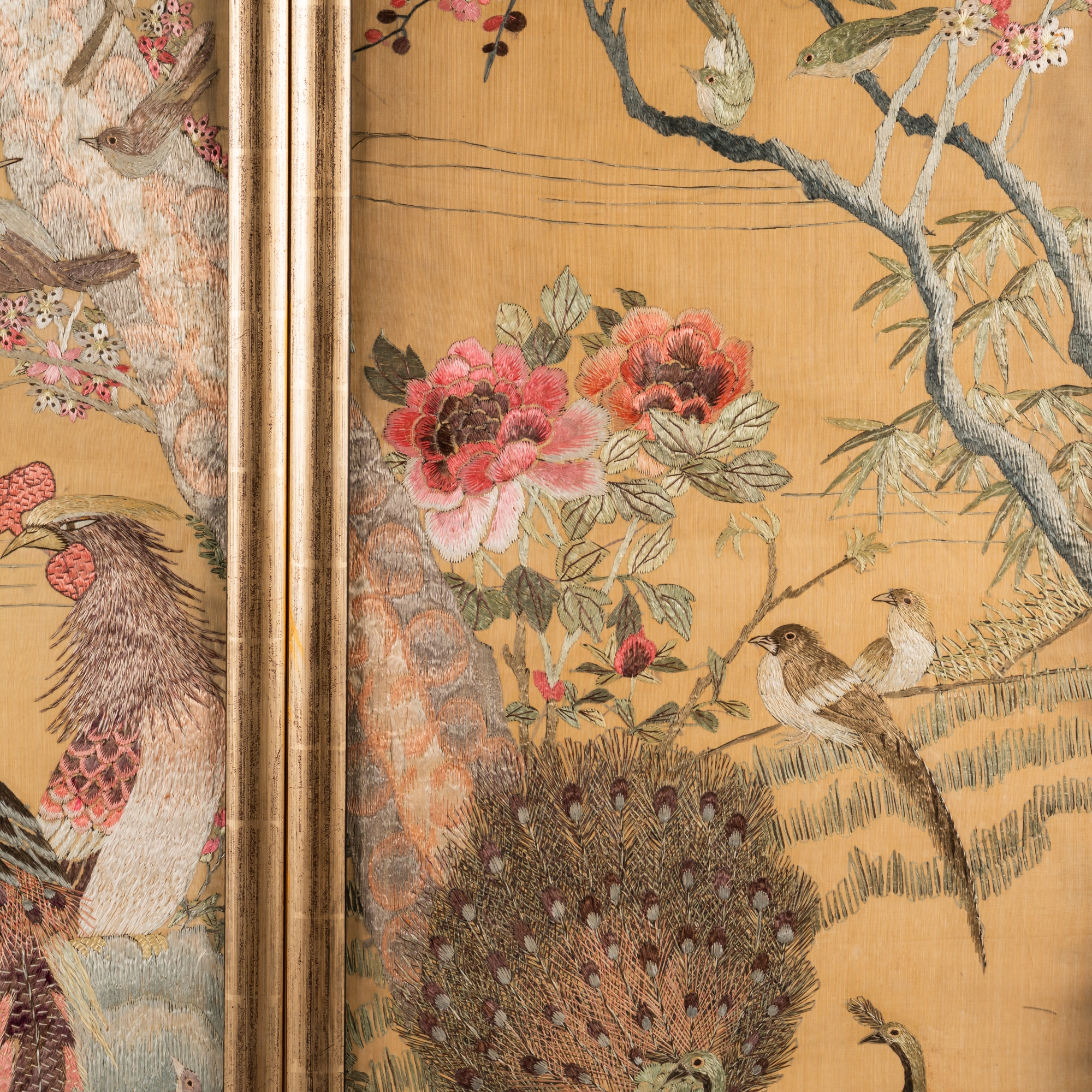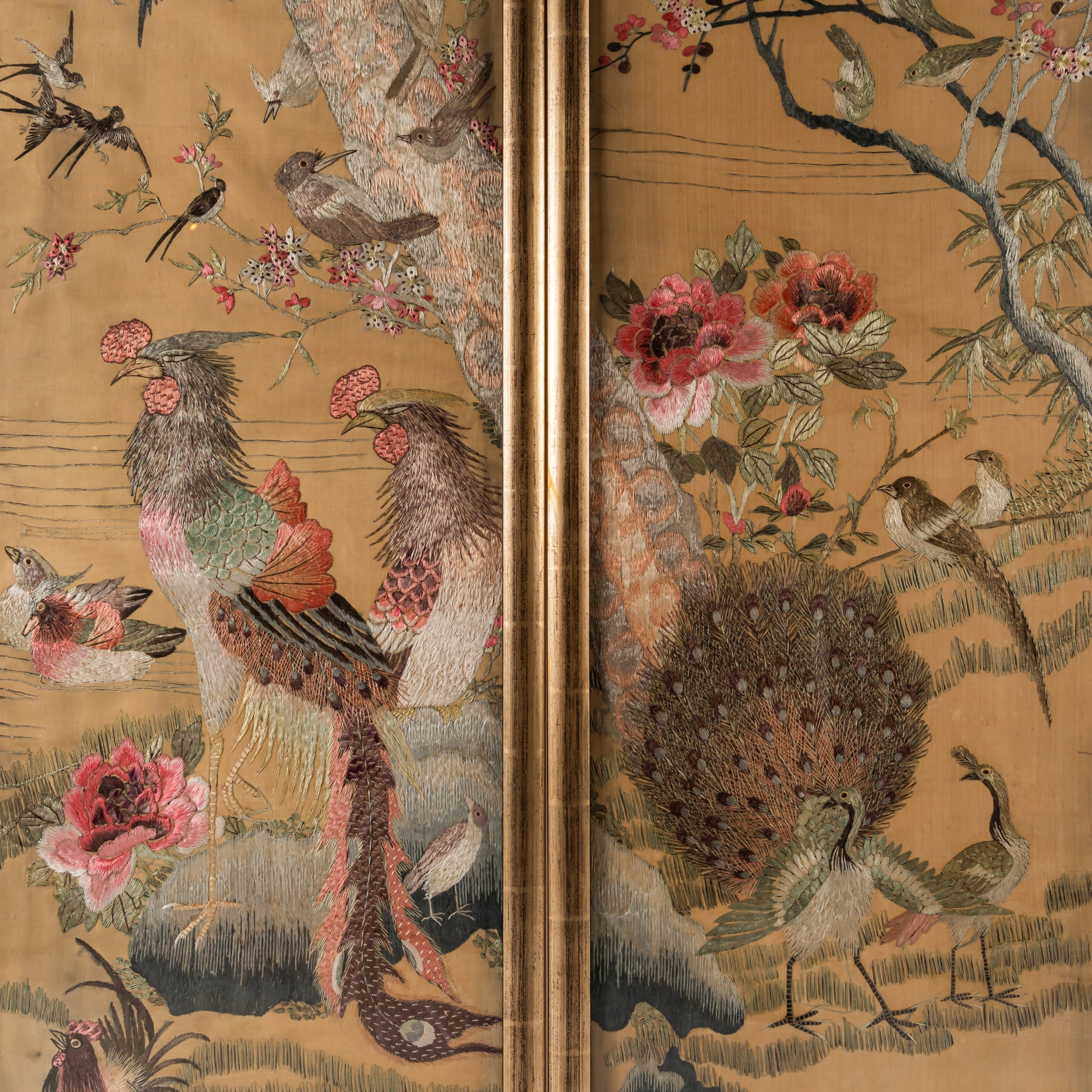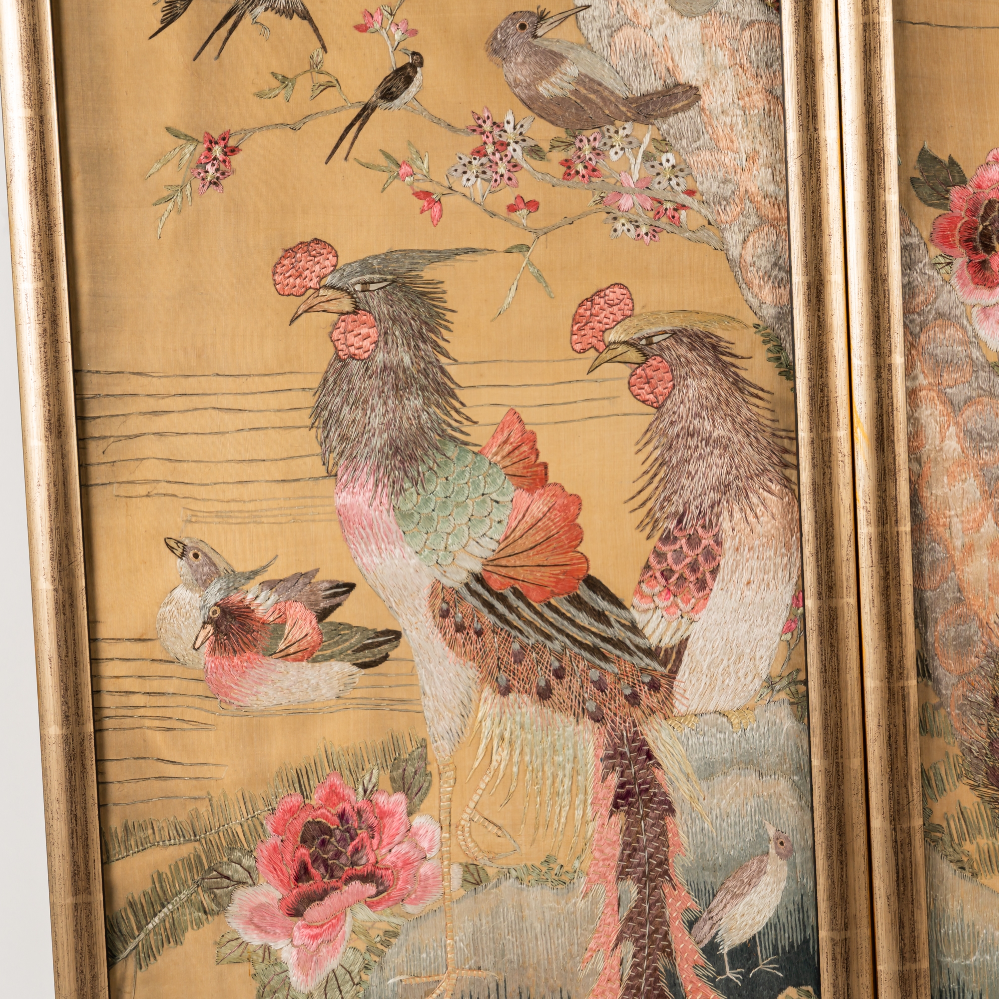 Each worked with various birds on the ground, in flowering branches and in pine trees against a gold ground, 121cm by 31cm, framed and glazed