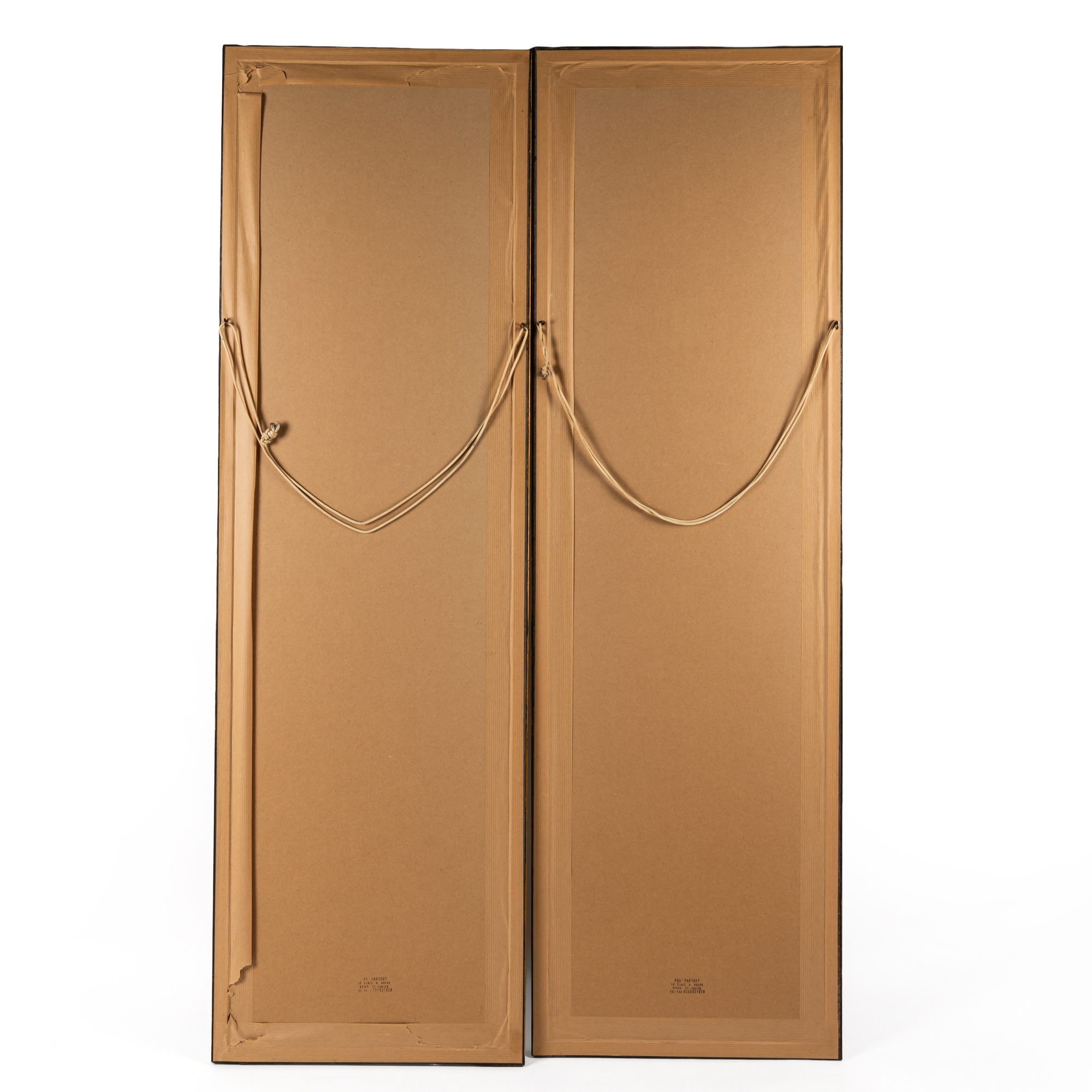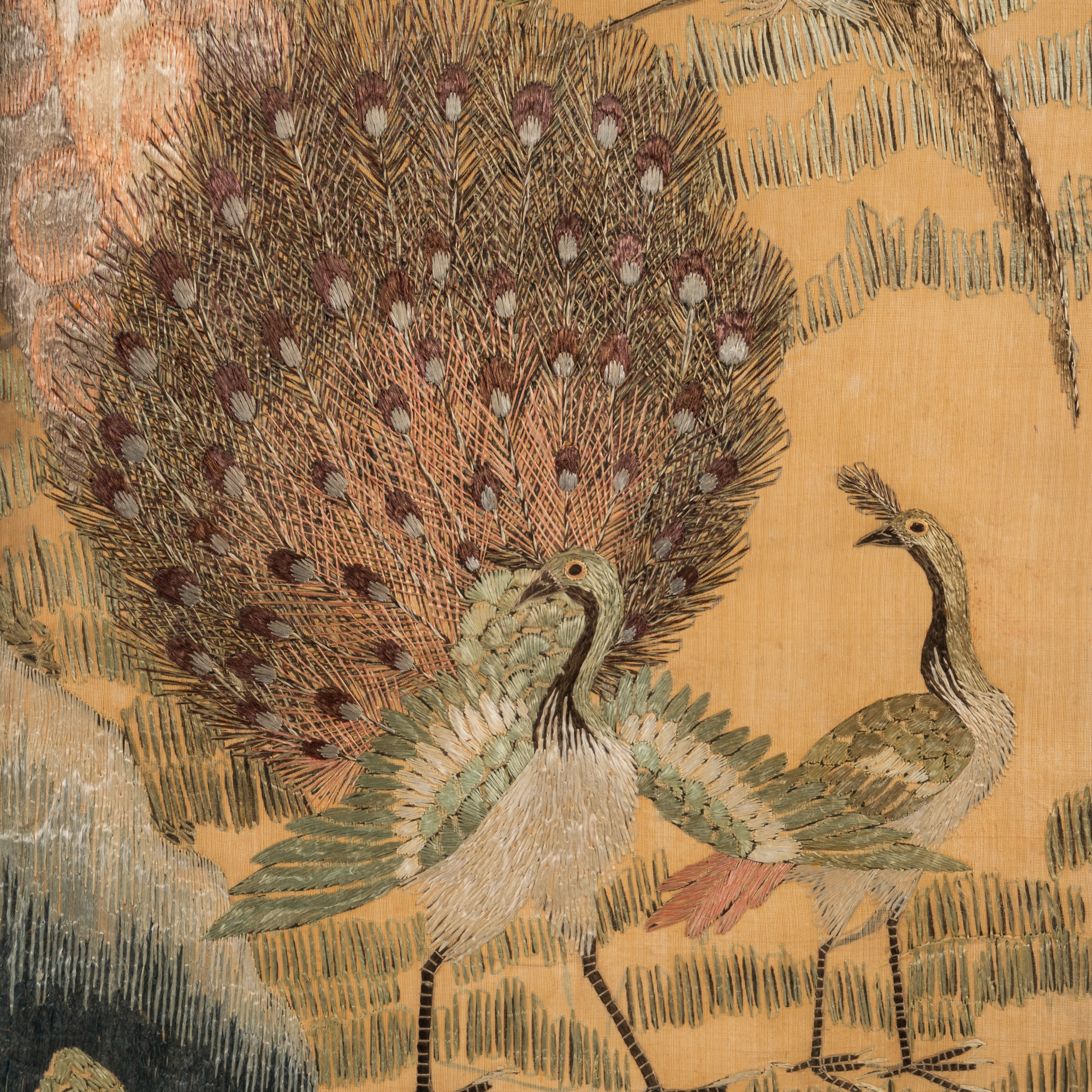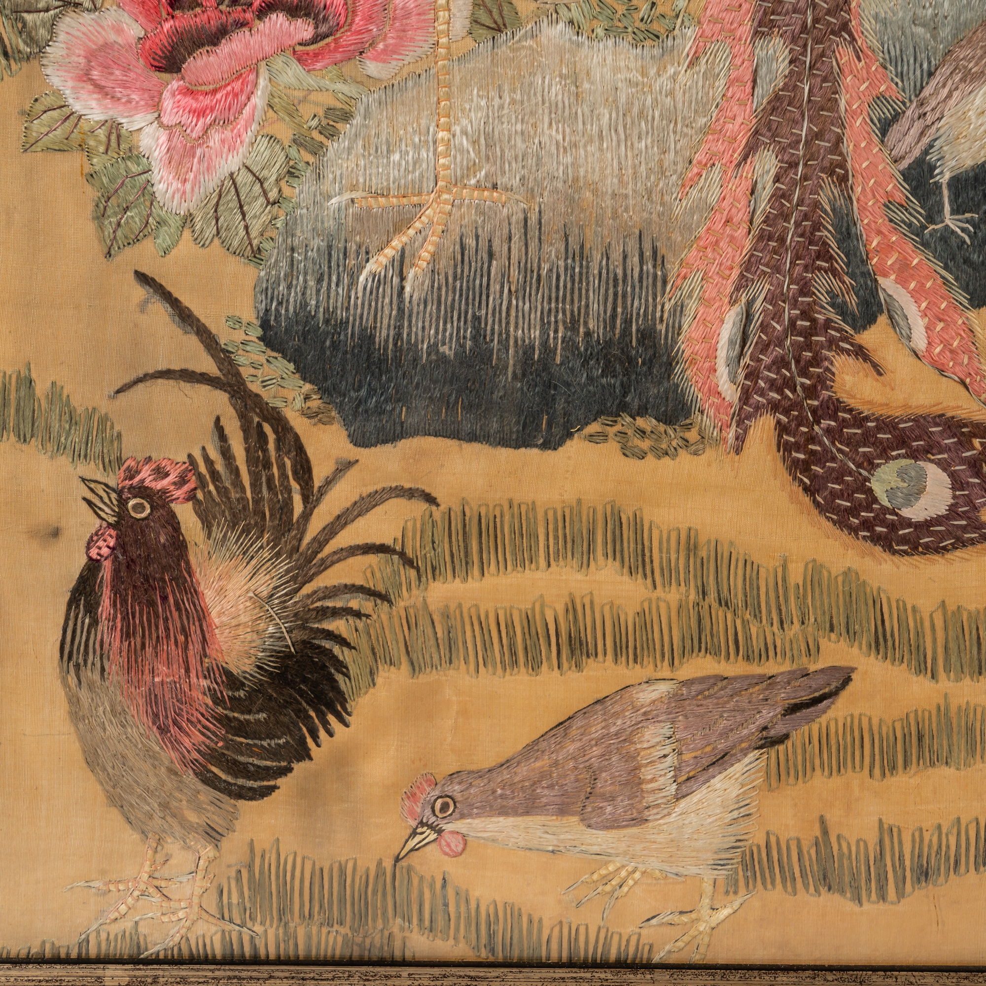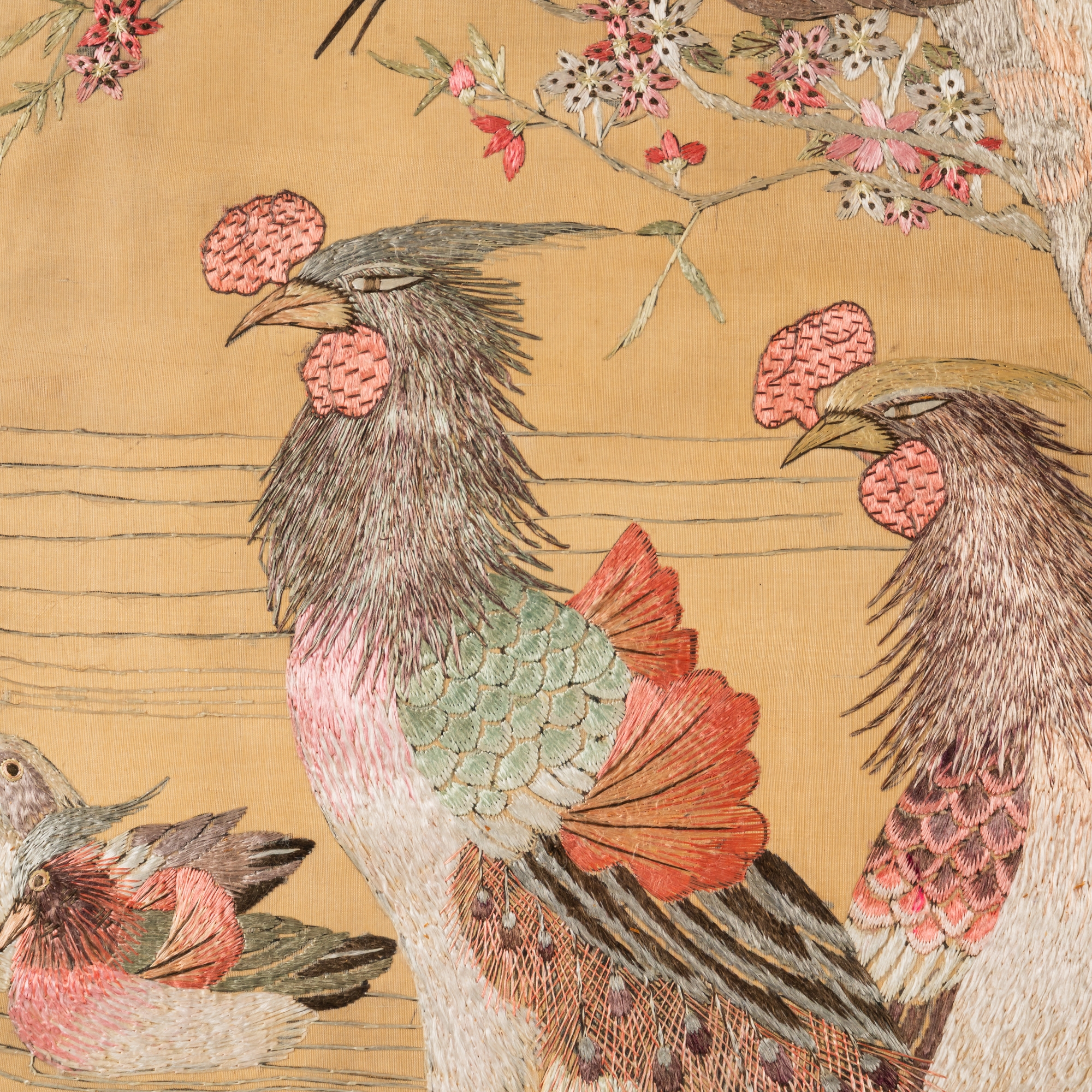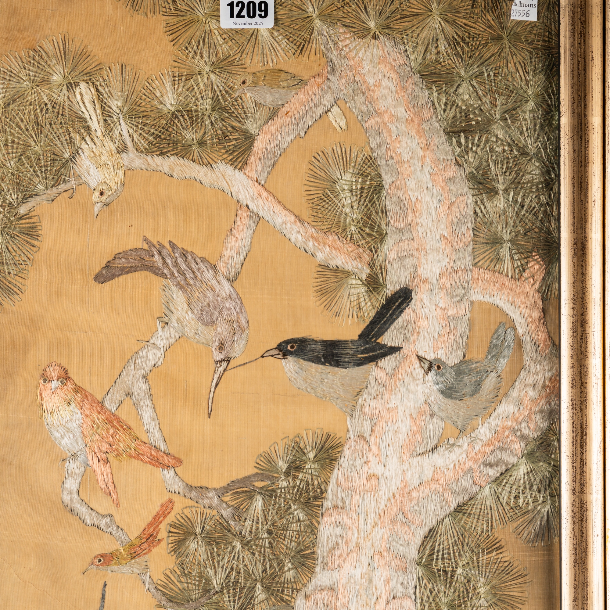 Each worked with various birds on the ground, in flowering branches and in pine trees against a gold ground, 121cm by 31cm, framed and glazed