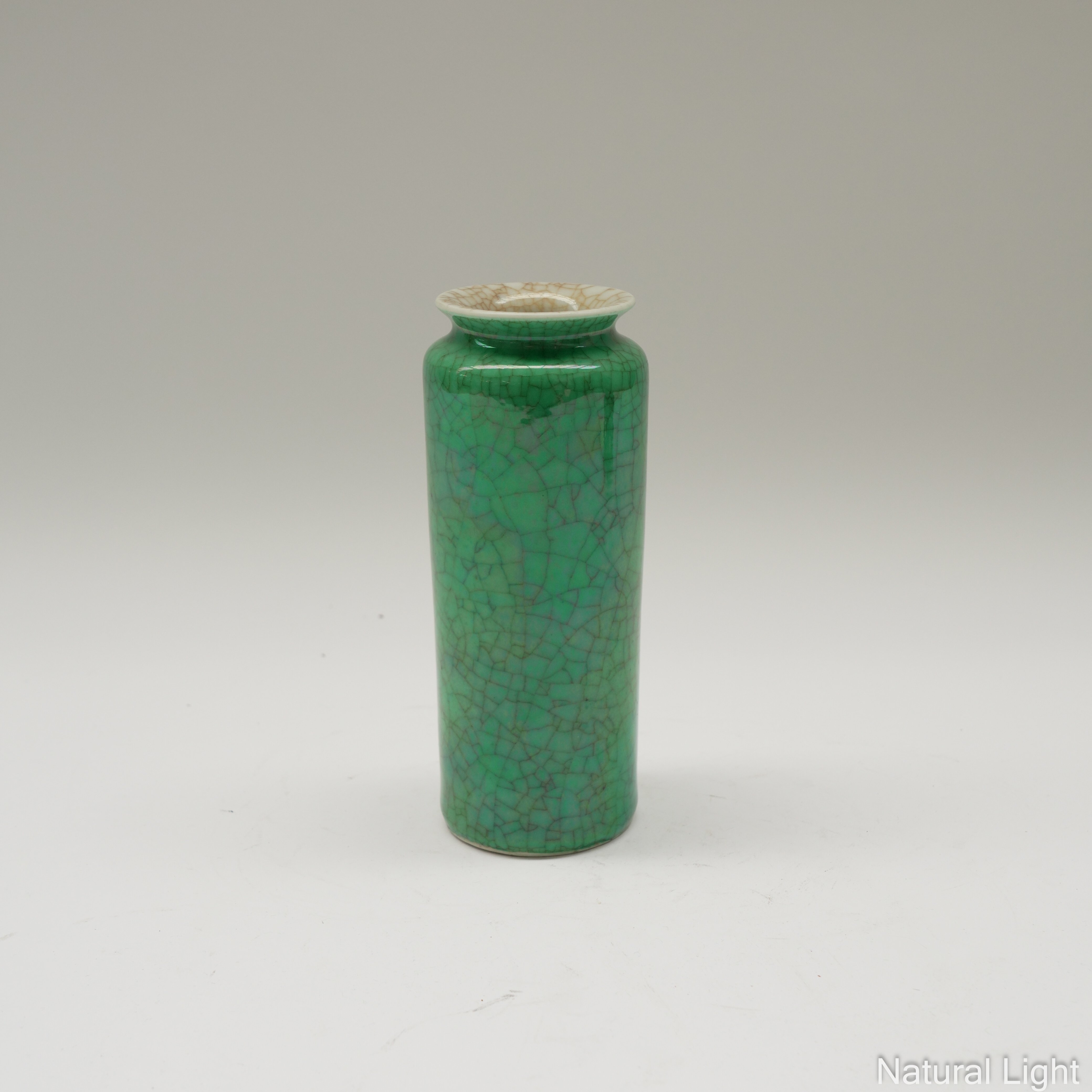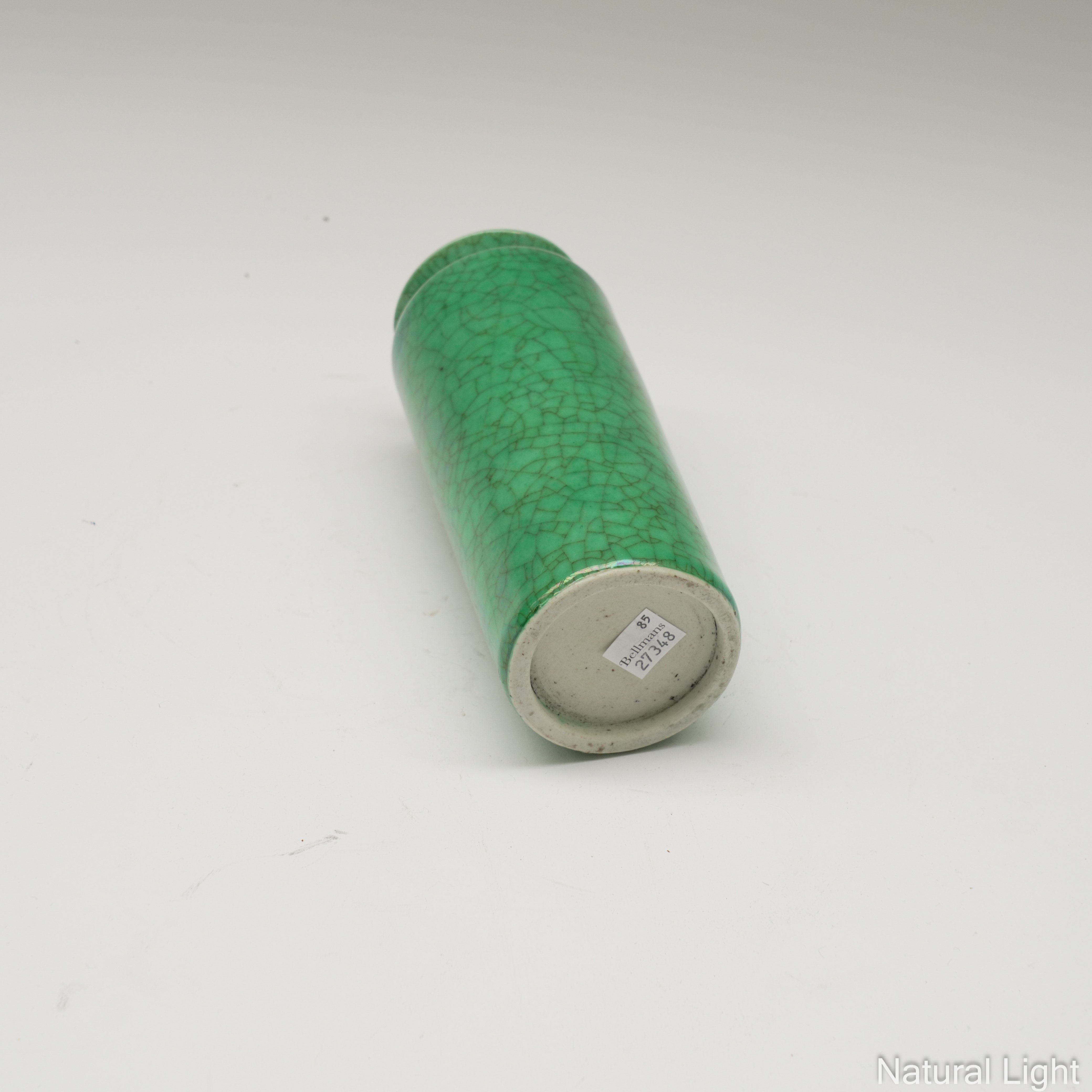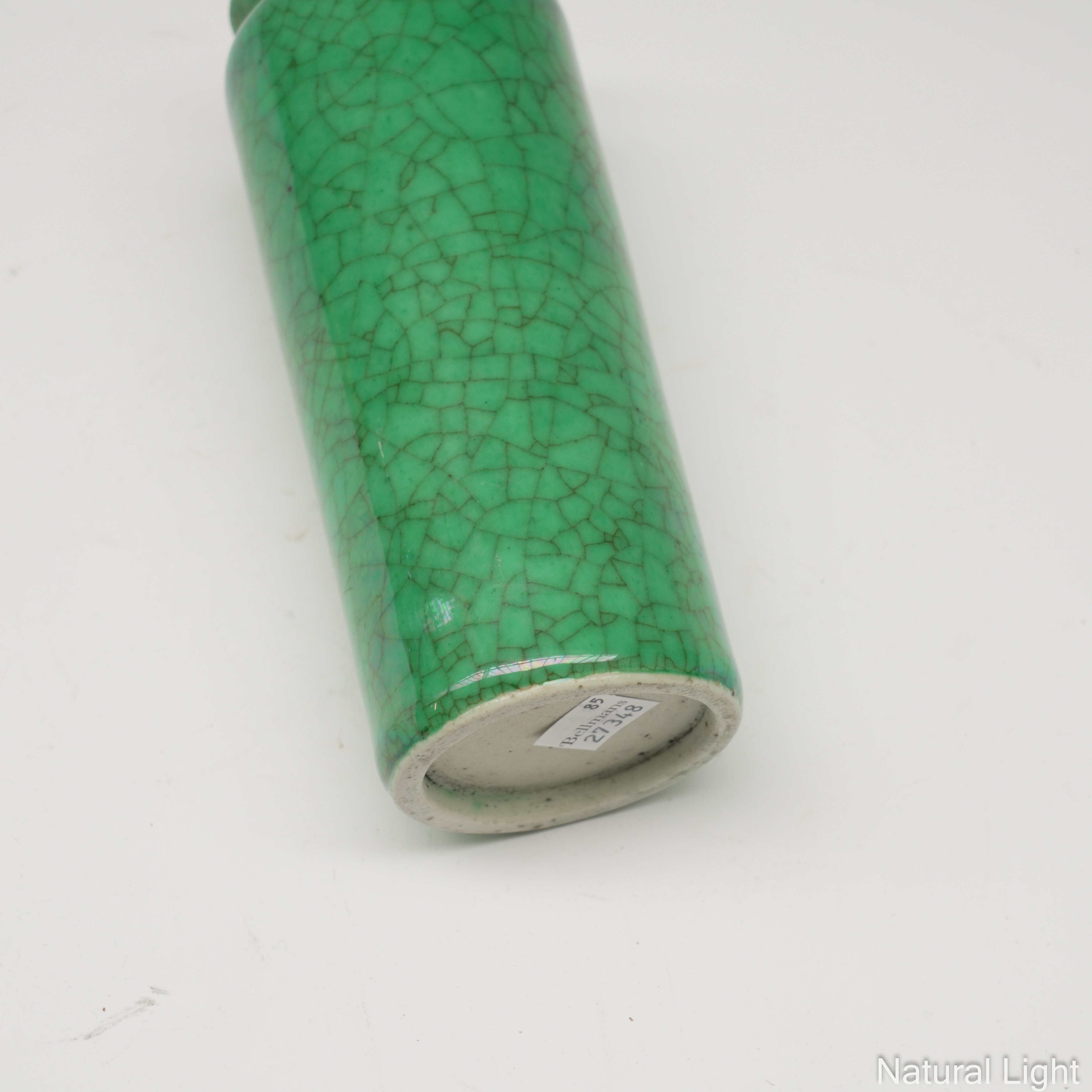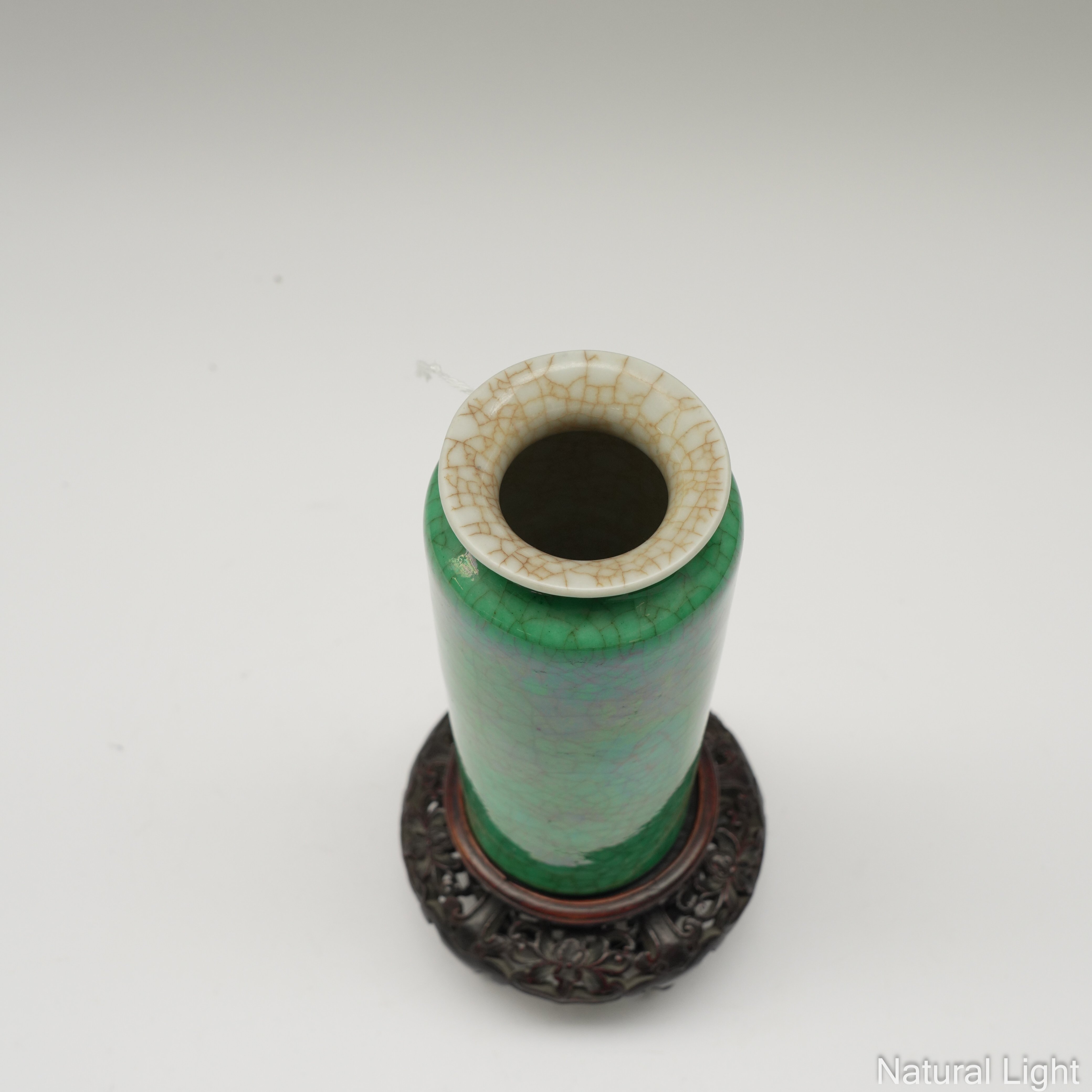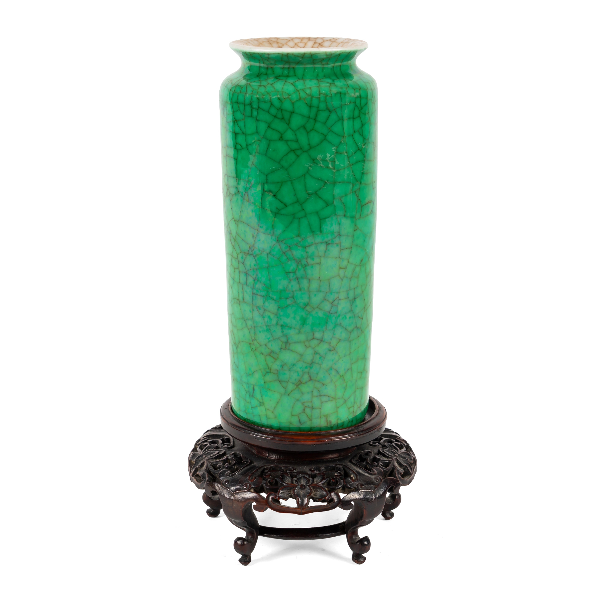 Monochrome green, of cylindrical form with flared mouth, 18cm high, carved hardwood stand