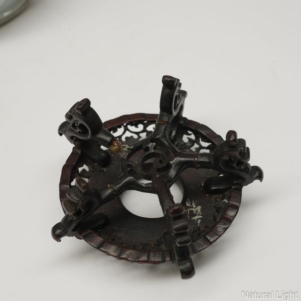 Small glaze chip to the rim, wear commensurate with age. Stand with glued repairs.