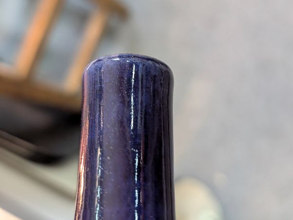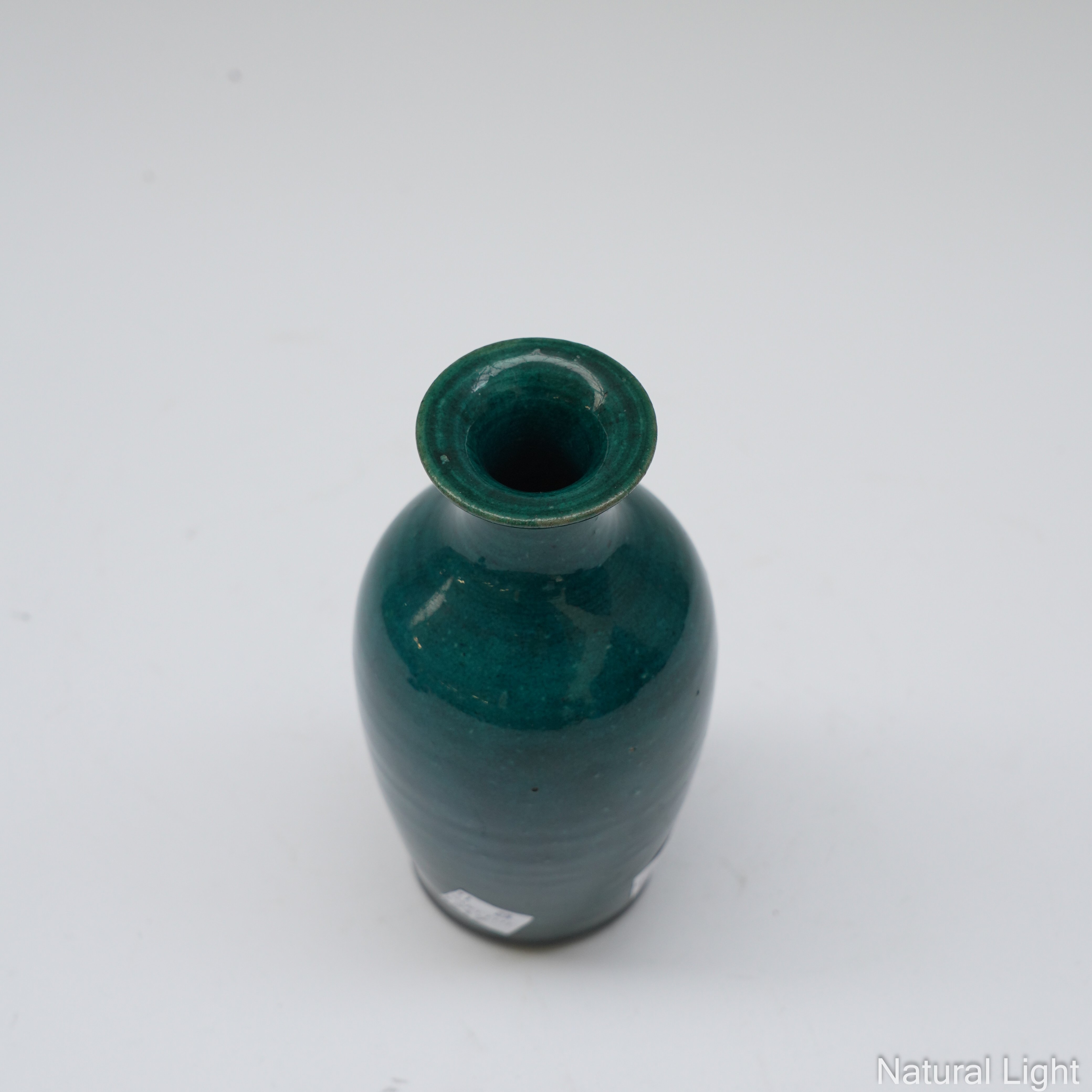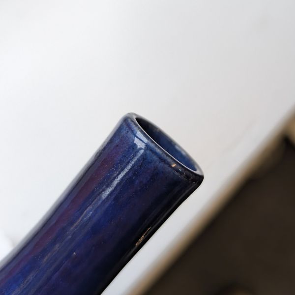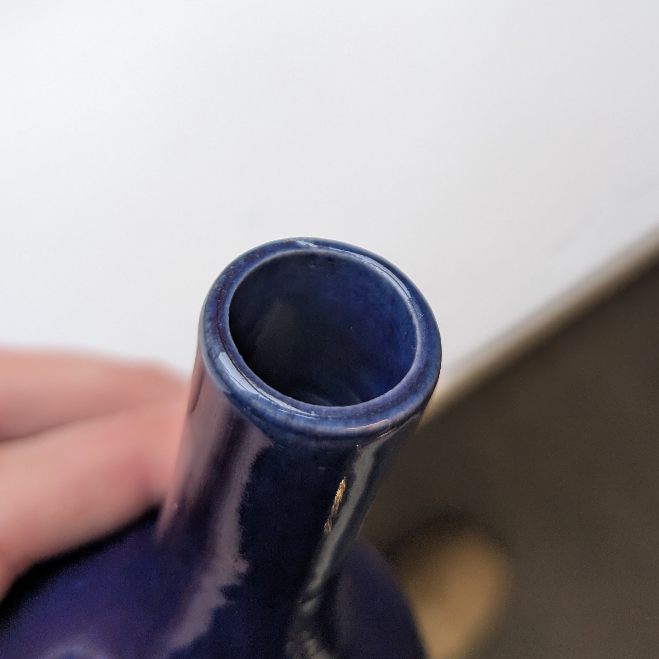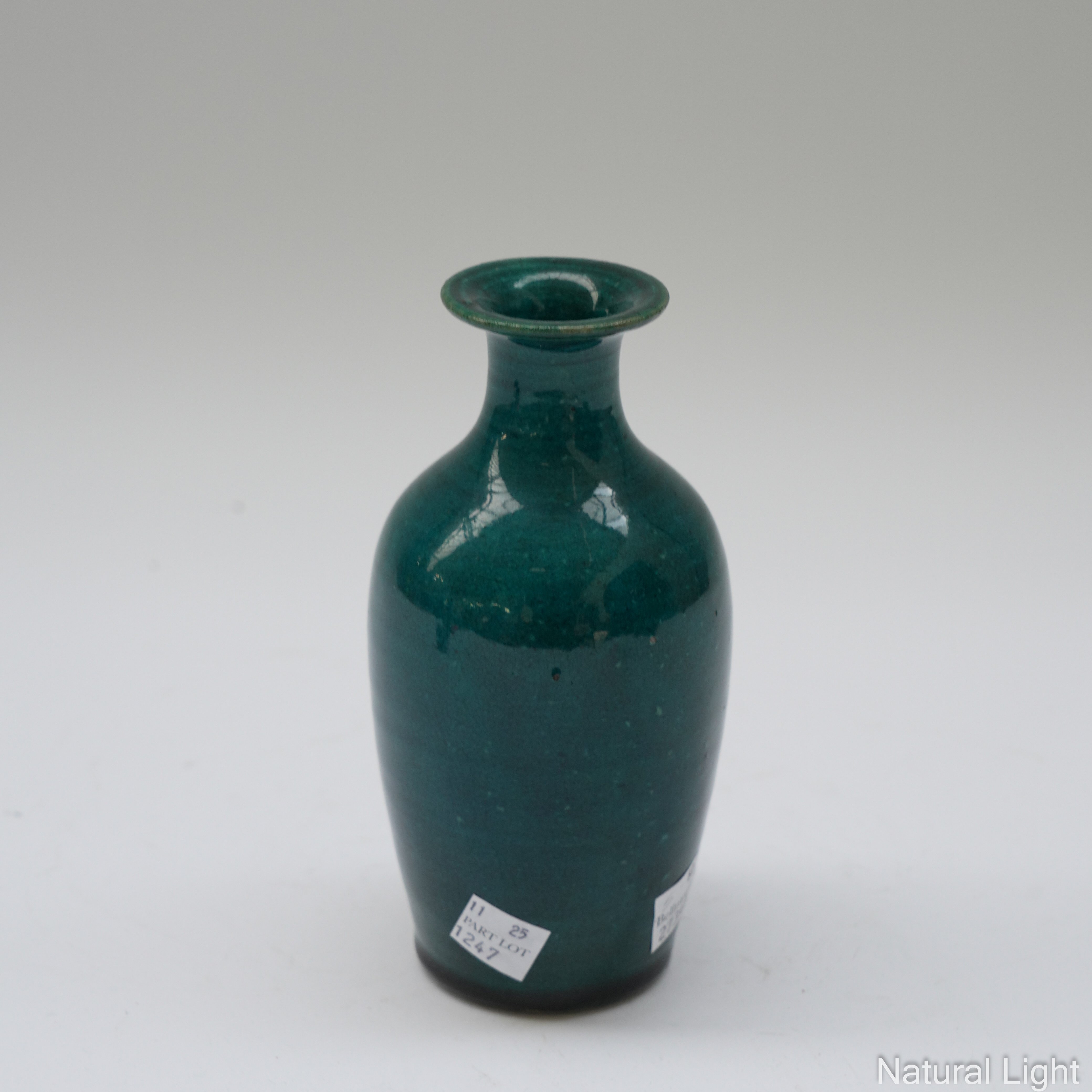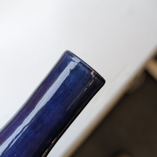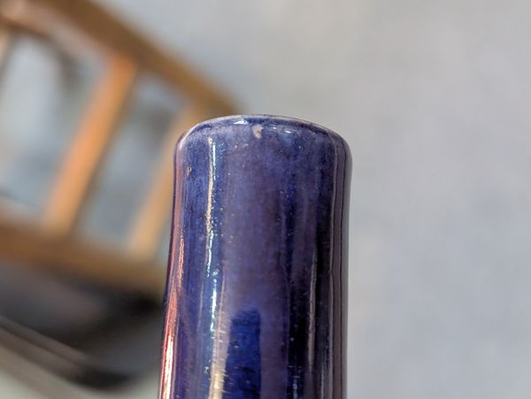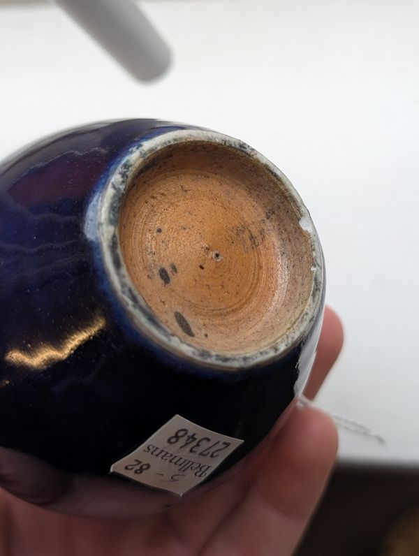 The turquoise vase with a glued break to the rim. Otherwise in overall good condition