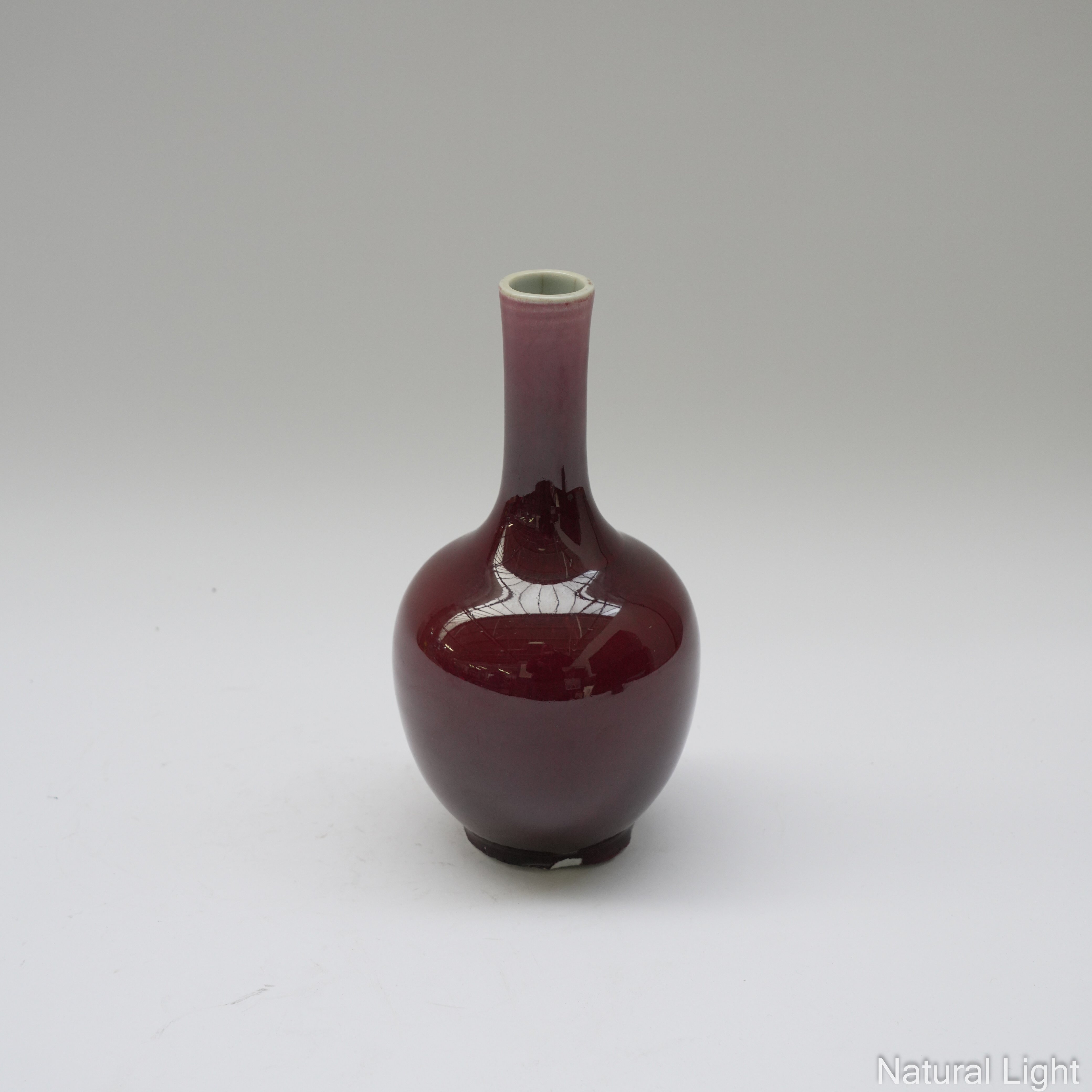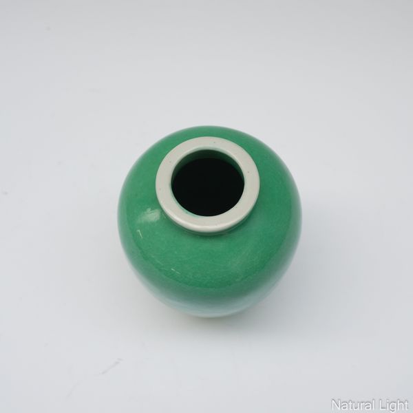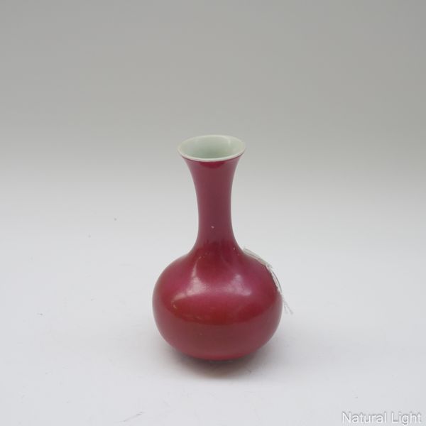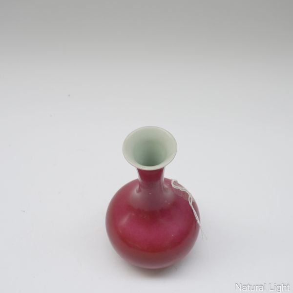 The langyao vase with some chipping/losses around the foot. The fuchsia vase with some minor glaze chips to the sides. Extensive crazing to green vase, no chips, cracks or losses. The stand with some cracks in the wood.