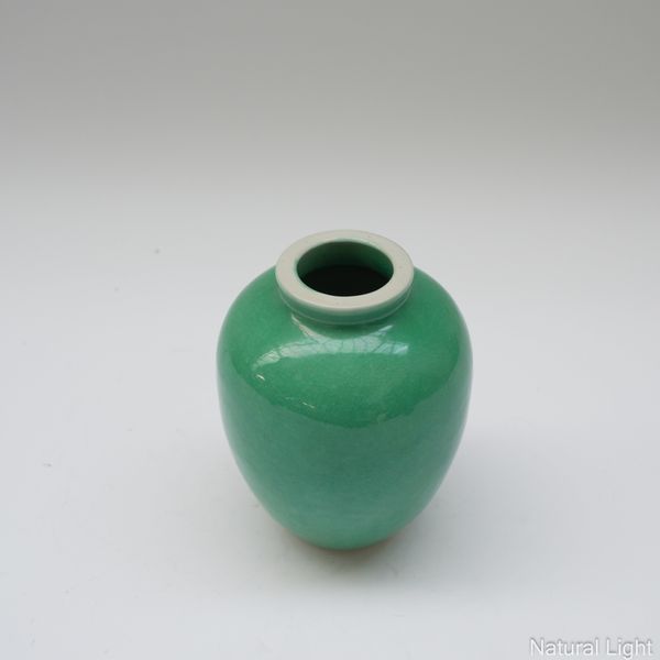 Green, with carved hardwood stand, together with a Langyao or oxblood/sang de boeuf bud form vase, and a fuchsia monochrome vase, tallest 22.5cm