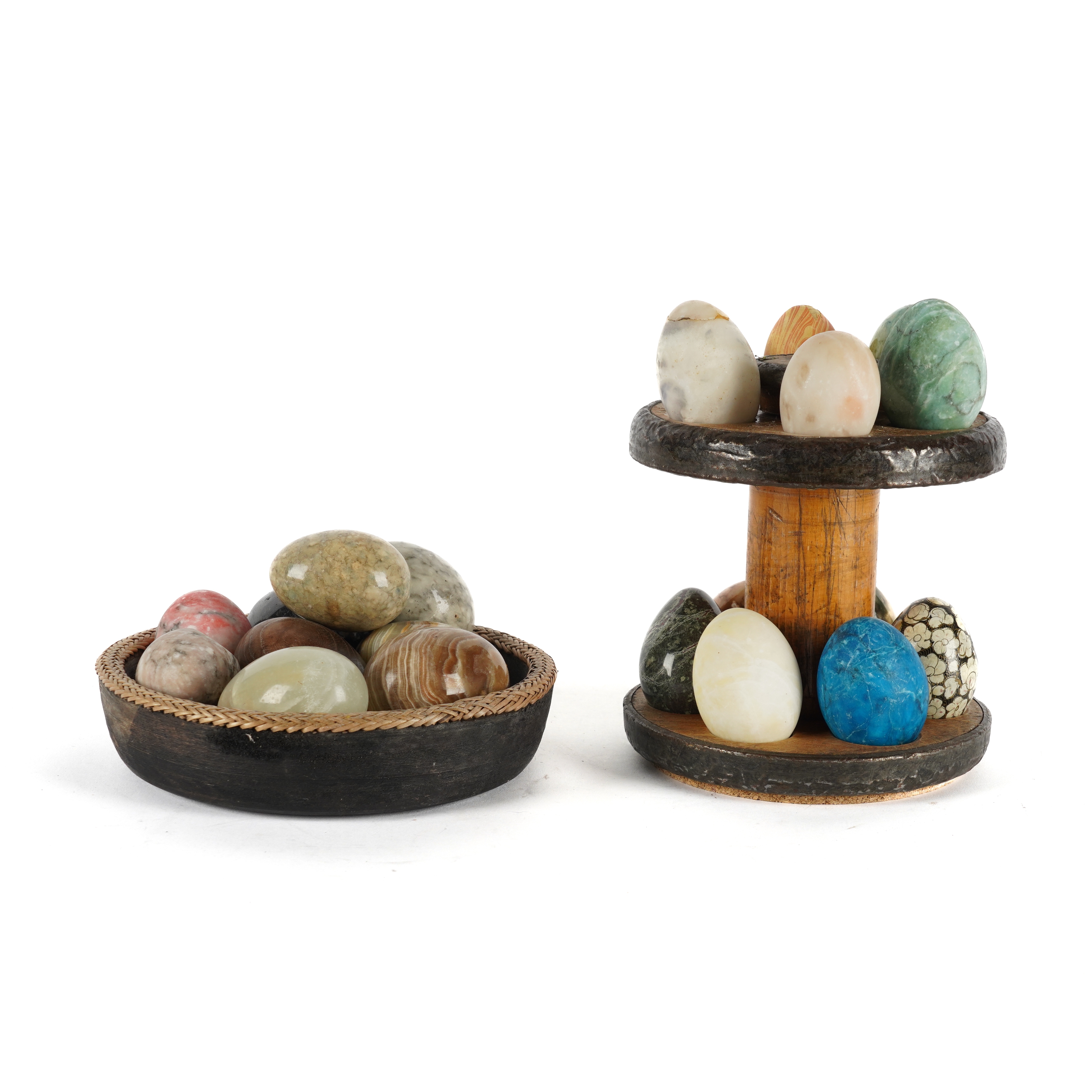 Comprising twenty-one variously sized eggs, including jade, wood and banded agate, contained within a two-tiered stand and a bowl, the blue egg 7cm high, the stand 18cm high