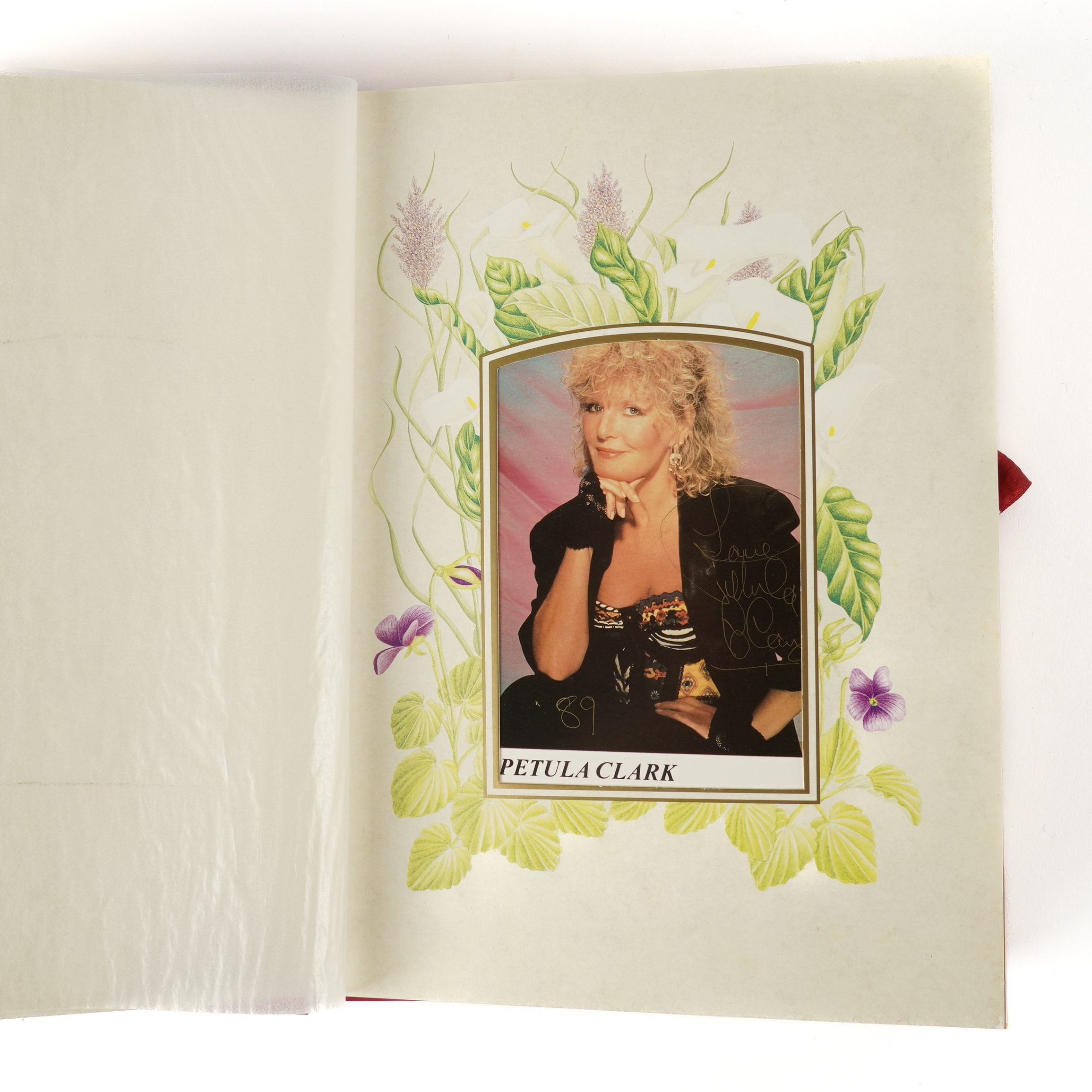 The vintage autograph album containing signed photographs and dedicated autographs of numerous actors and performers, including Petula Clark, John Derek, Lloyd Bridges, Van Johnson, and others, with several personalised inscriptions and publicity stills, mounted on floral pages within an album, together with two late 19th / early 20th century notebooks containing signatures and notes, both in red leather bindings