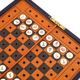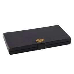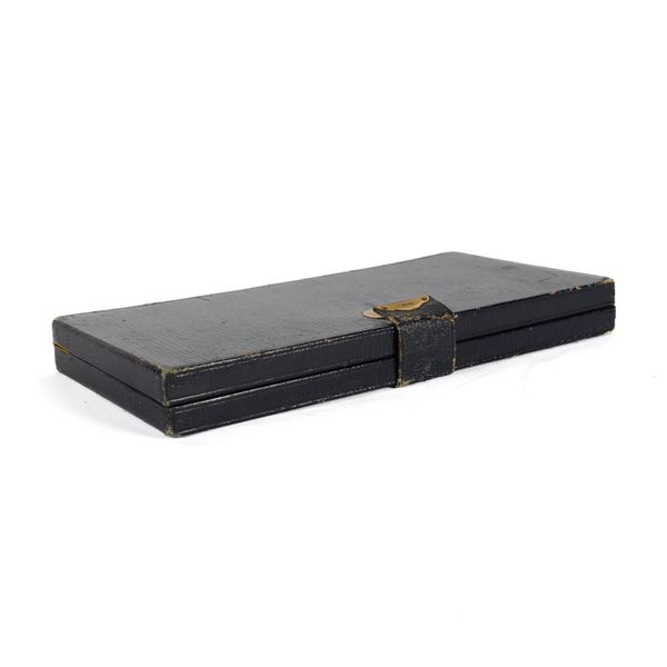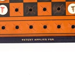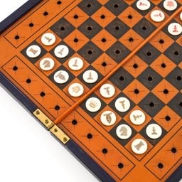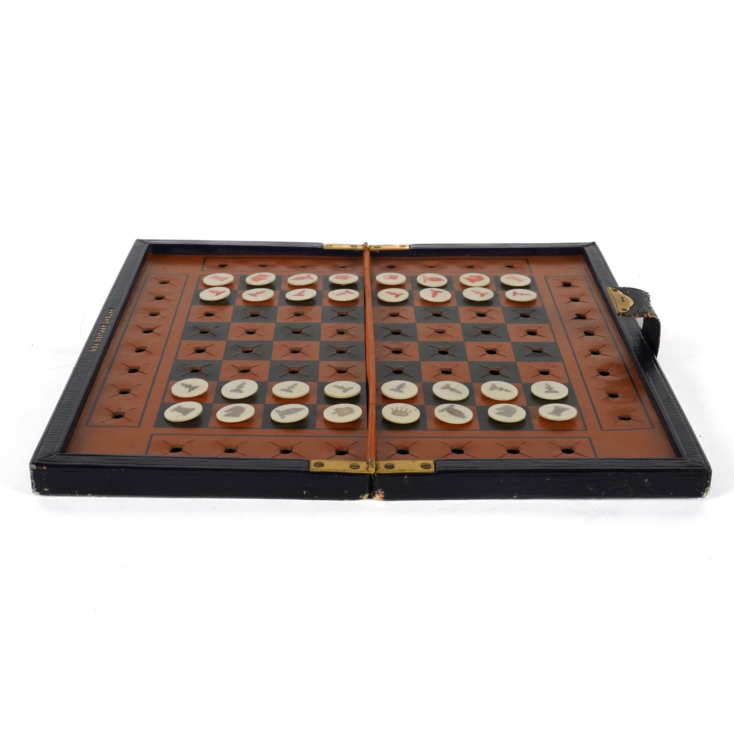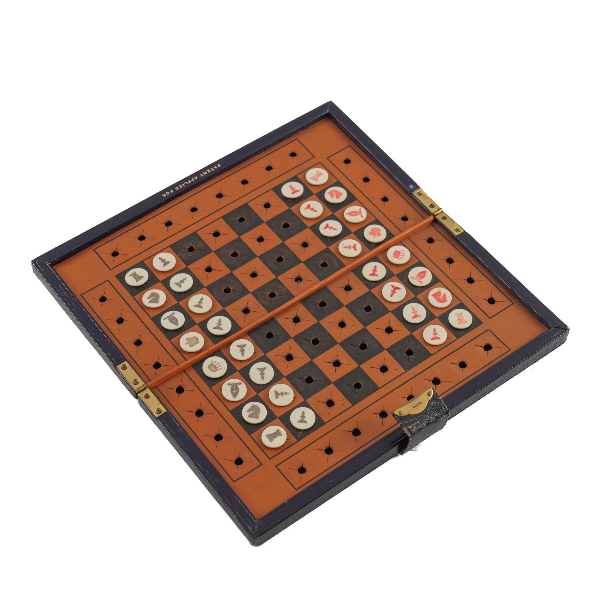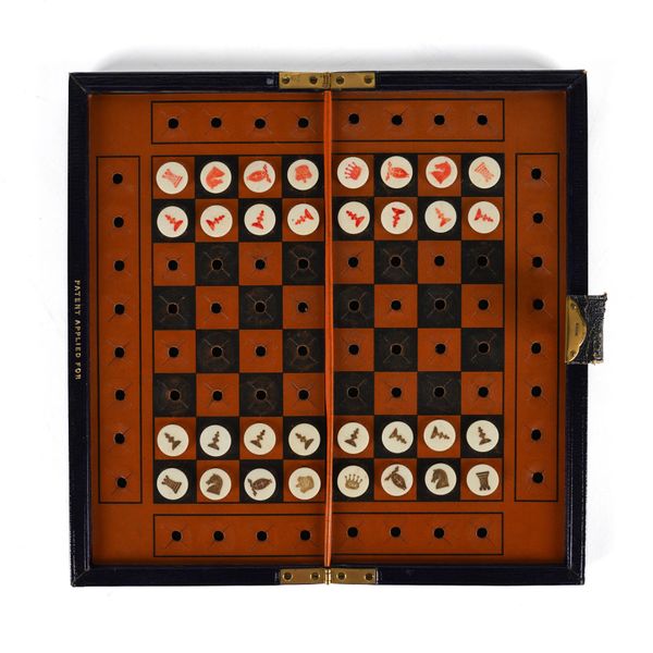 Dark blue leather folding case, with pegged button-shaped pieces, with black and red markings, reserve spaces for the captured pieces, ‘PATENT APPLIED FOR’ stamped in gilt along the rim, mount marked, case 23cm wide, 23cm deep