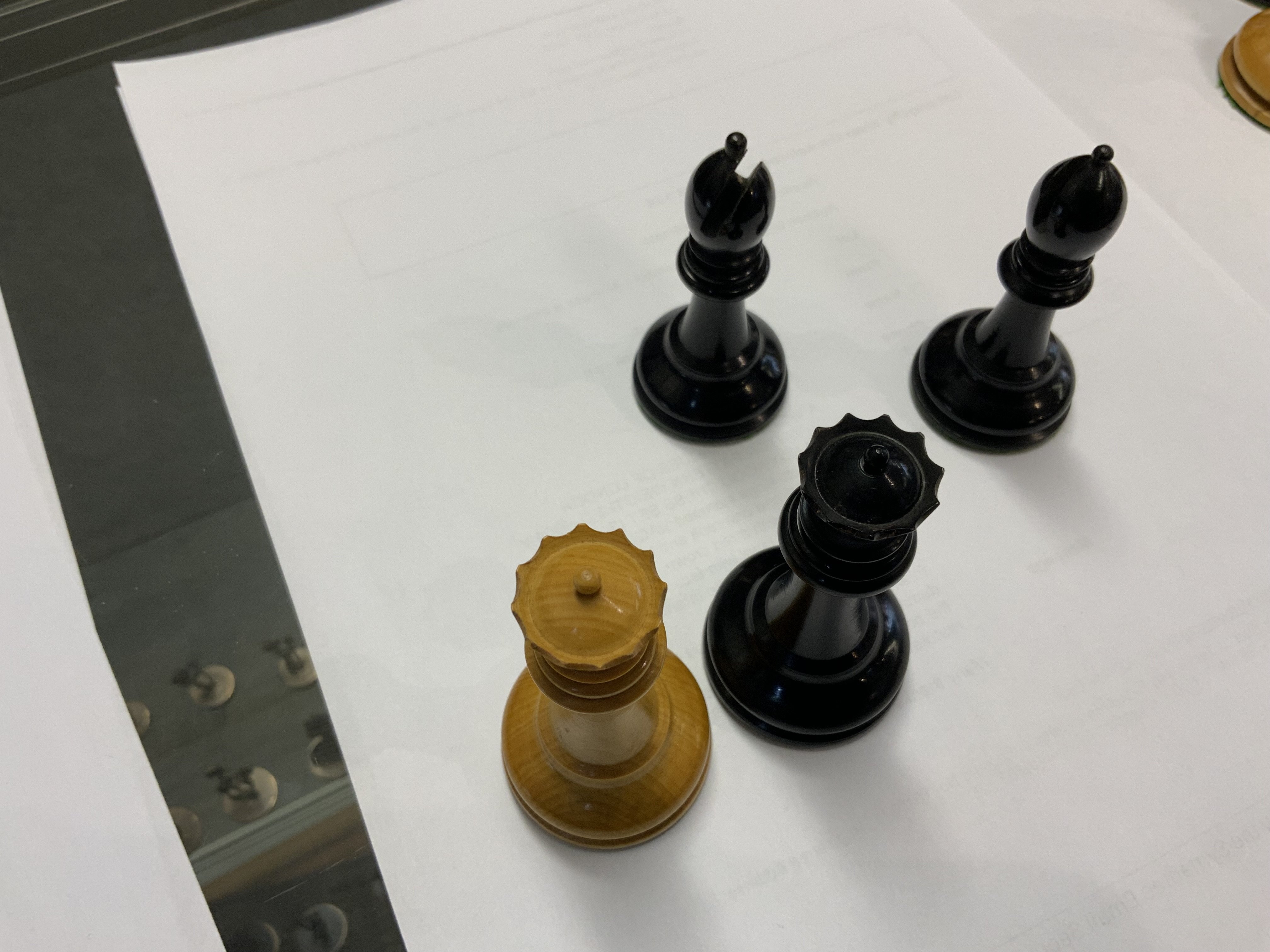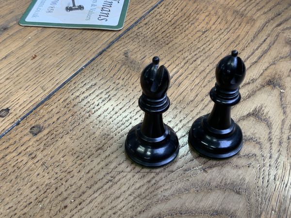The black bishops’ mitres both with a slight nick inside the mitre slit, see images, to one side.