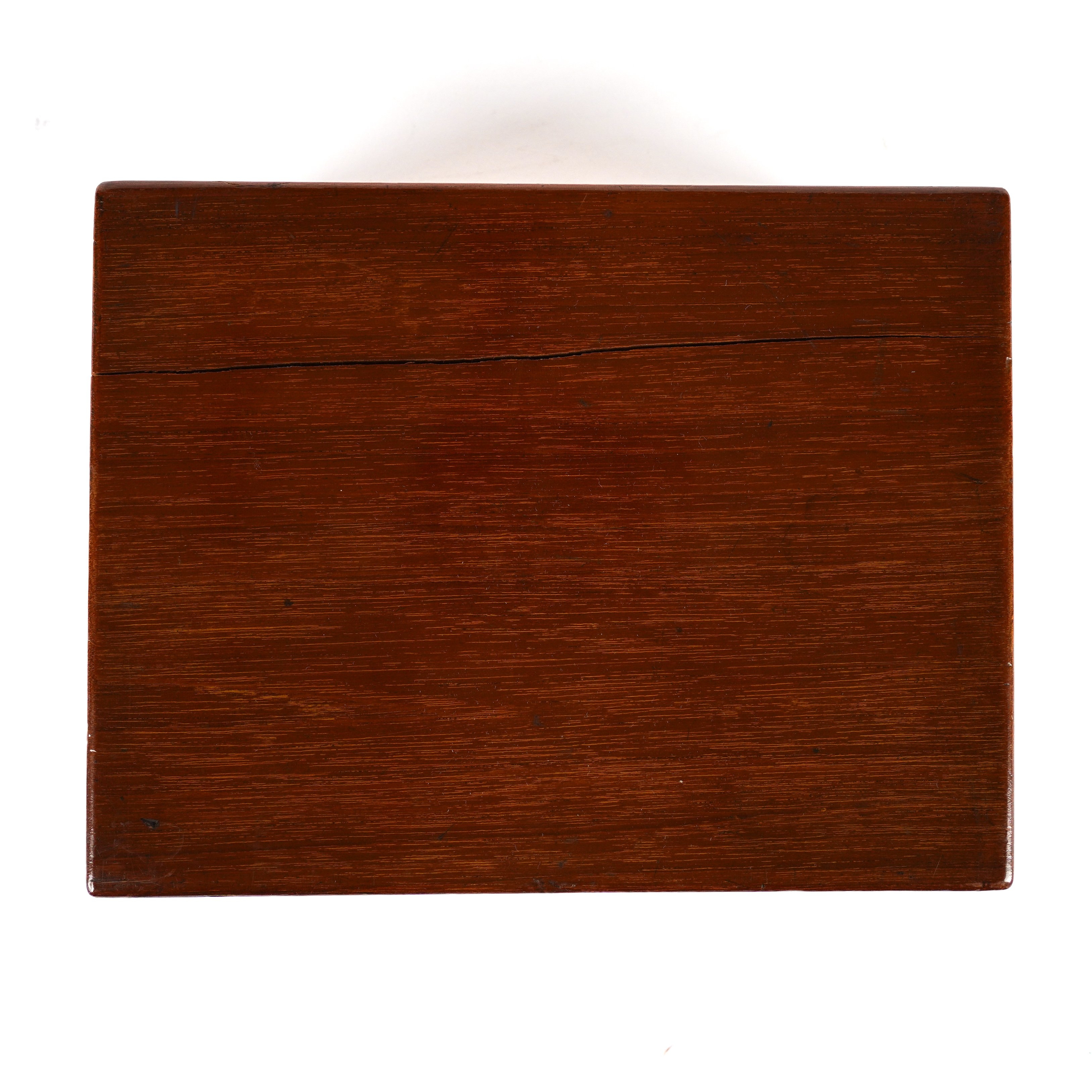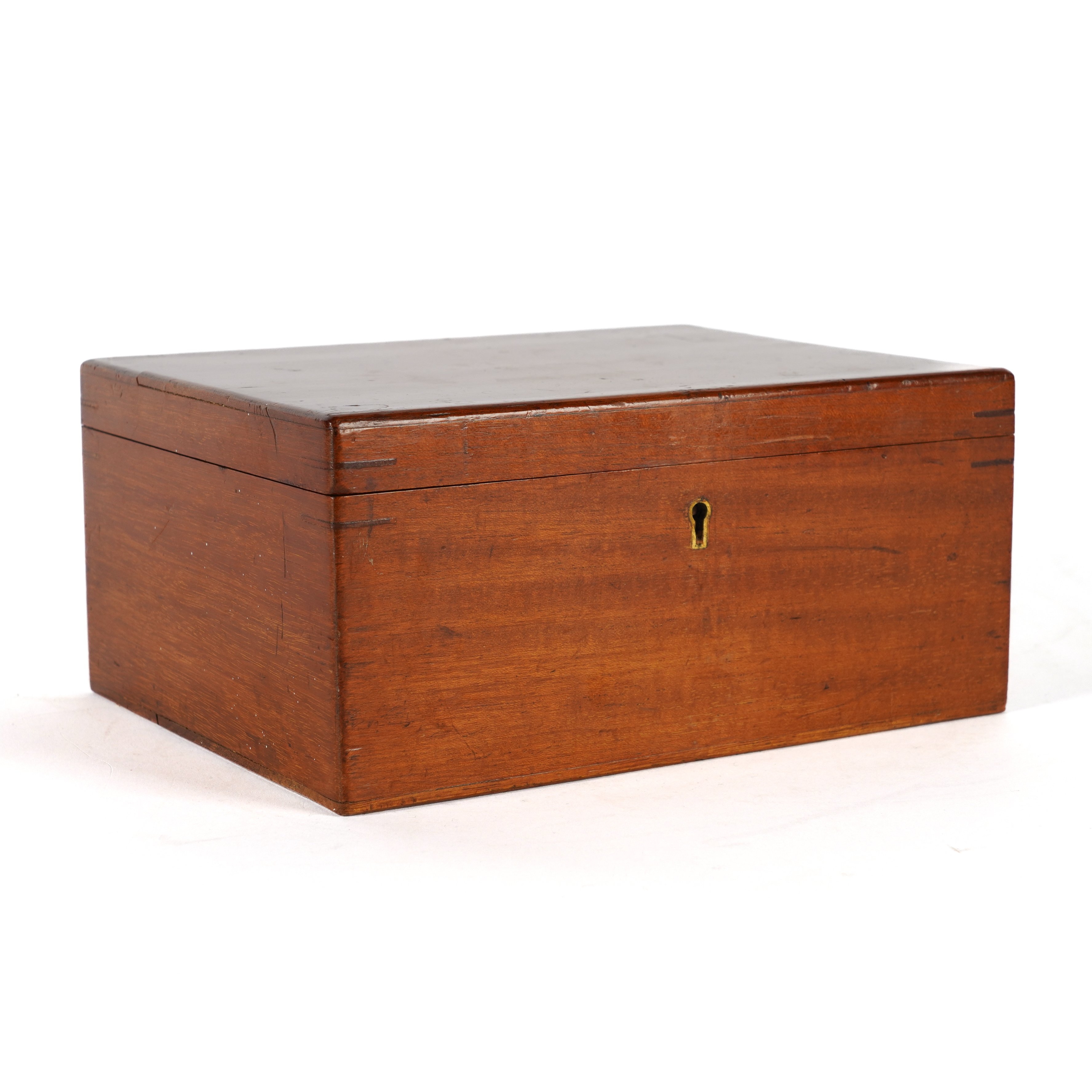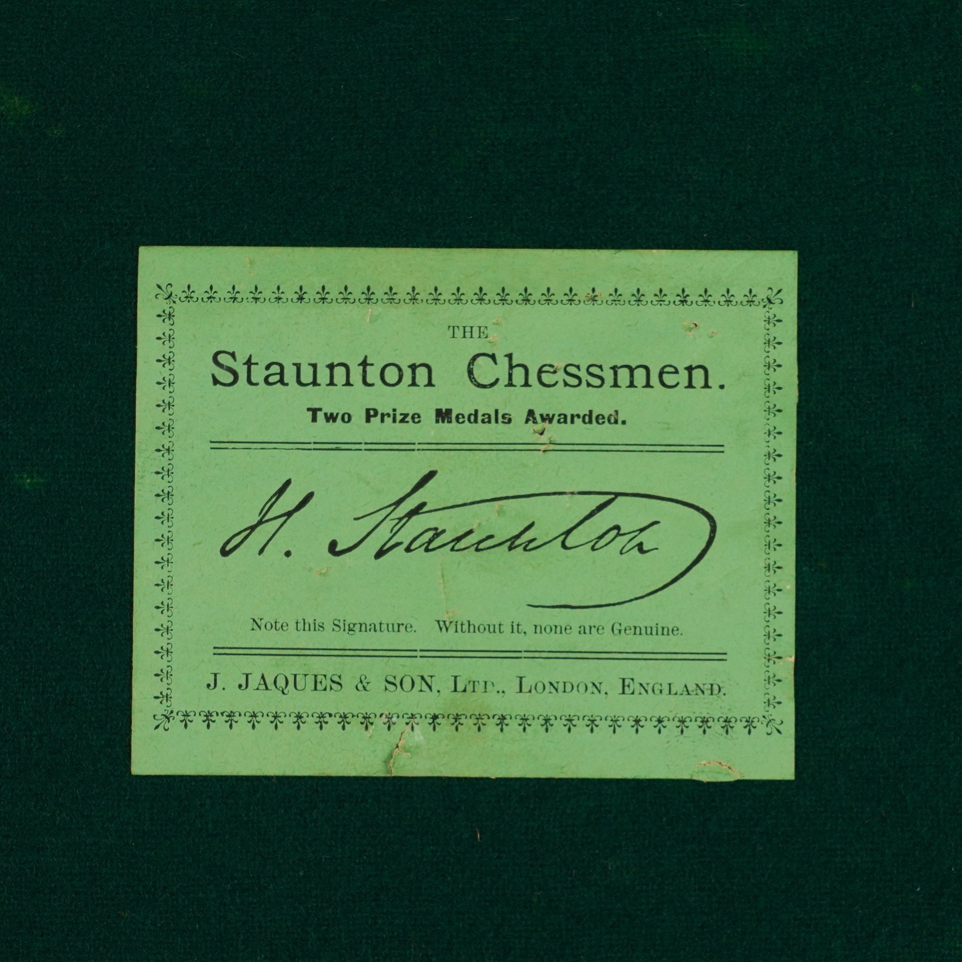 Both kings stamped ‘JAQUES LONDON’, and one rook and knight of each side marked with a red crown, the mahogany box with green label with facsimile signature of Howard Staunton to the interior lid, box - 21cm wide, the king, 9cm high, the pawn, 5cm high, with a spare black pawn