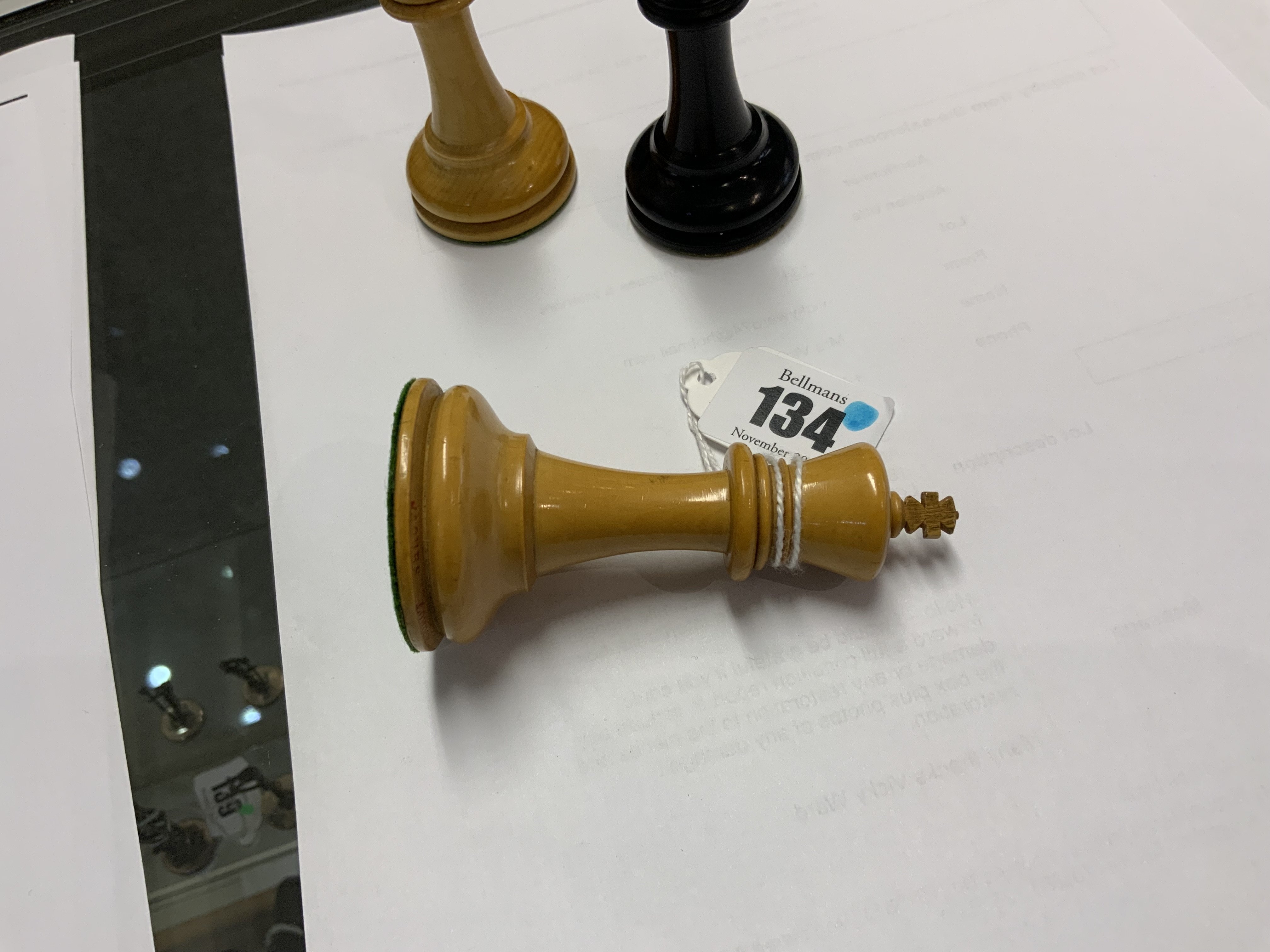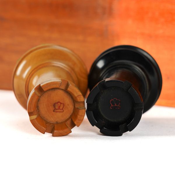 A VICTORIAN JAQUES OF LONDON STAUNTON PATTERN WEIGTHED EBONY AND BOXWOOD CHESS SET (34)