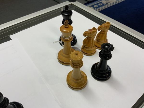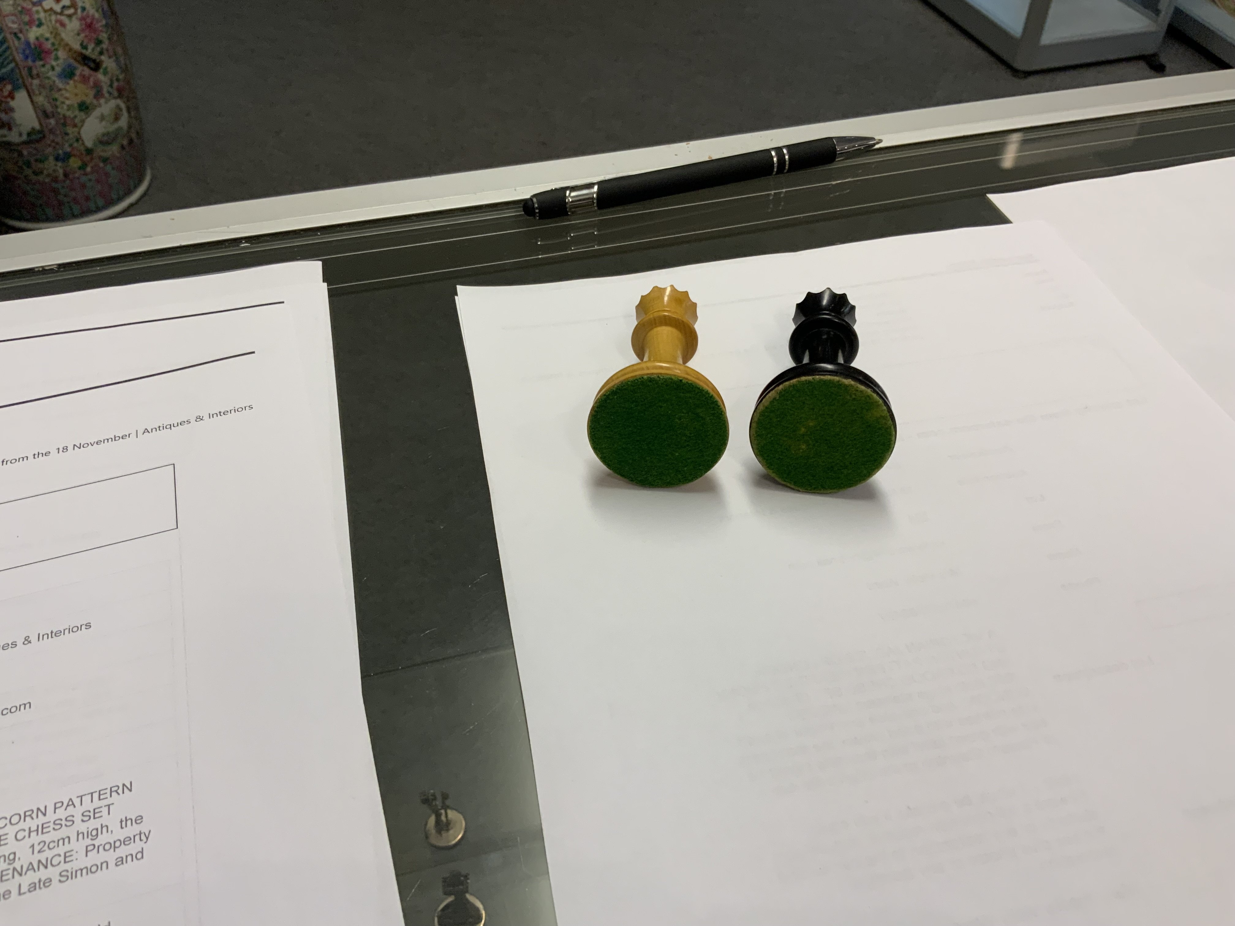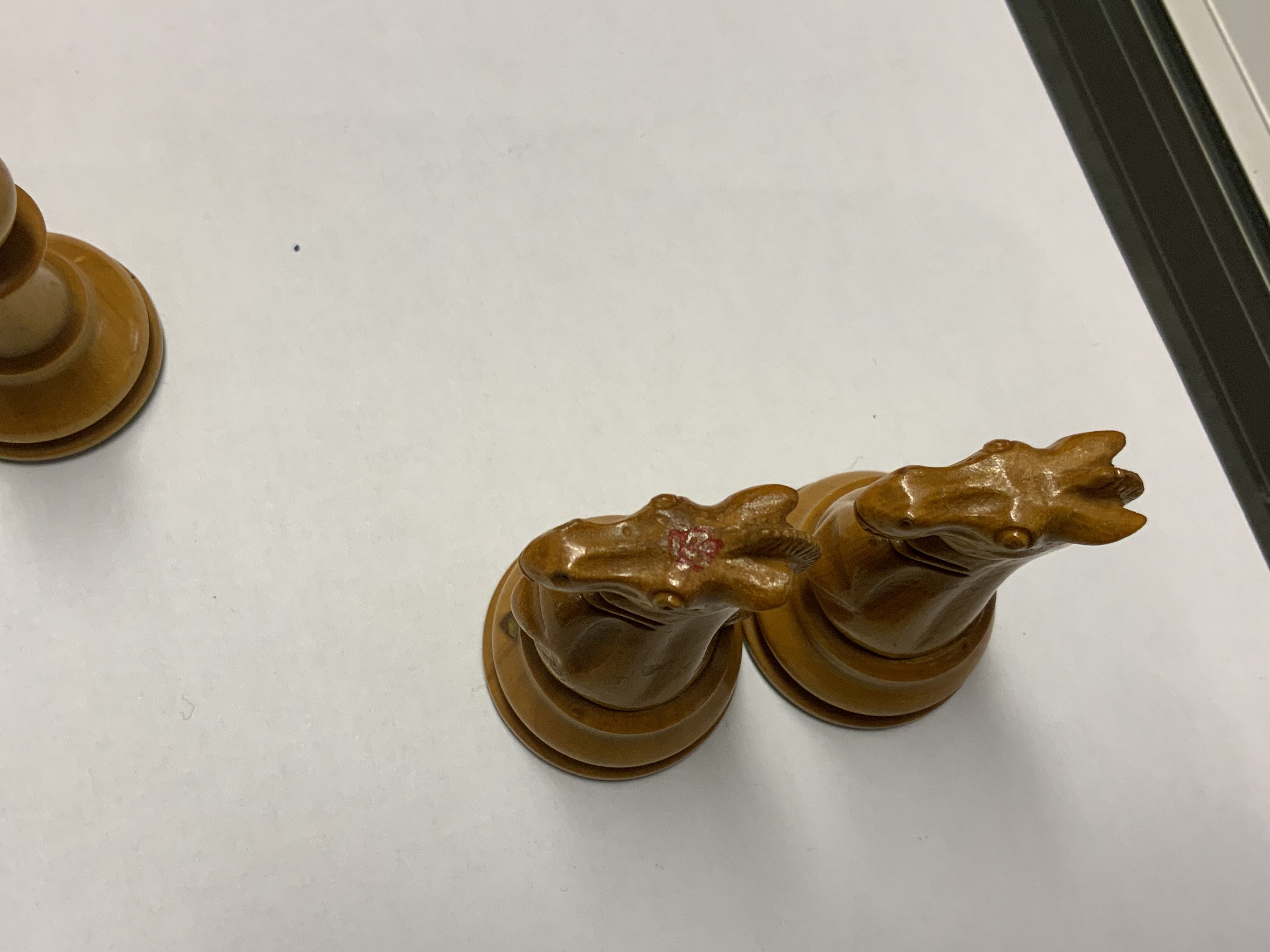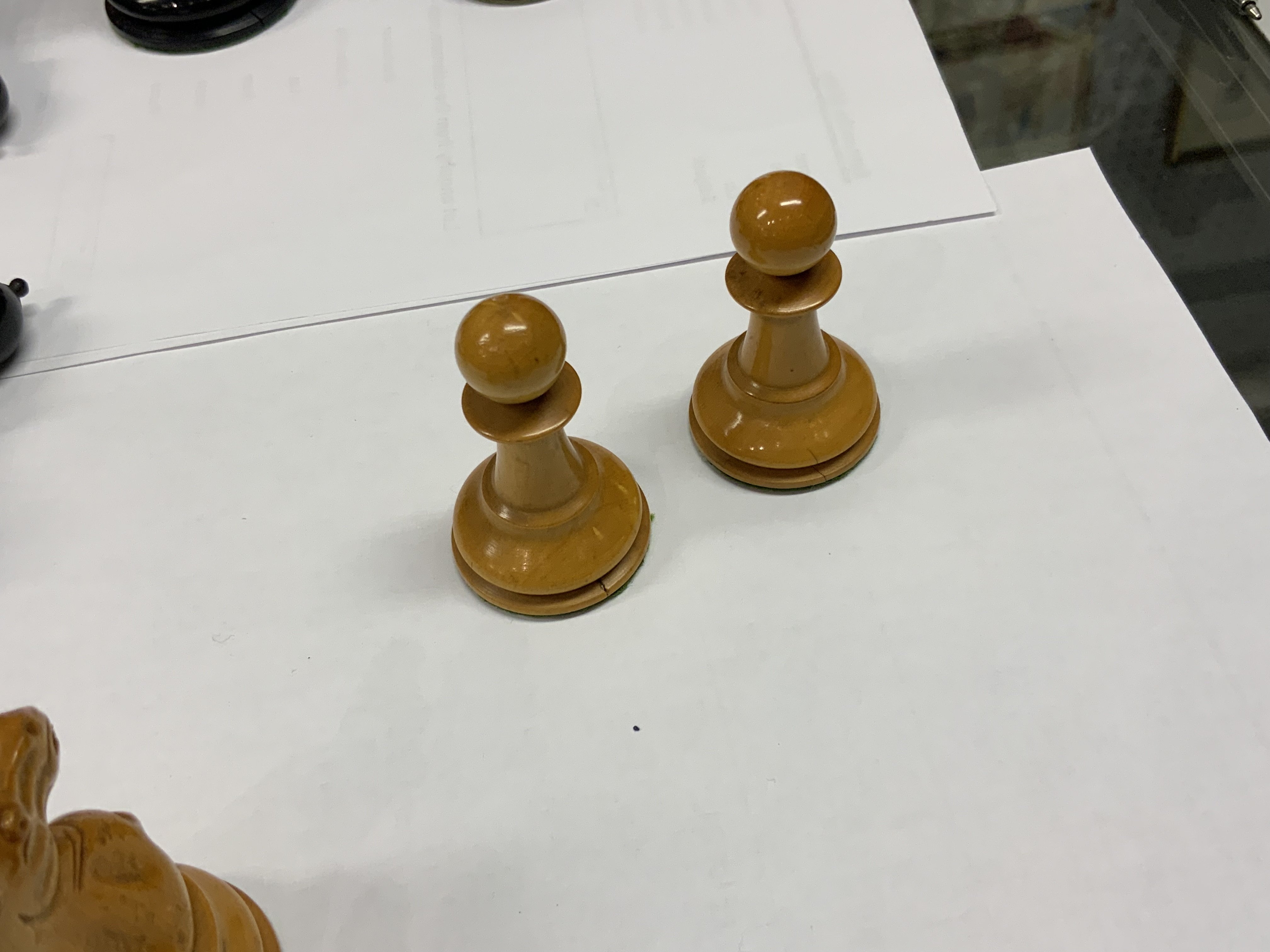 Overall in good condition but there is a possibility that the white queen is a good replacement. the baise is replaced or new and the nature of the timber is different with a more prominent grain. See images. The kings finials could easily be replaced and well done but often these are repaired. Please see extra images.