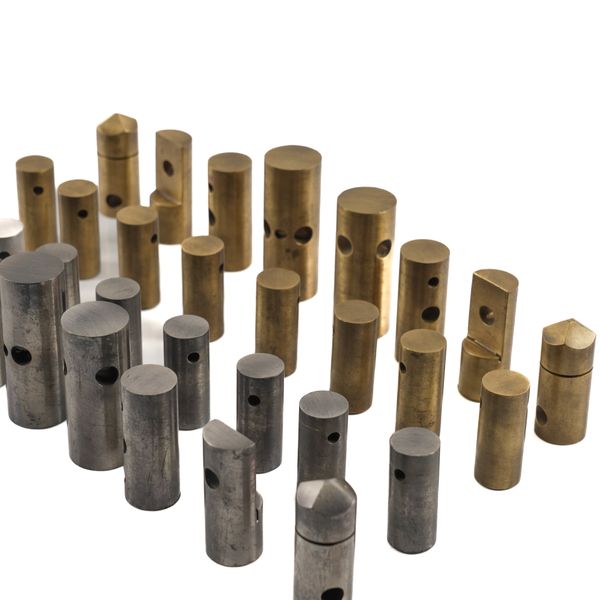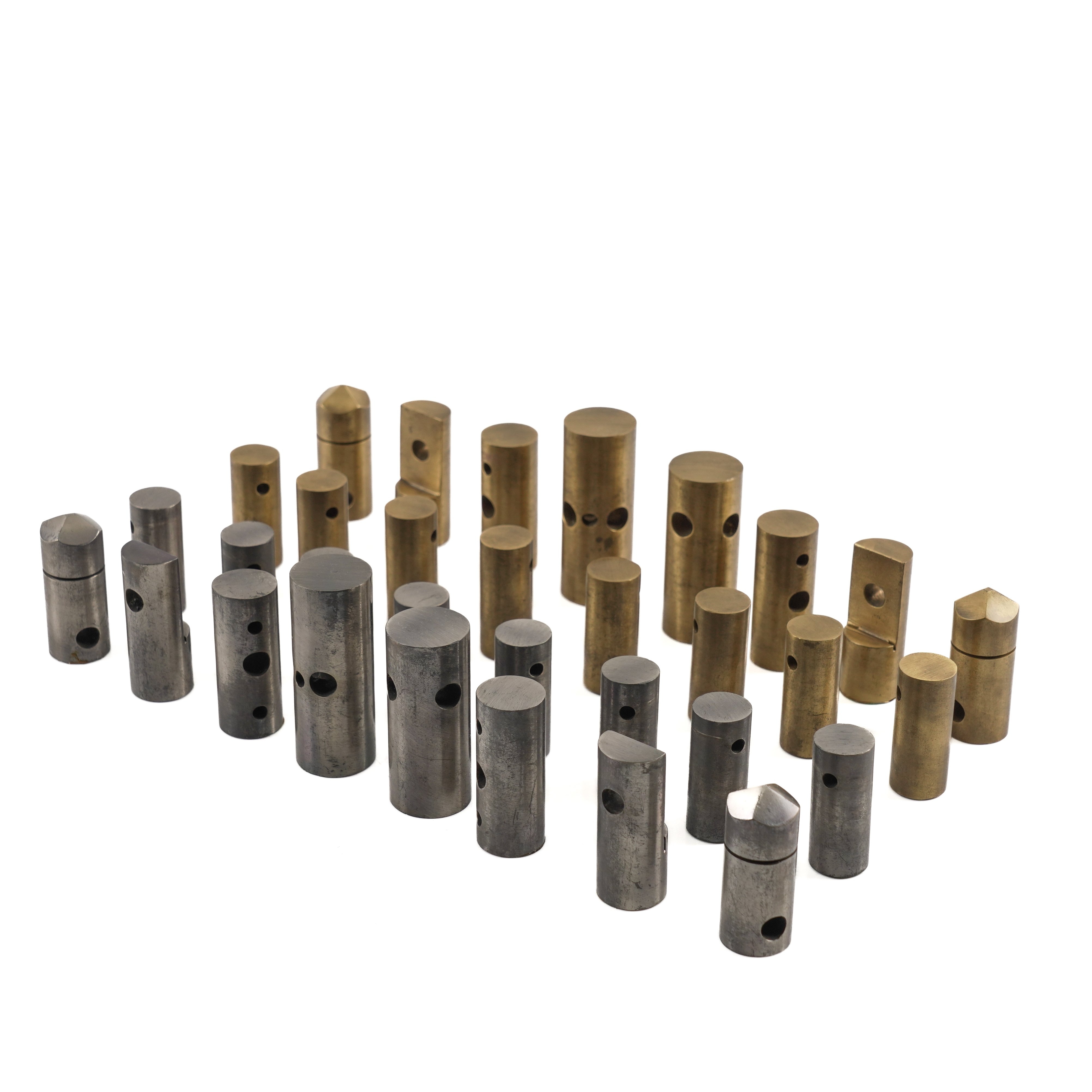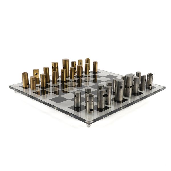 AN ABSTRACT POLISHED ALUMINIUM AND BRONZE CHESS SET (33)