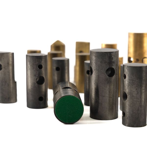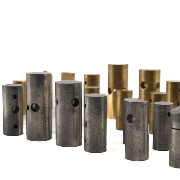 Each cylindrical piece cast with apertures, the king 7cm high, the pawn 5cm, the Perspex board, 41cm sq.