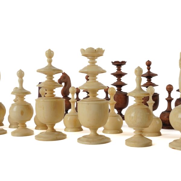 The Régence design is named after the famous Parisian Café de la Régence, where reputedly chess players like Voltaire, Rousseau, Stamma and Philidor, Ben Franklin, Robespierre, Napoleon, Harrwitz and Morphy enjoyed the game. These Régence playing sets share a number of characteristics including petal shaped crowns for the kings, the queens and bishops are similar in form, functional vase shape and baluster stems.