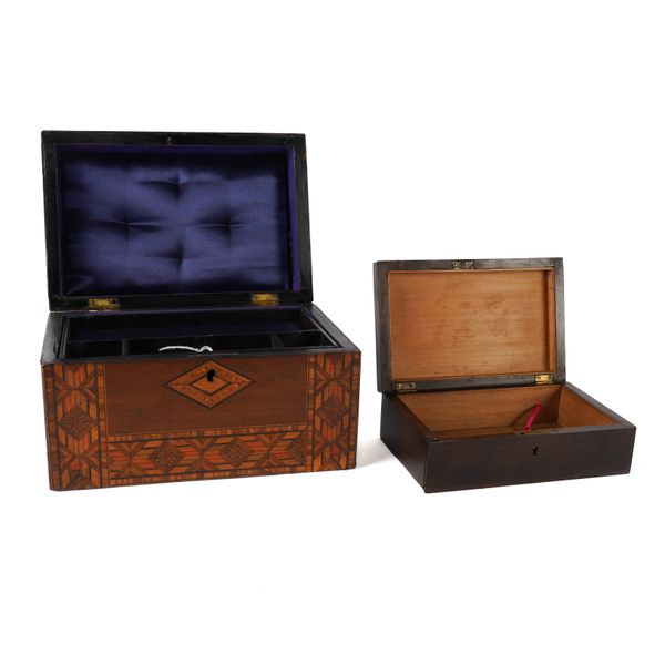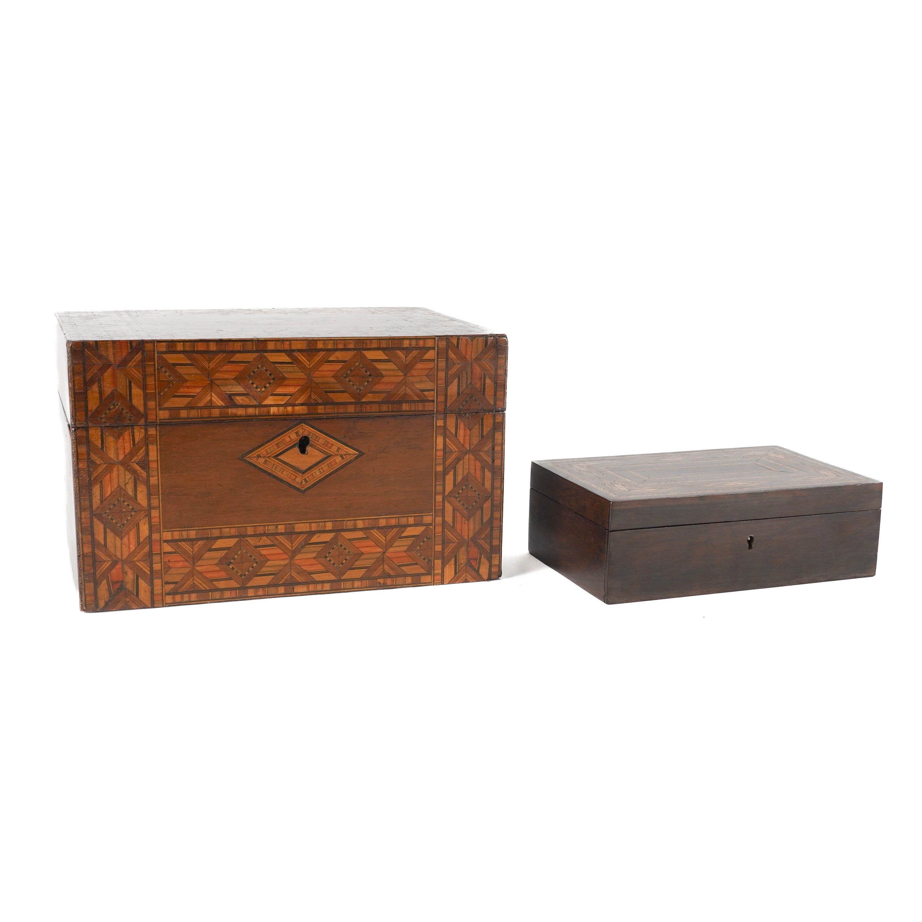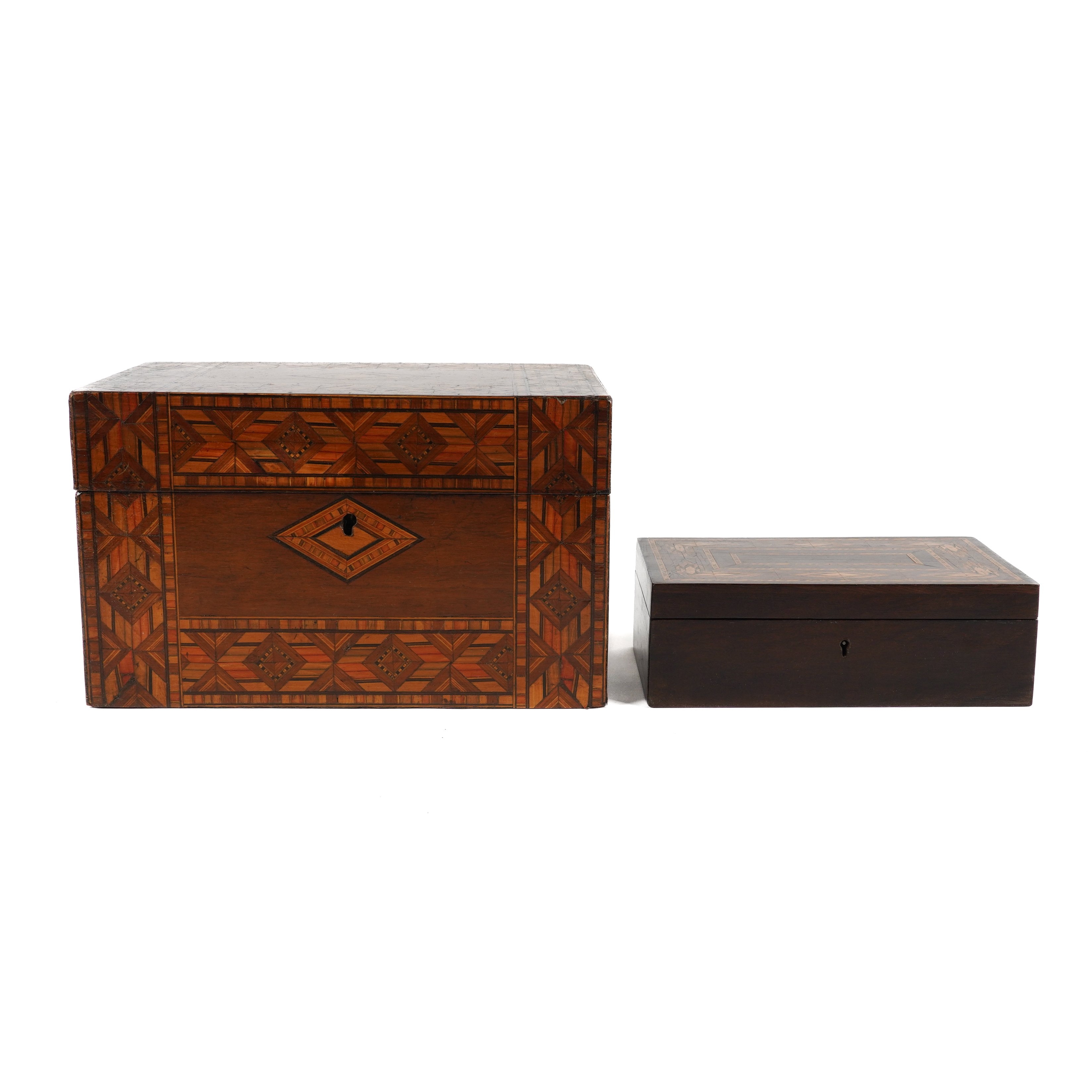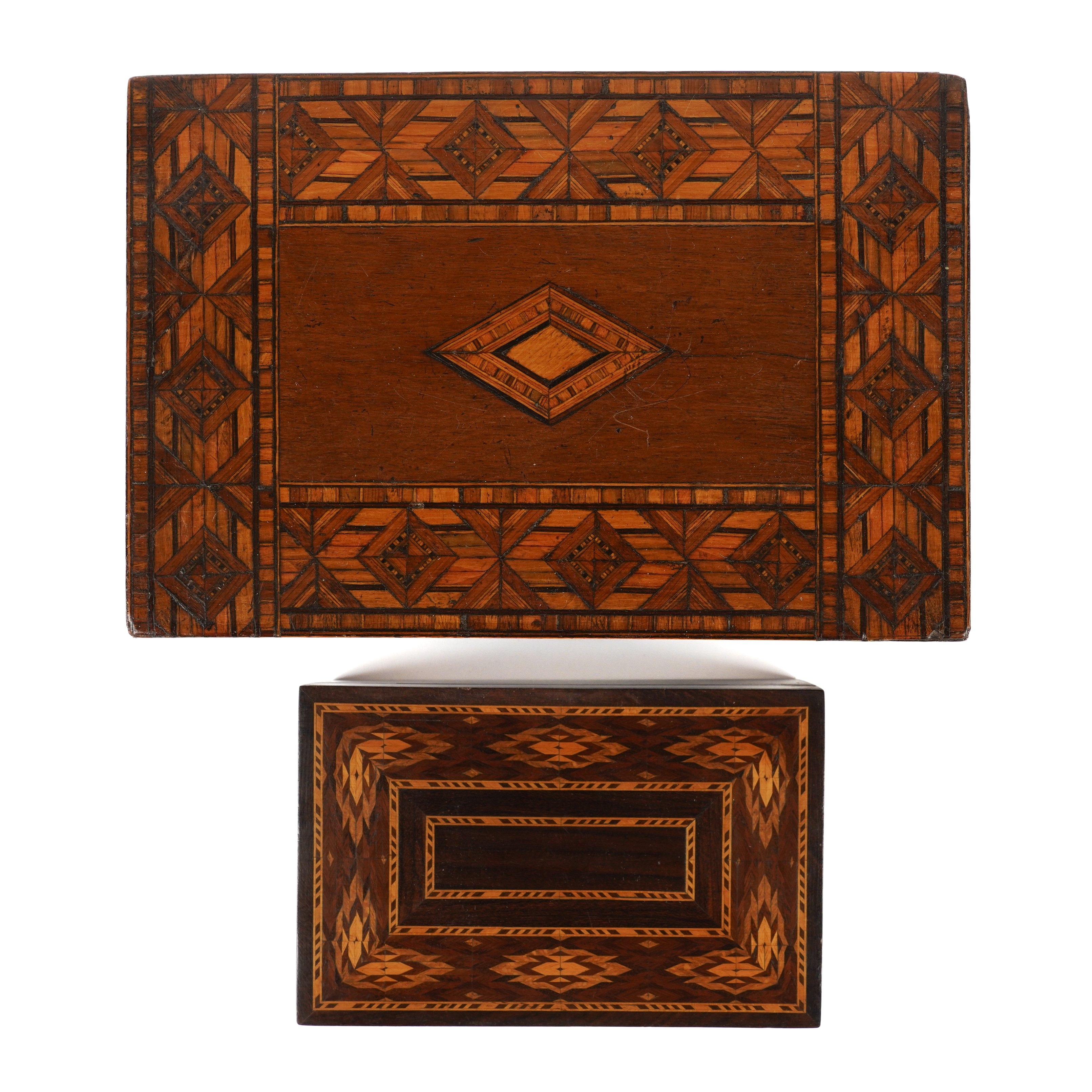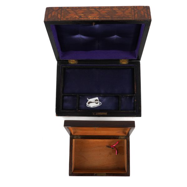 A VICTORIAN TUNBRIDGE WARE GEOMETRIC INLAID WALNUT JEWELLERY BOX AND ANOTHER (2)