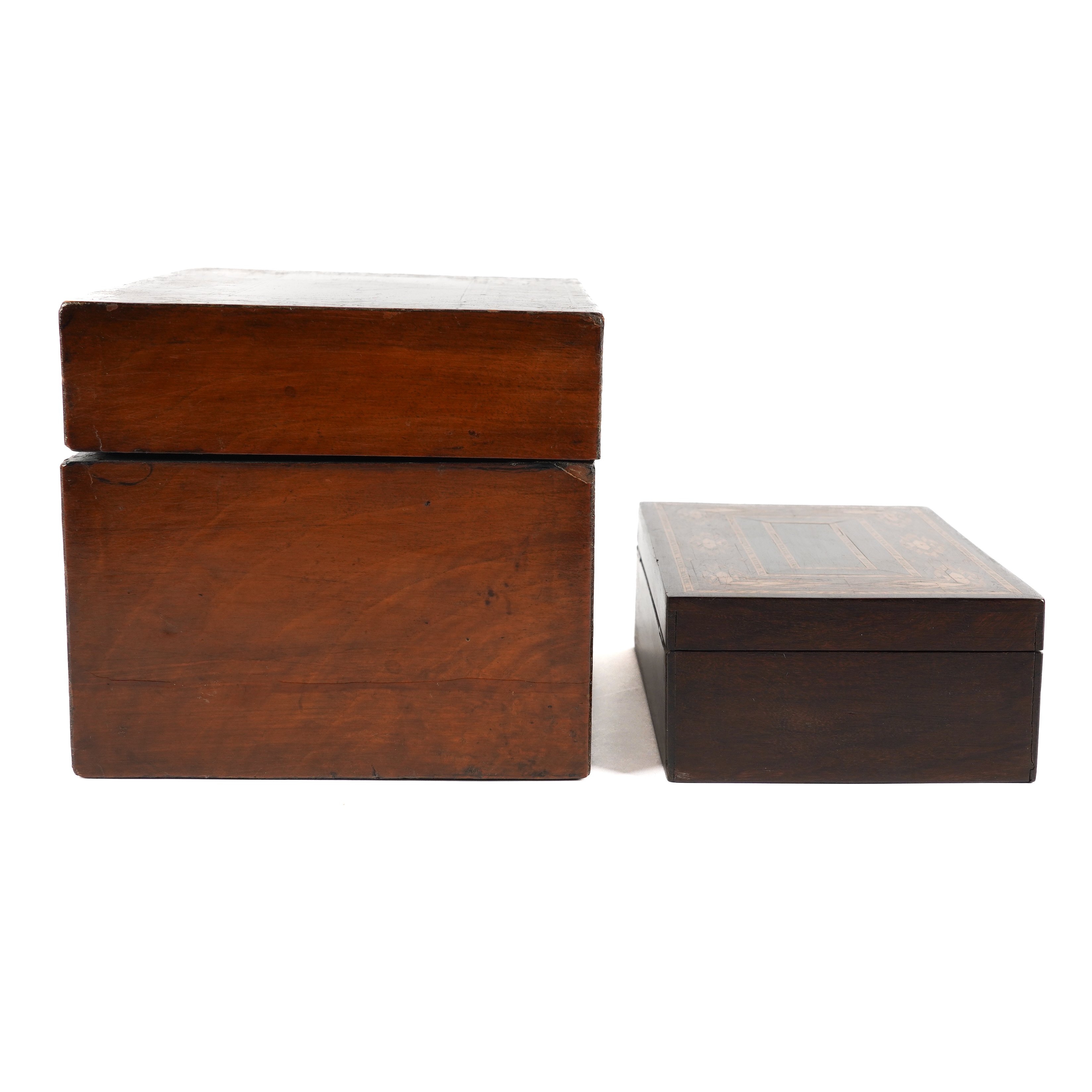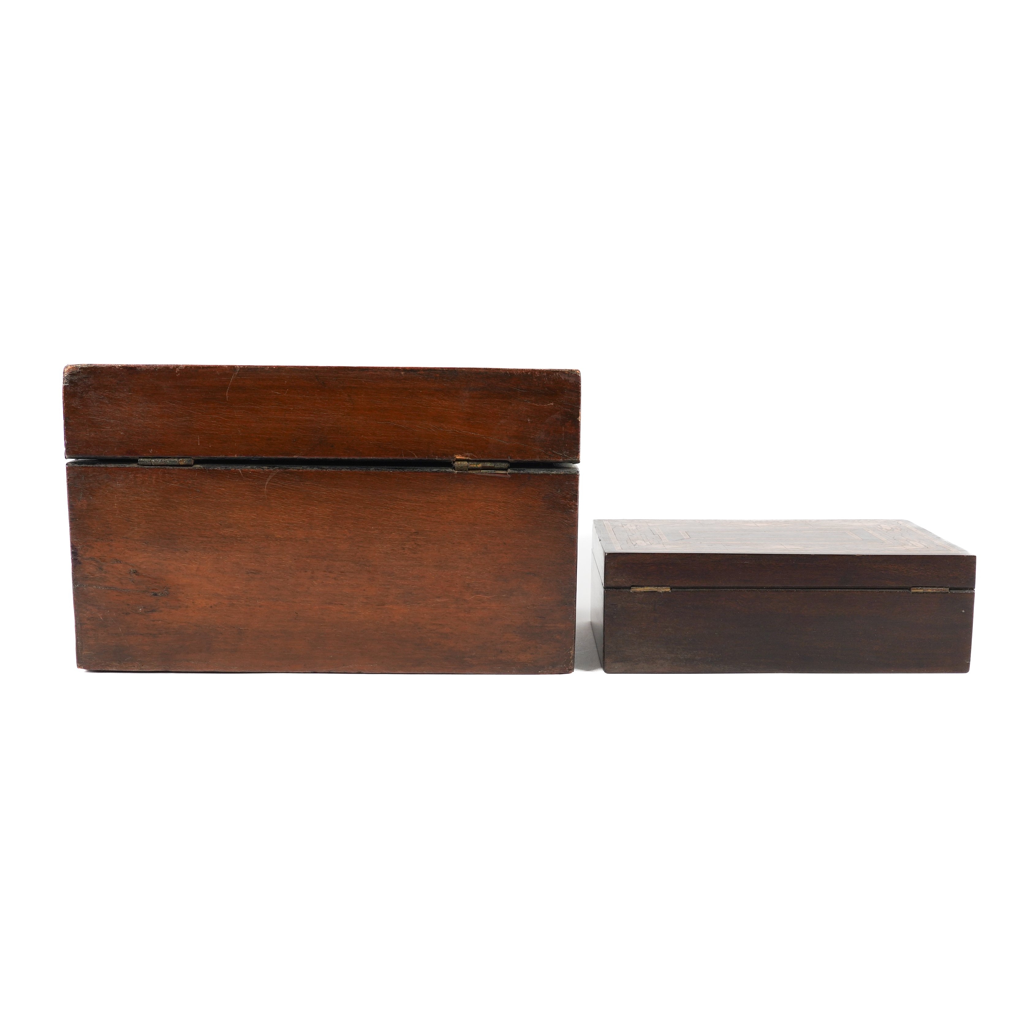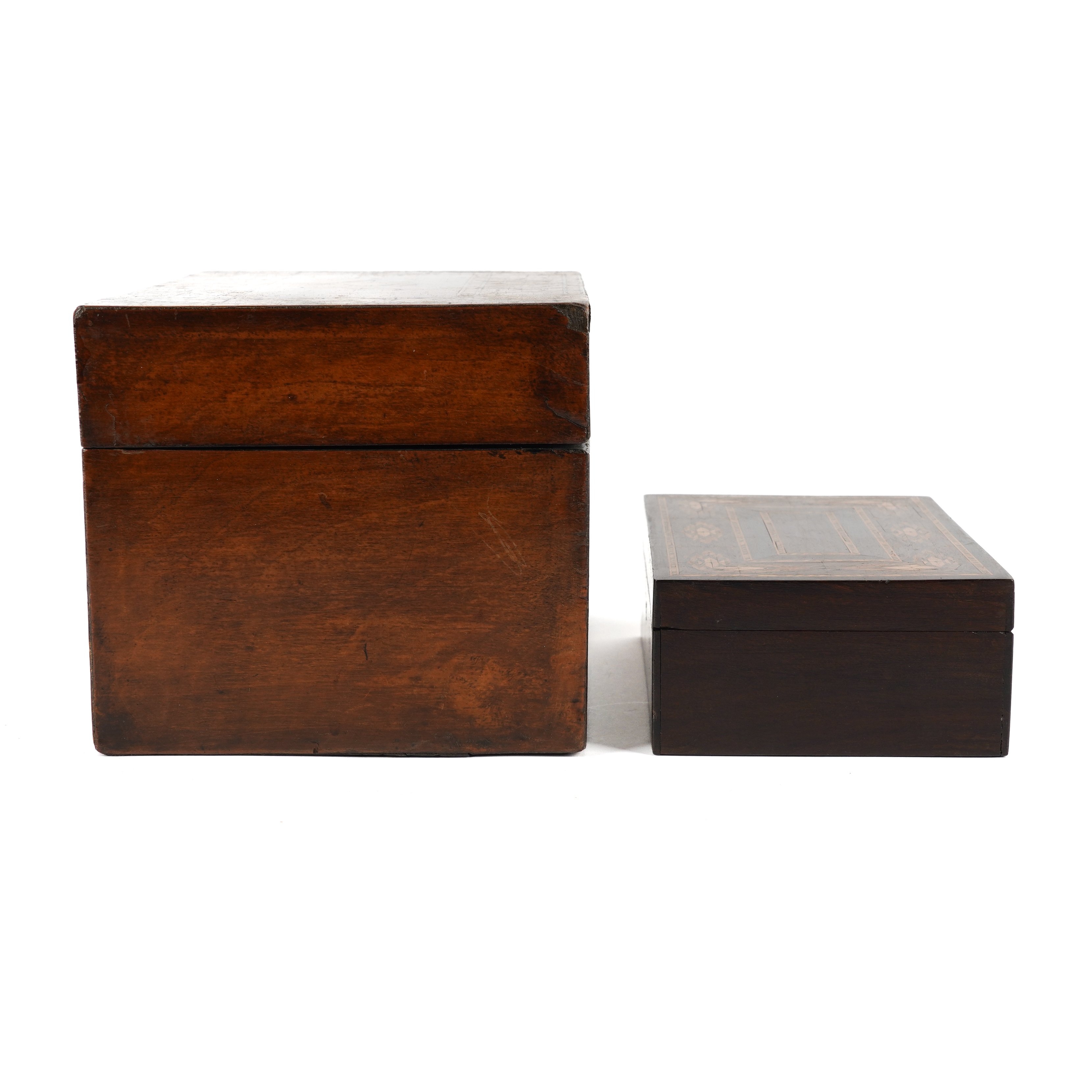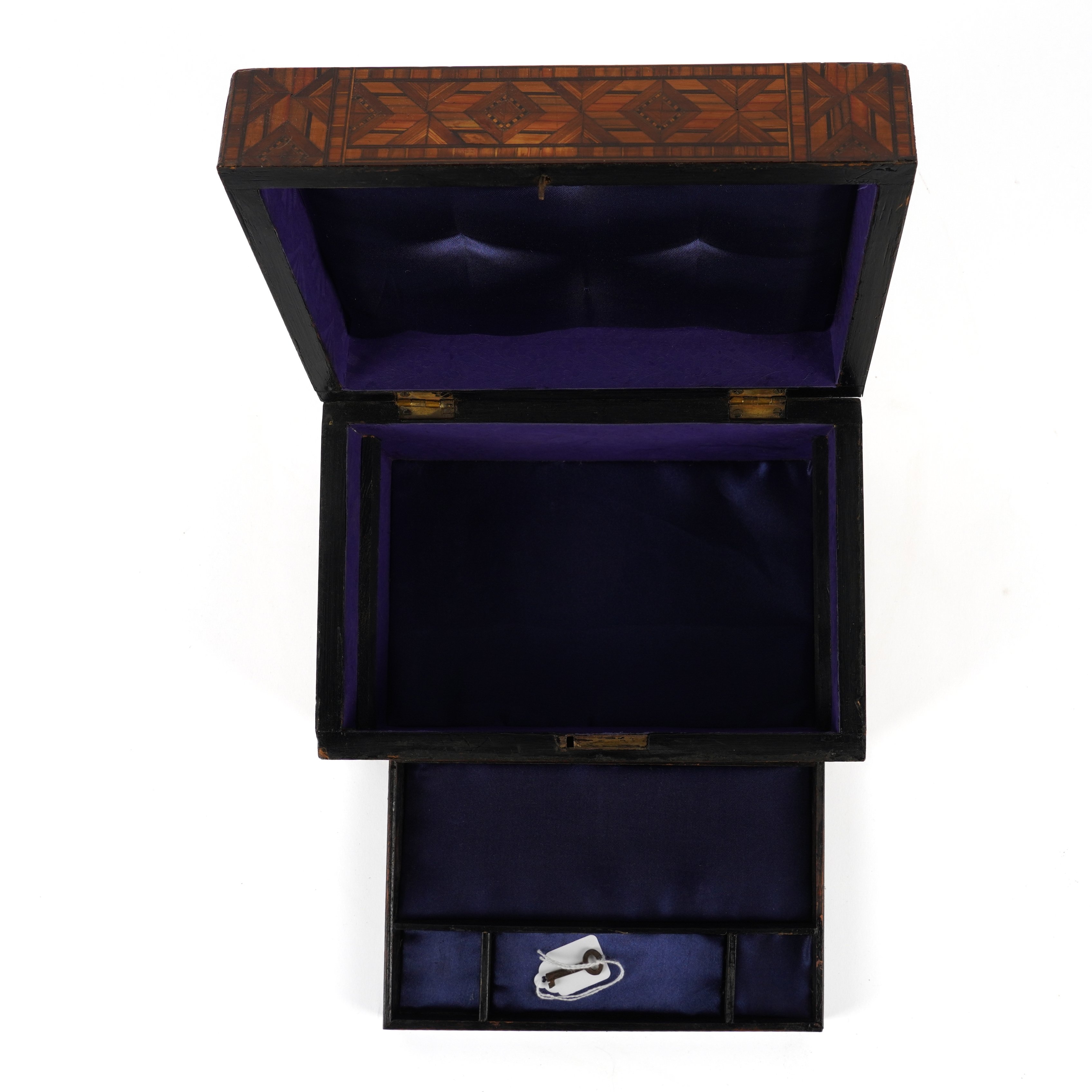 A VICTORIAN TUNBRIDGE WARE GEOMETRIC INLAID WALNUT JEWELLERY BOX AND ANOTHER (2)