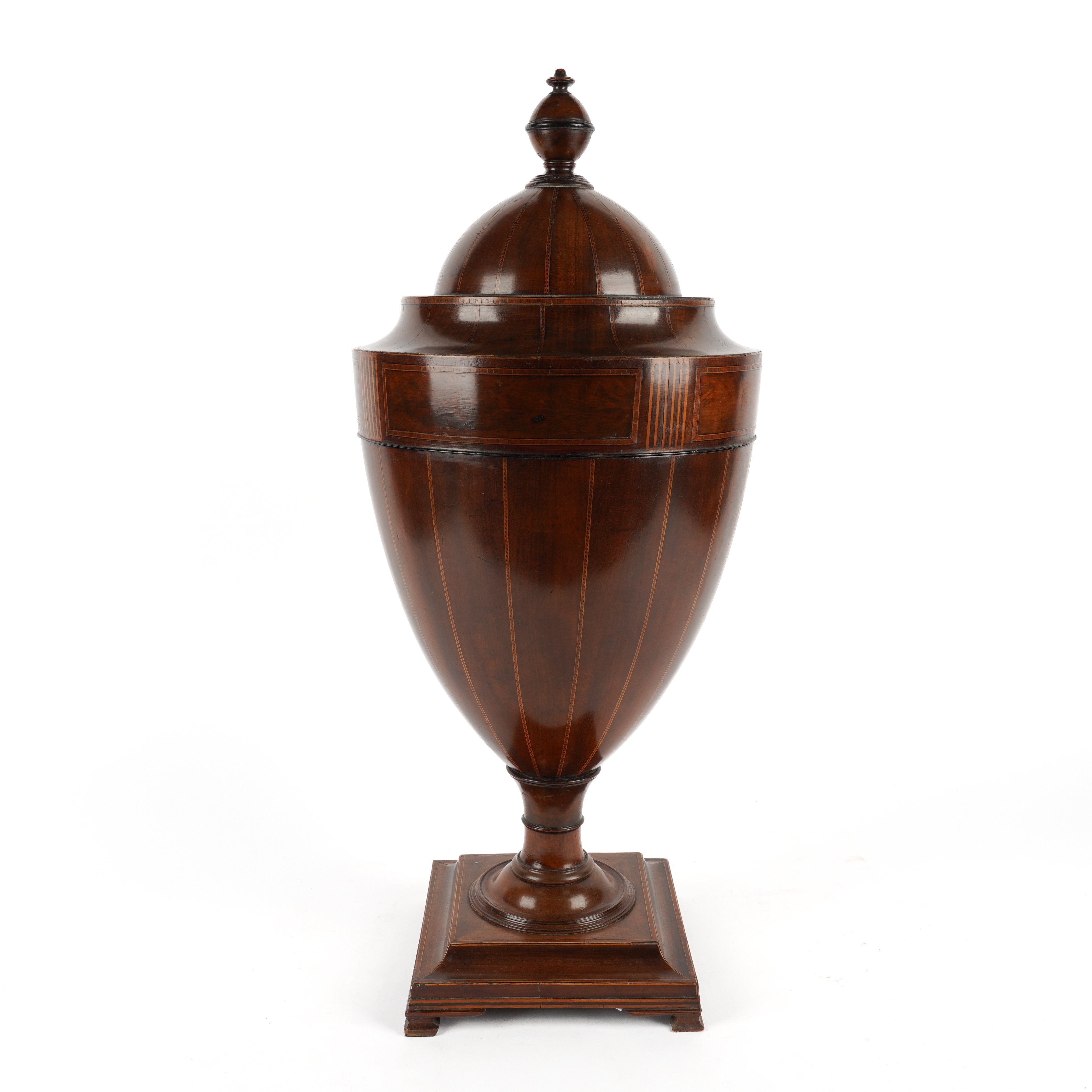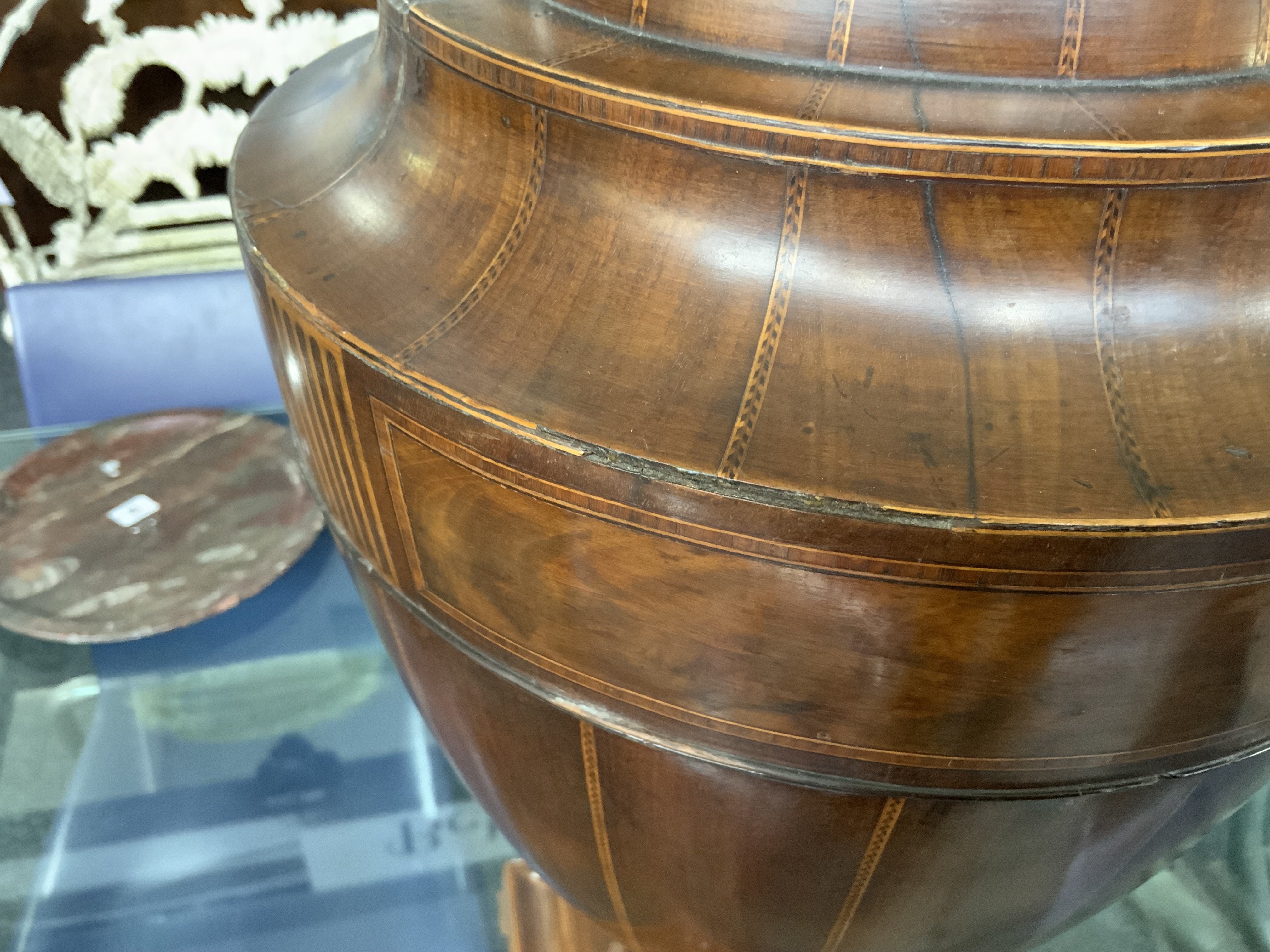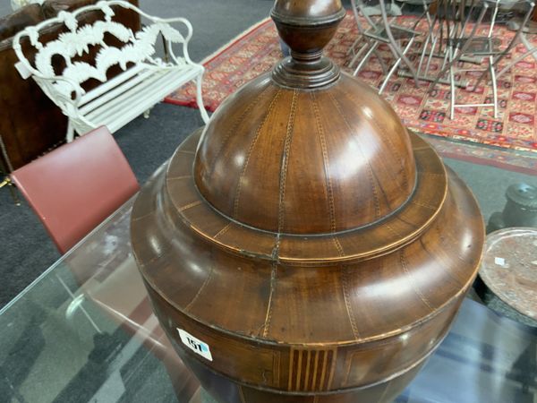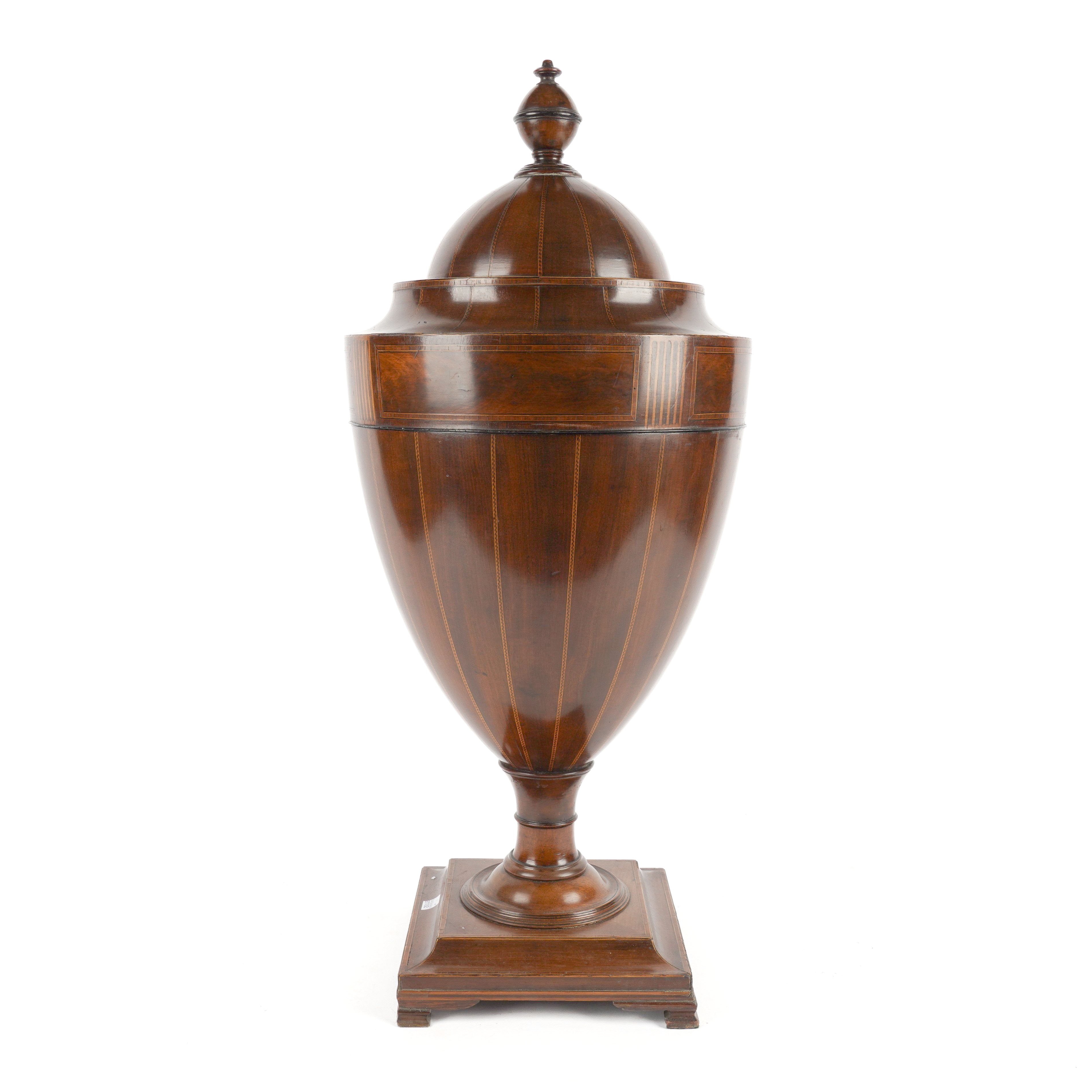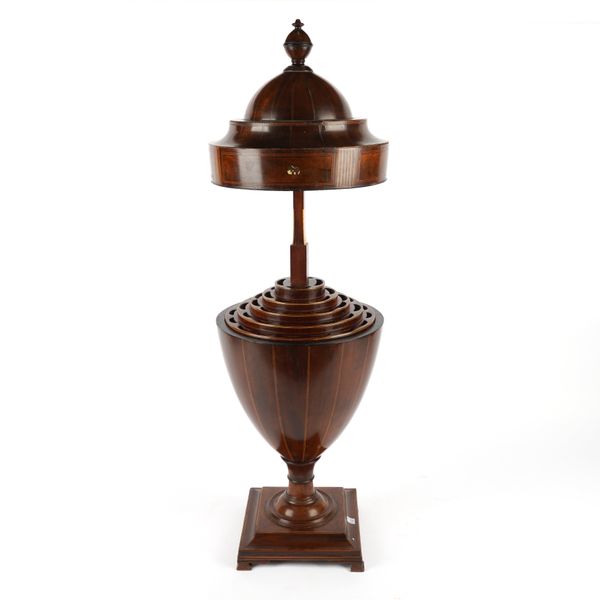 A GEORGE III MAHOGANY CHEQUER LINE INLAID URN SHAPED KNIFE BOX