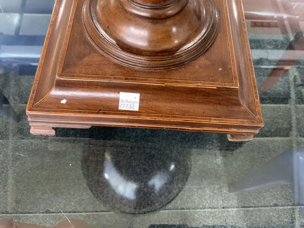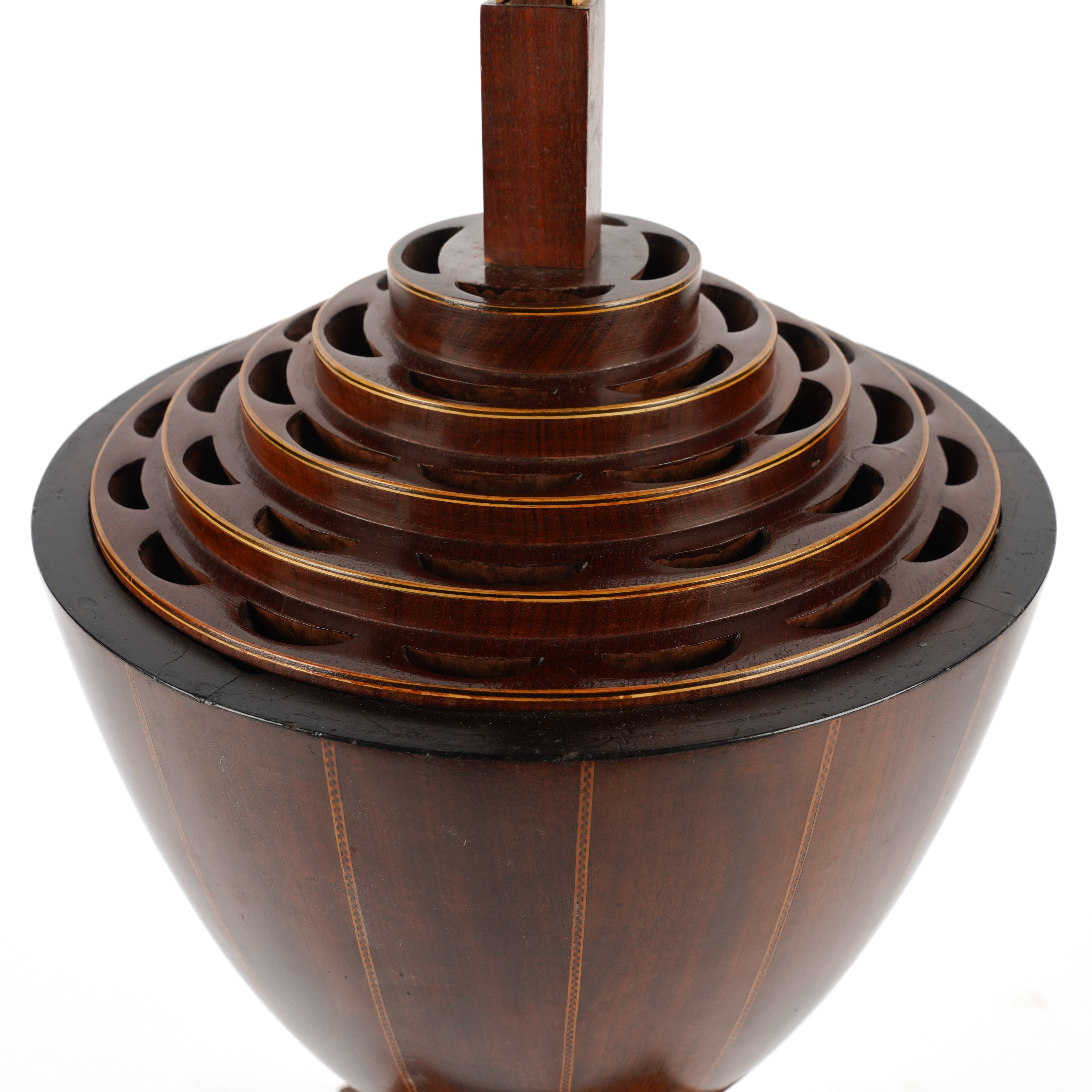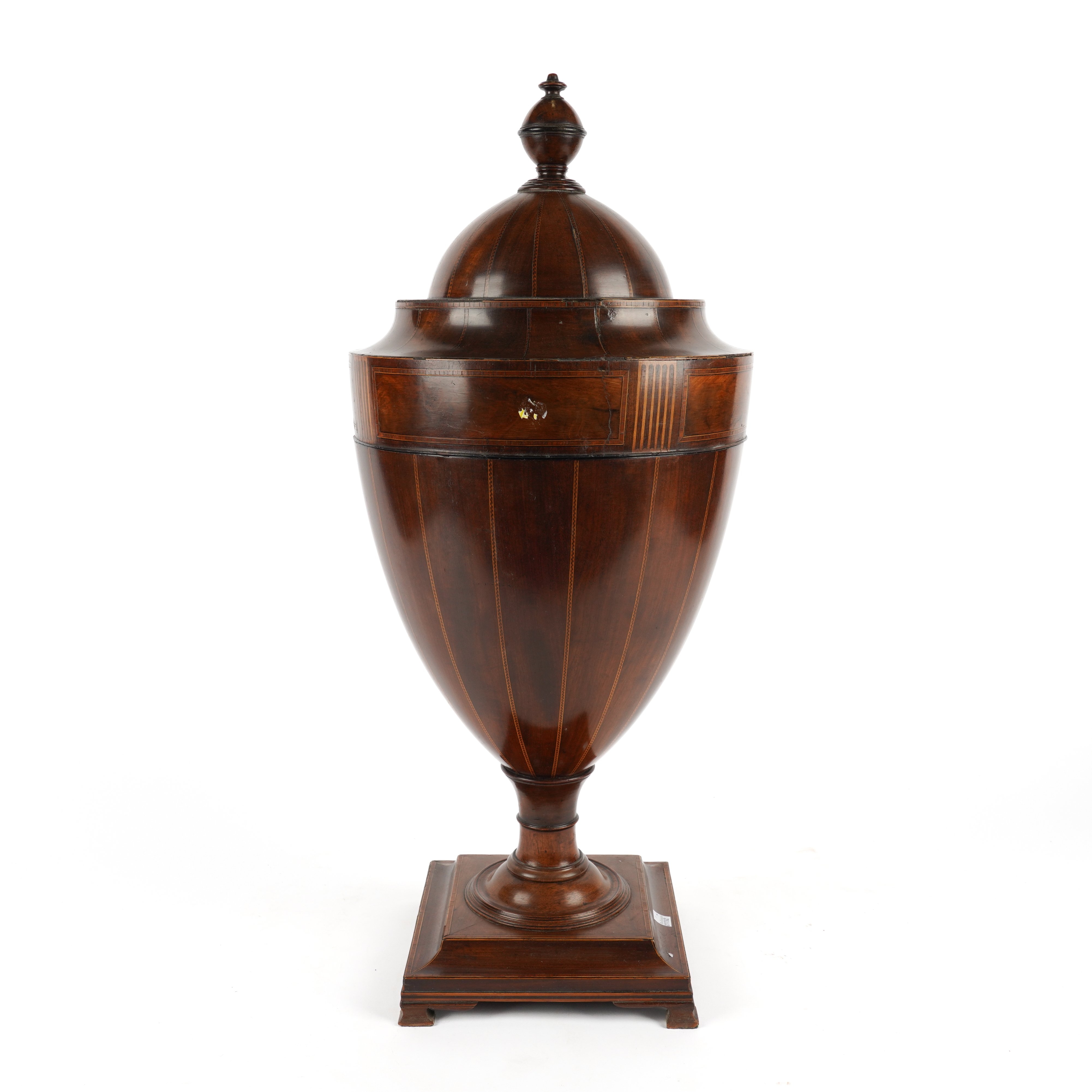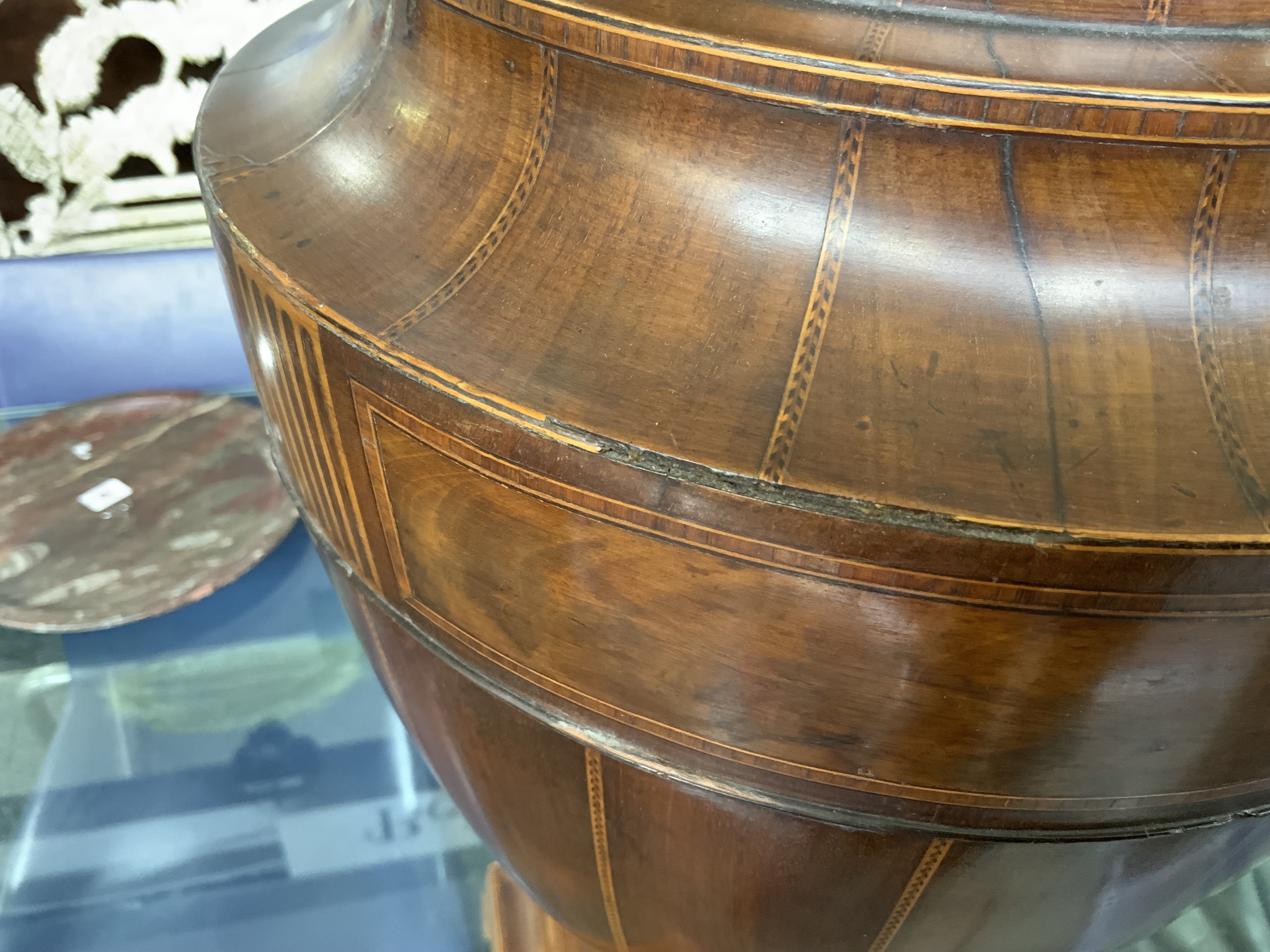 A GEORGE III MAHOGANY CHEQUER LINE INLAID URN SHAPED KNIFE BOX