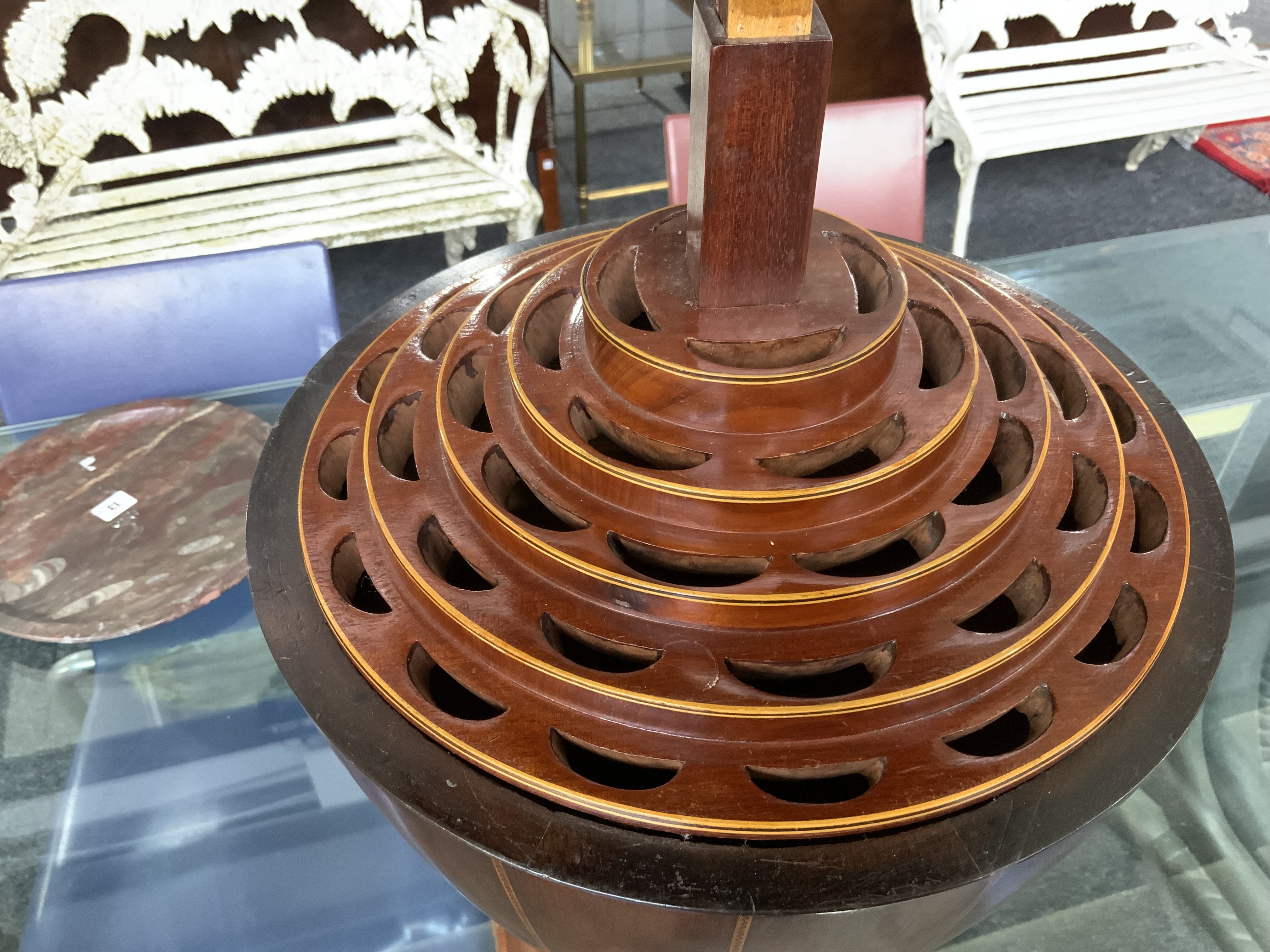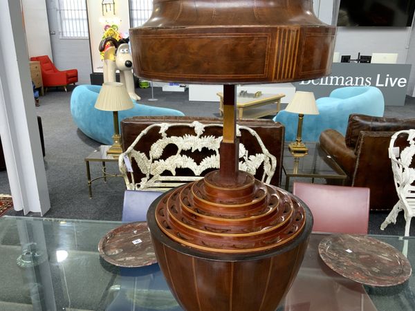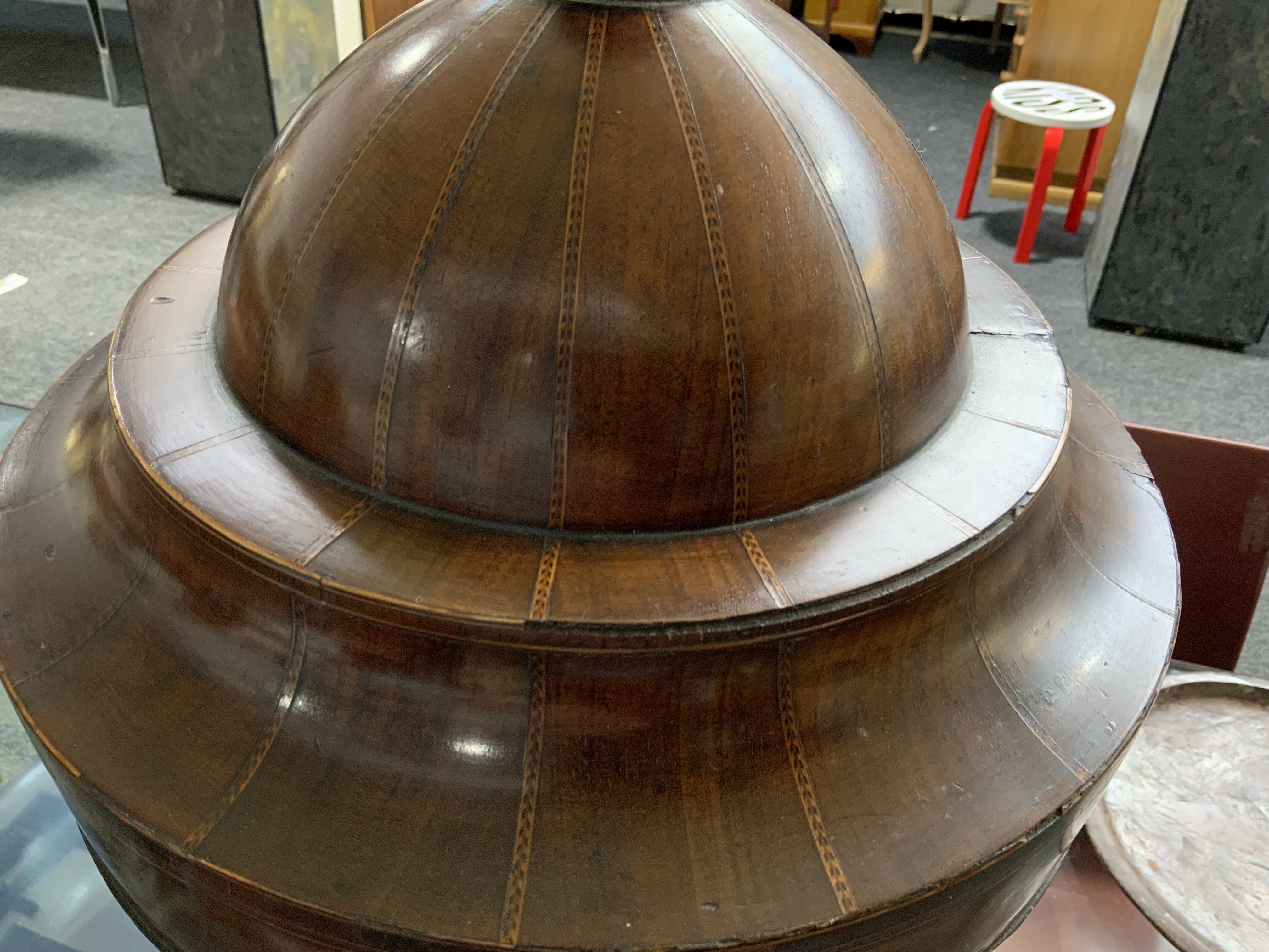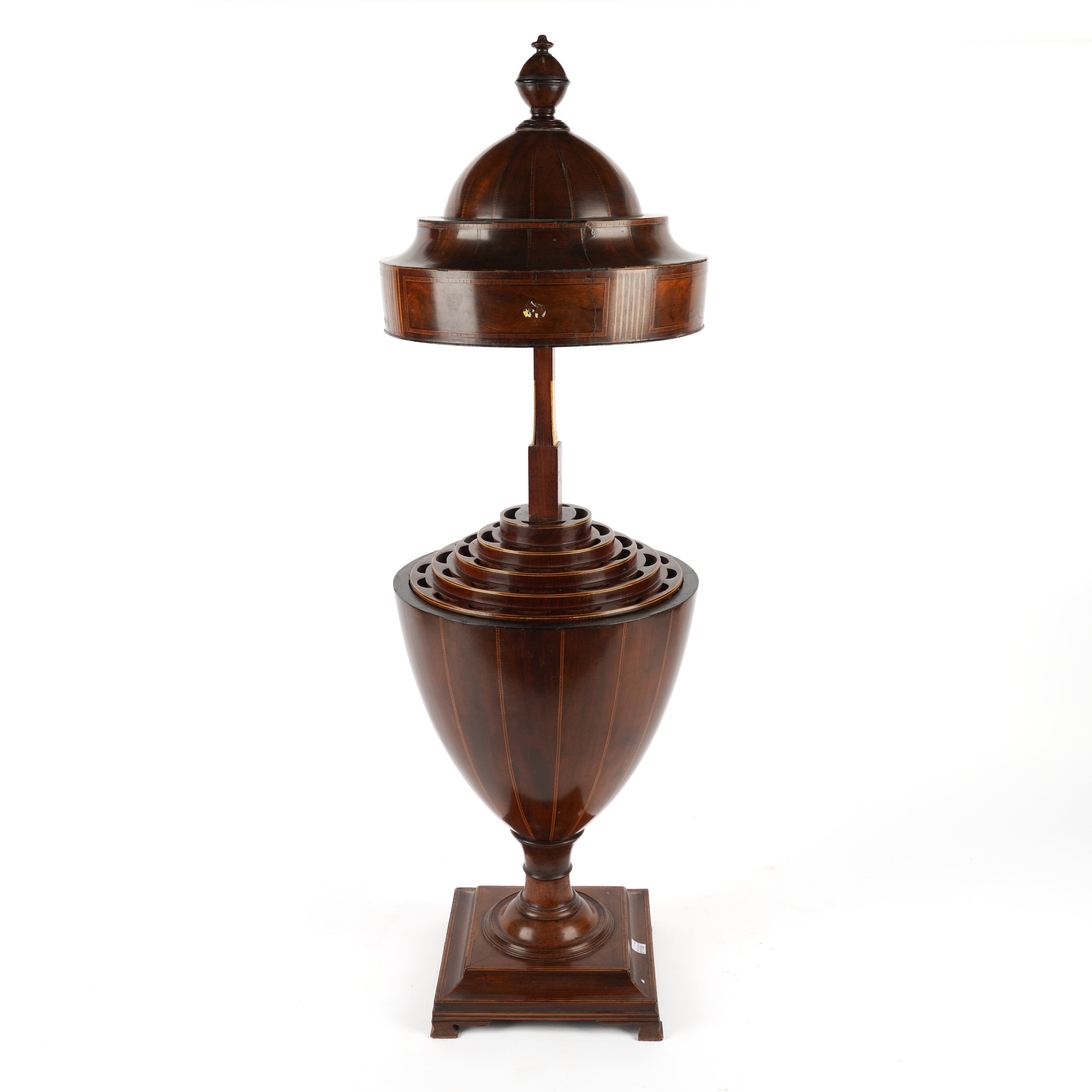 The domed covered with stopped fluted inlay decoration raised on central support, the interior fitted, raised on a square base, 71cm high