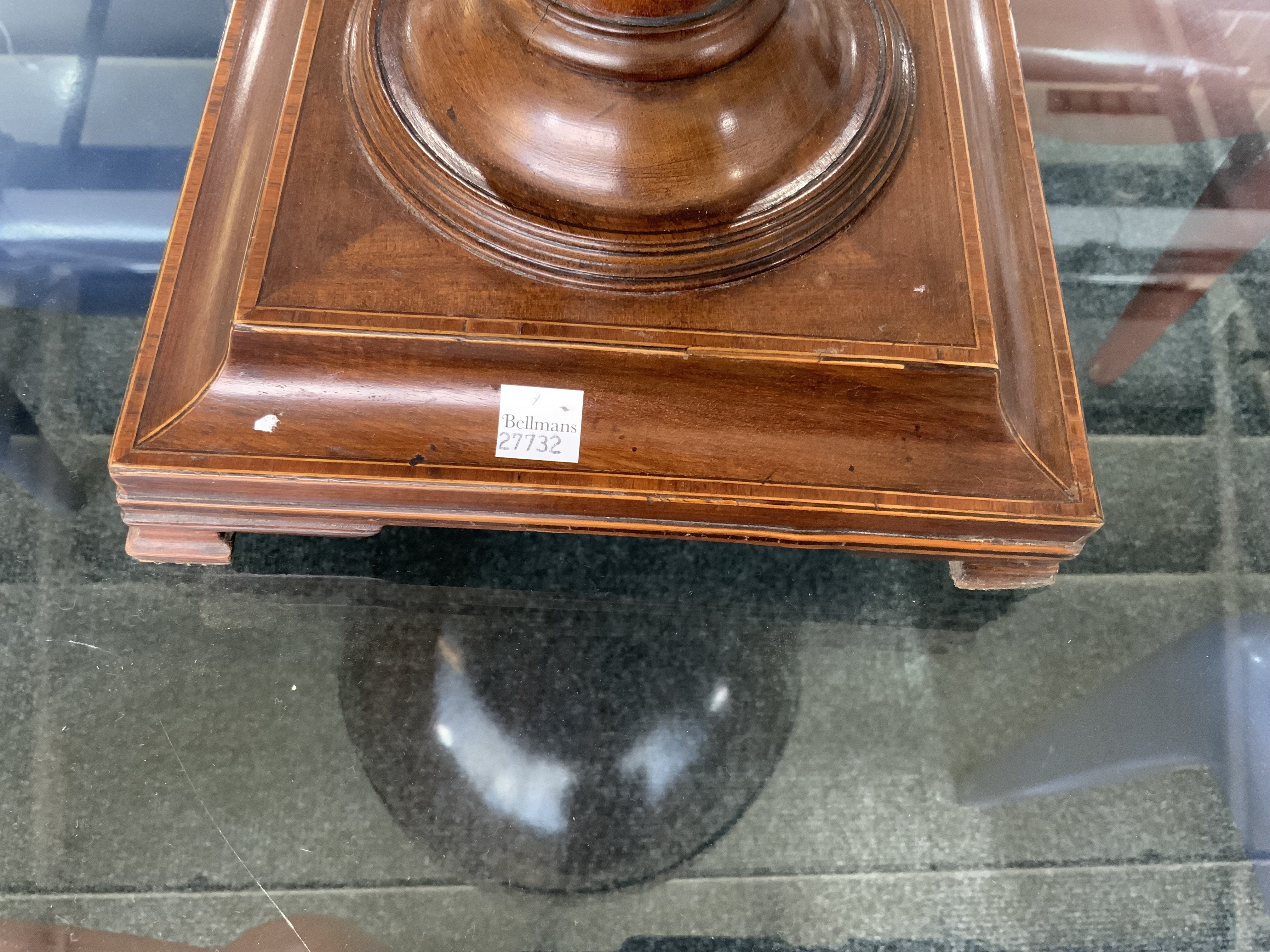 Wear, tear and some light losses to some of the stringing, particularly to the edges and notably to the lifting lid, where there is a shrinkage crack and repaired area. See extra images on the Bellmans website.