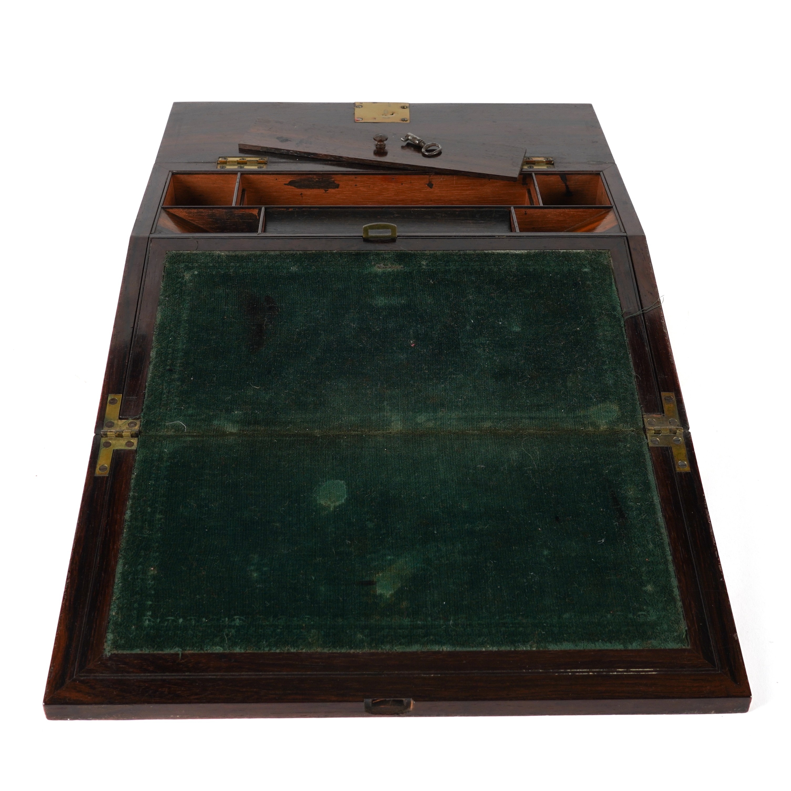 With hinged lid revealing a green velvet writing slope and rosewood interior with compartments, mother-of-pearl escutcheon, key, 33cm wide