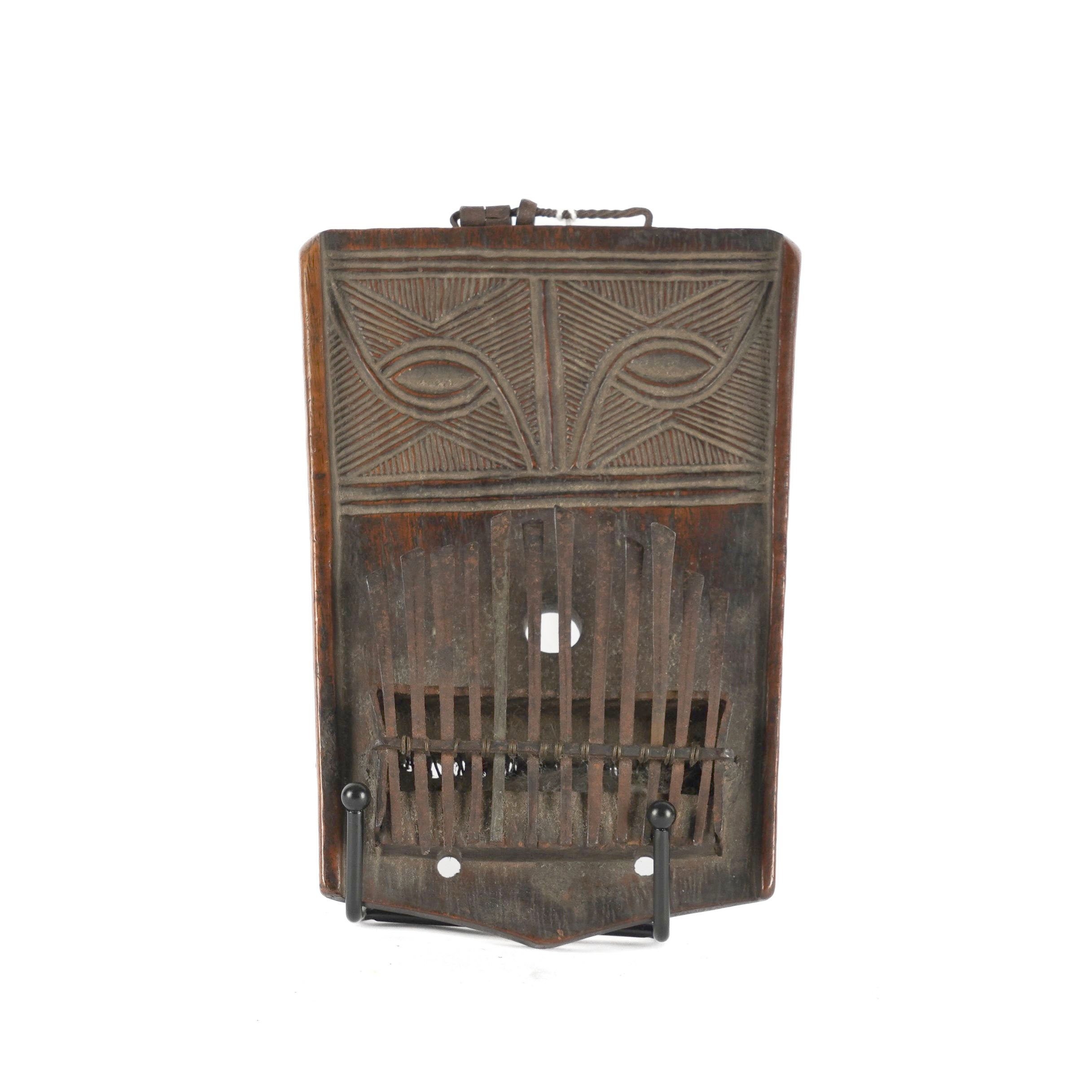 The wooden soundboard carved with eyes decoration, with twelve metal tines, 18cm high