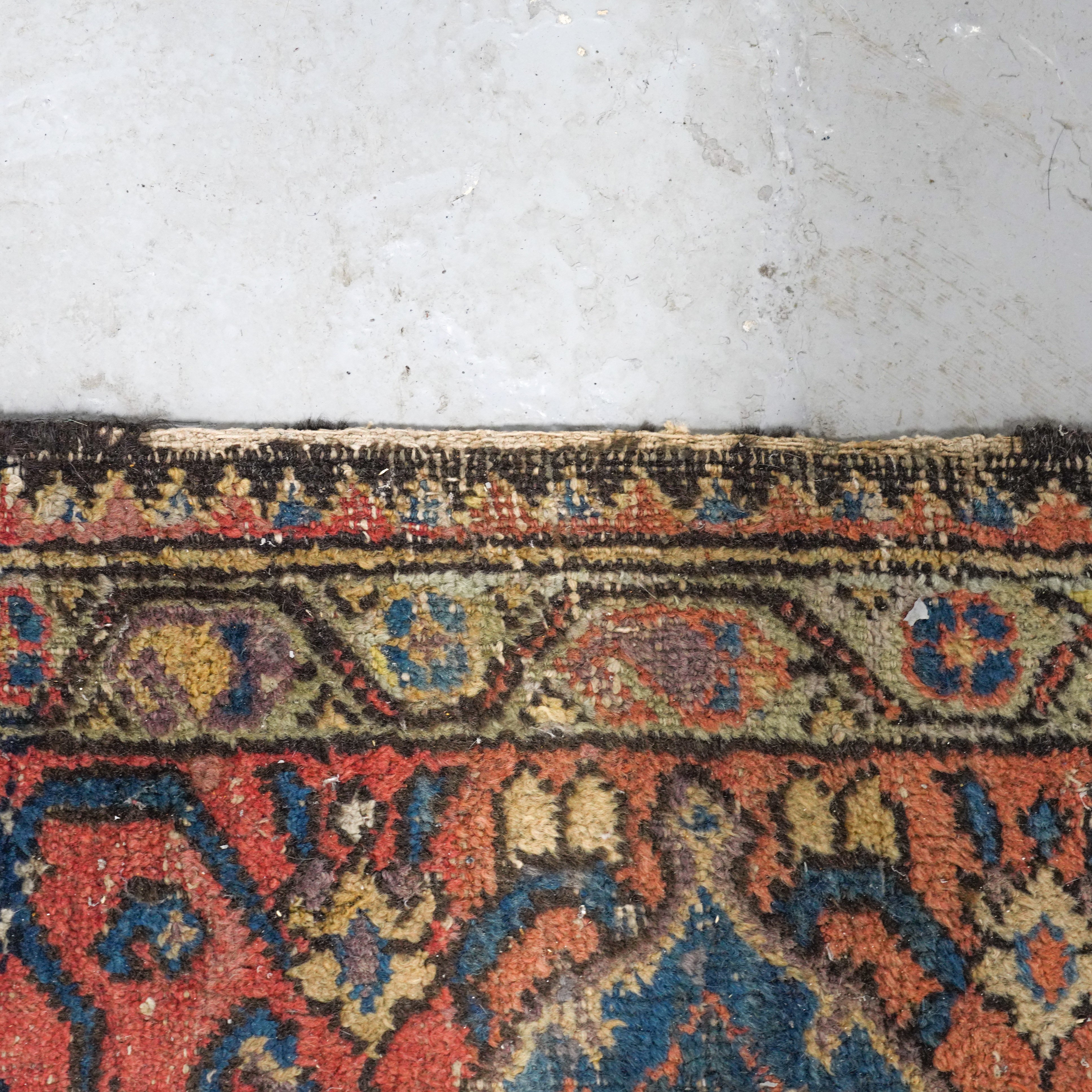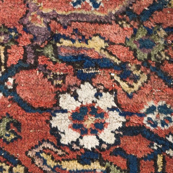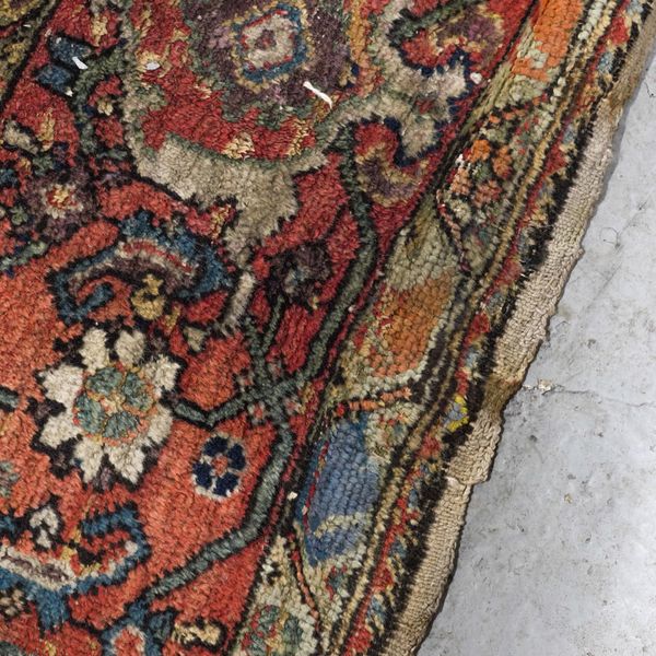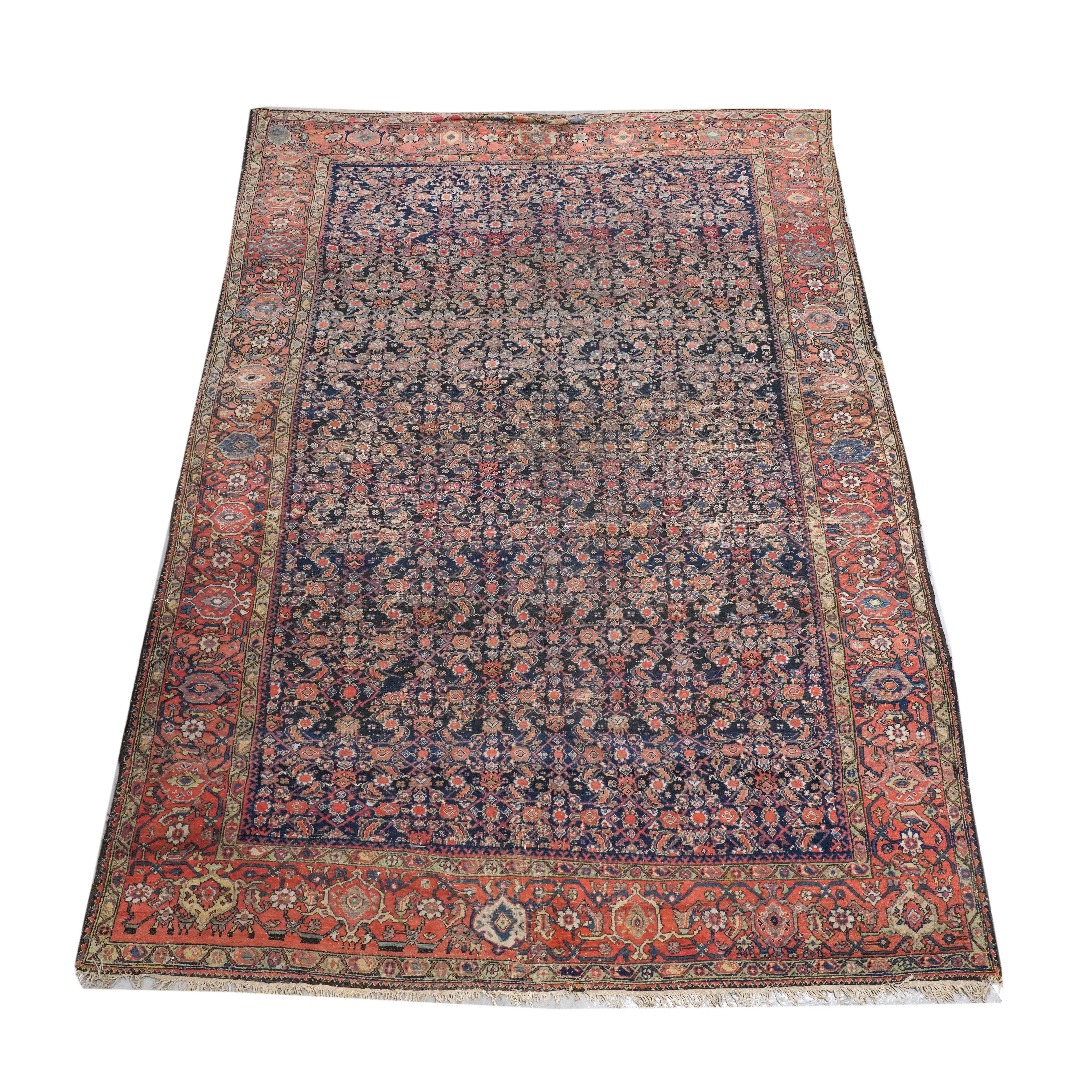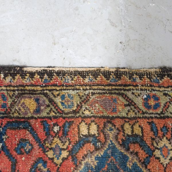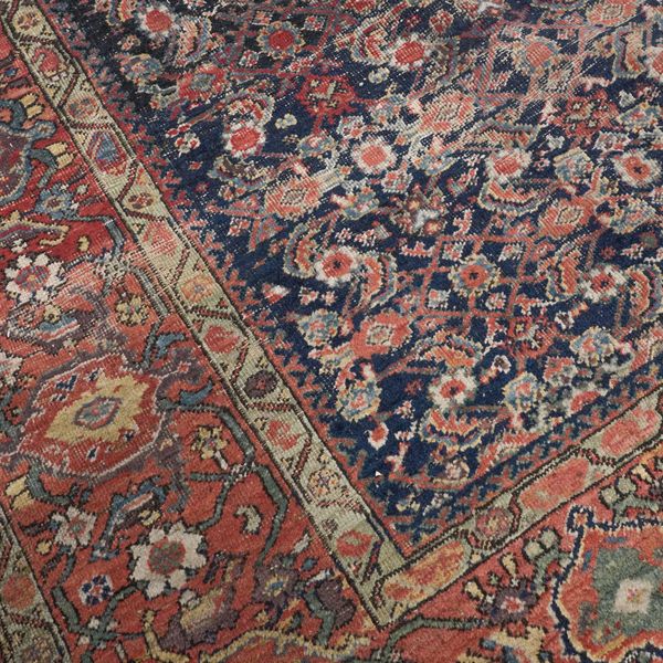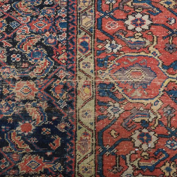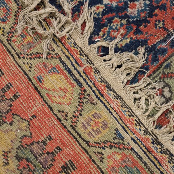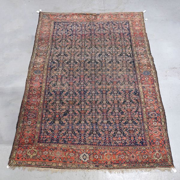 The dark indigo field with an all over herate design; a wide madder palmette and floral spray border, 500 x 300cm.
