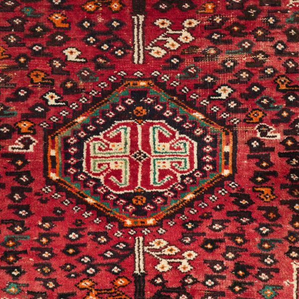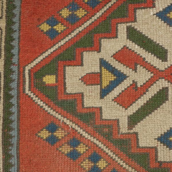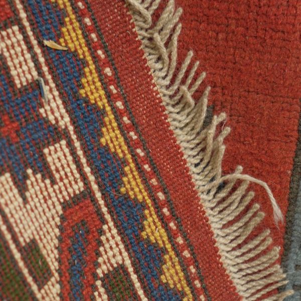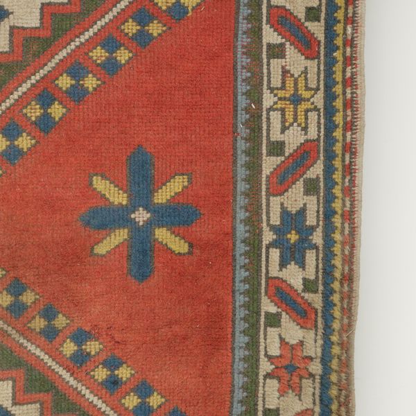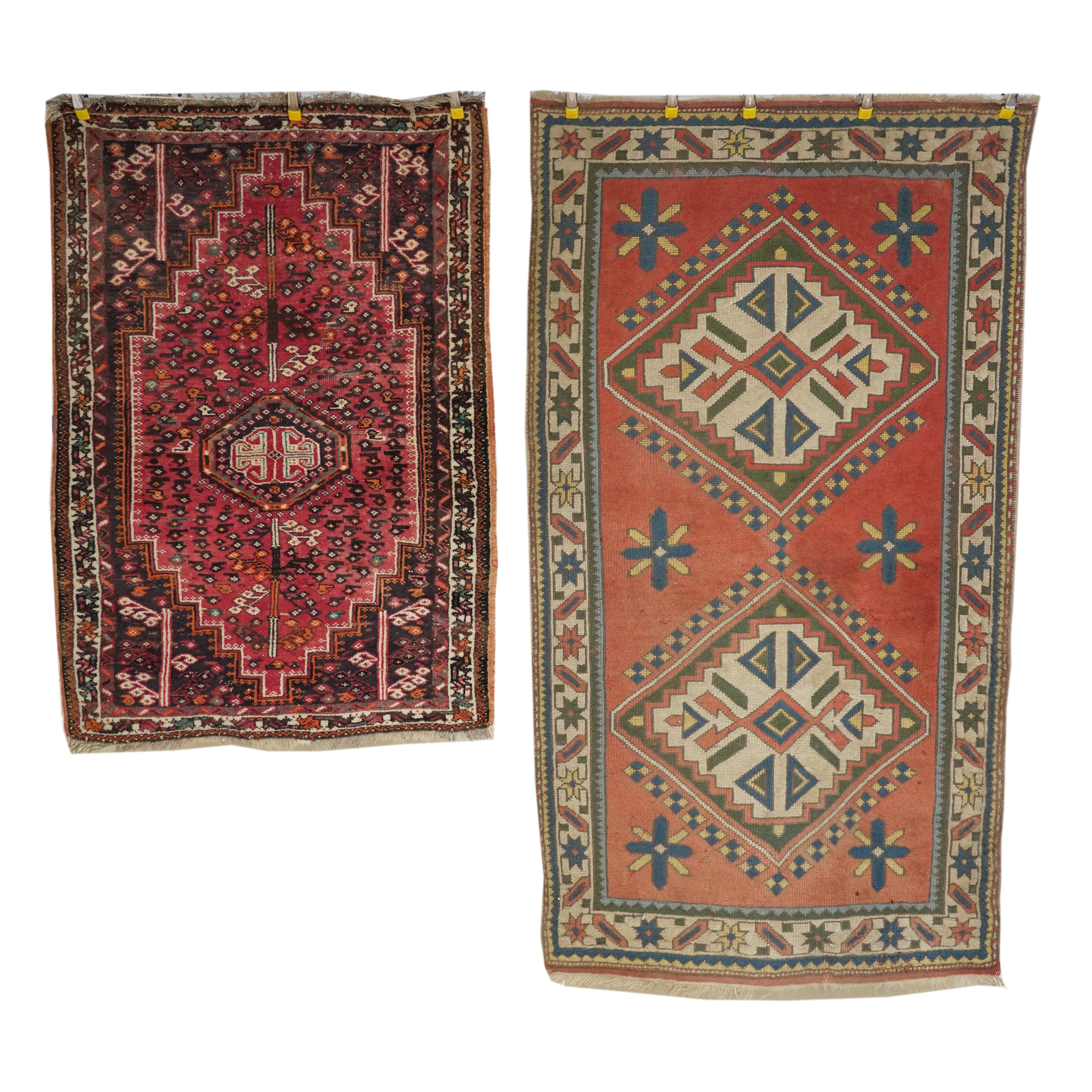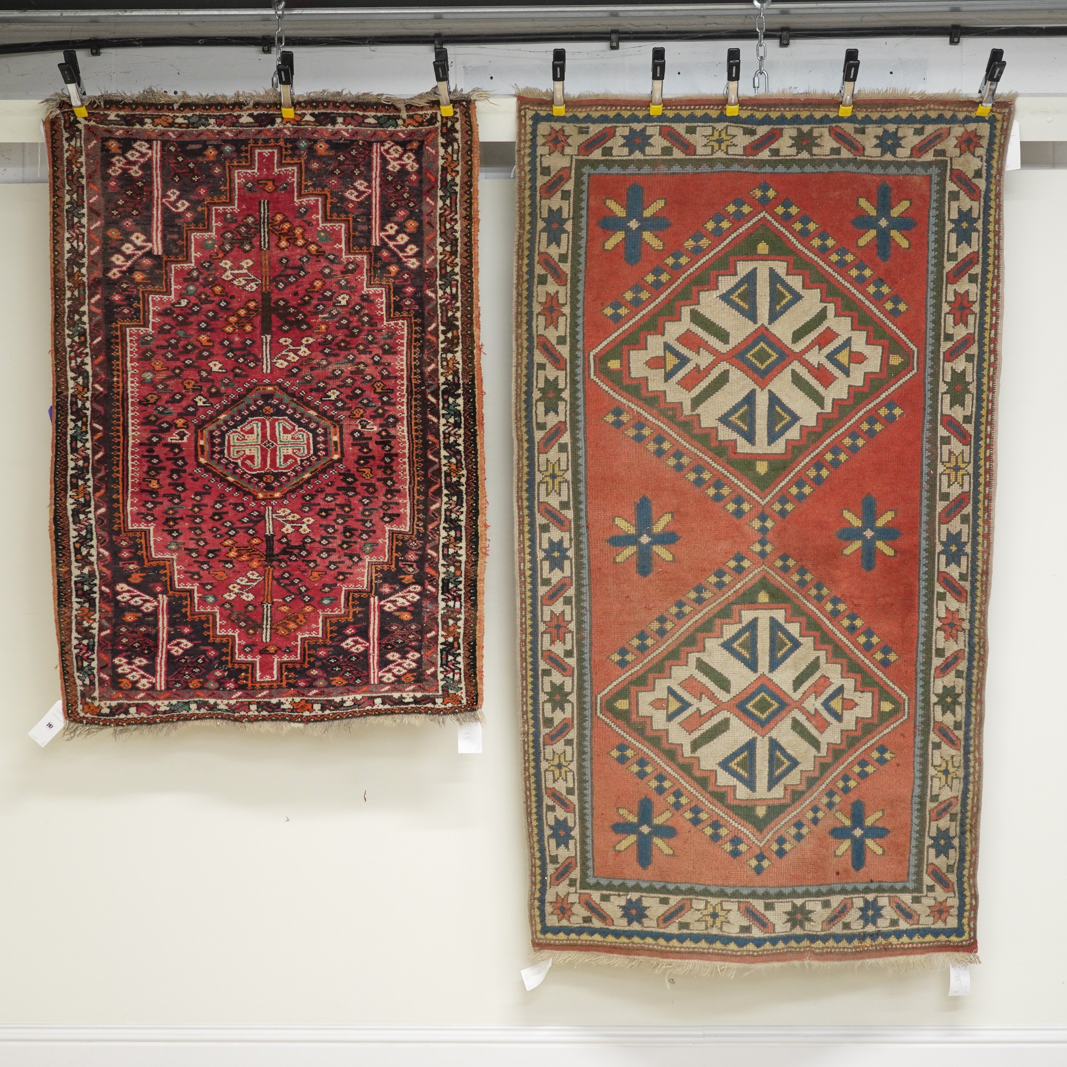 The madder field with a hooked medallion, a charcoal grey surround with minor botehs and a minor ivory flower border, 155 x 107cm, together with a Turkish rug of Kazakh design, Circa 1980s, the madder field with two bold diamond medallions and an ivory star and leaf border, 213 x 124cm.