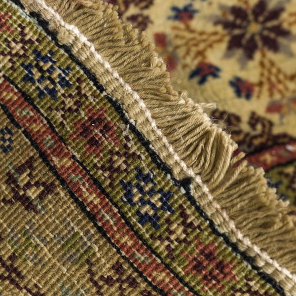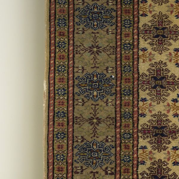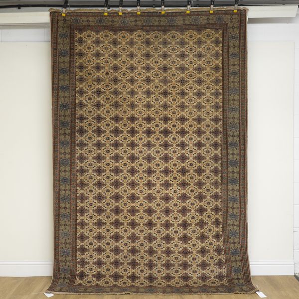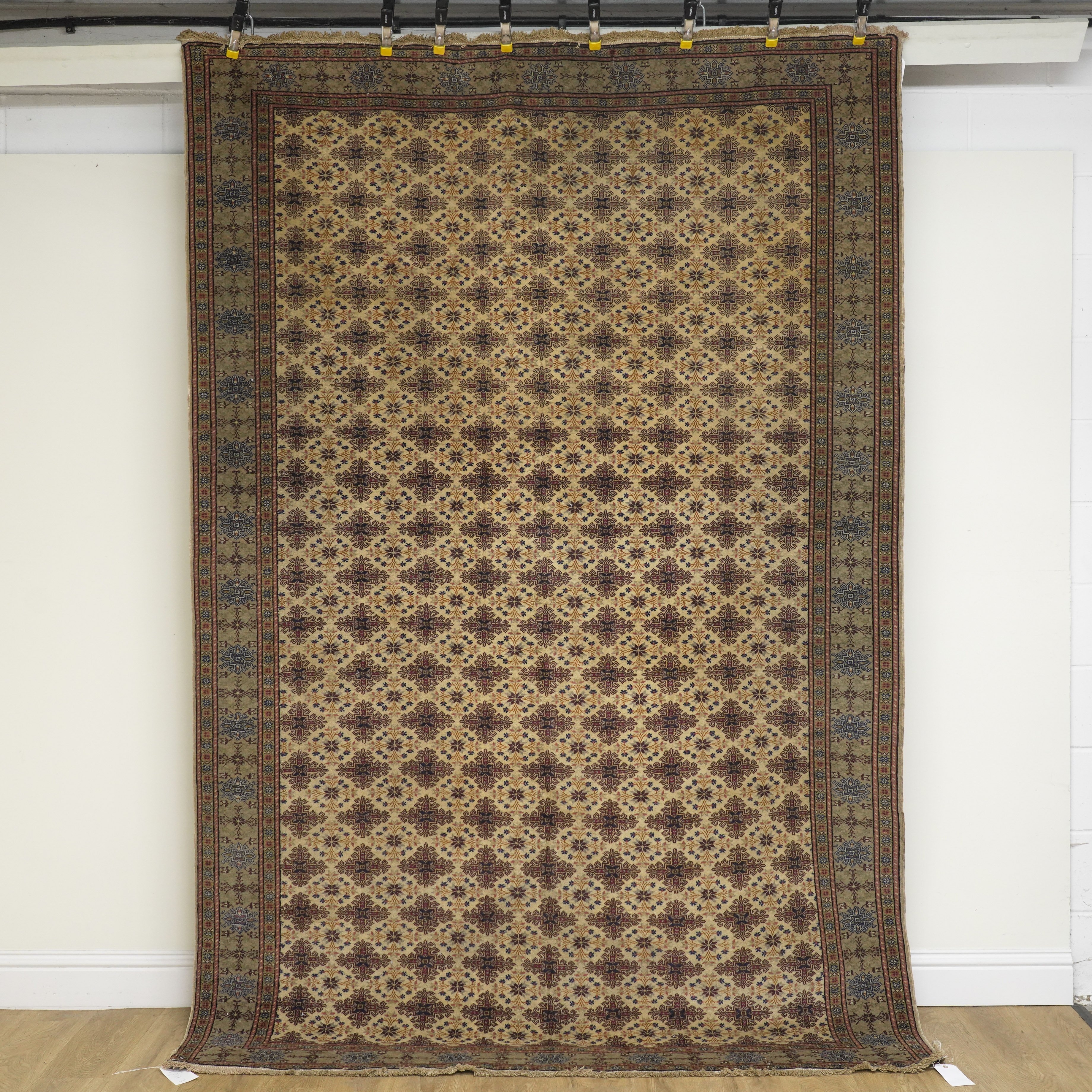 The cream field with rows of hooked crosses and flower heads, the khaki border with single flower heads and floral crosses, 291 x 196cm.
