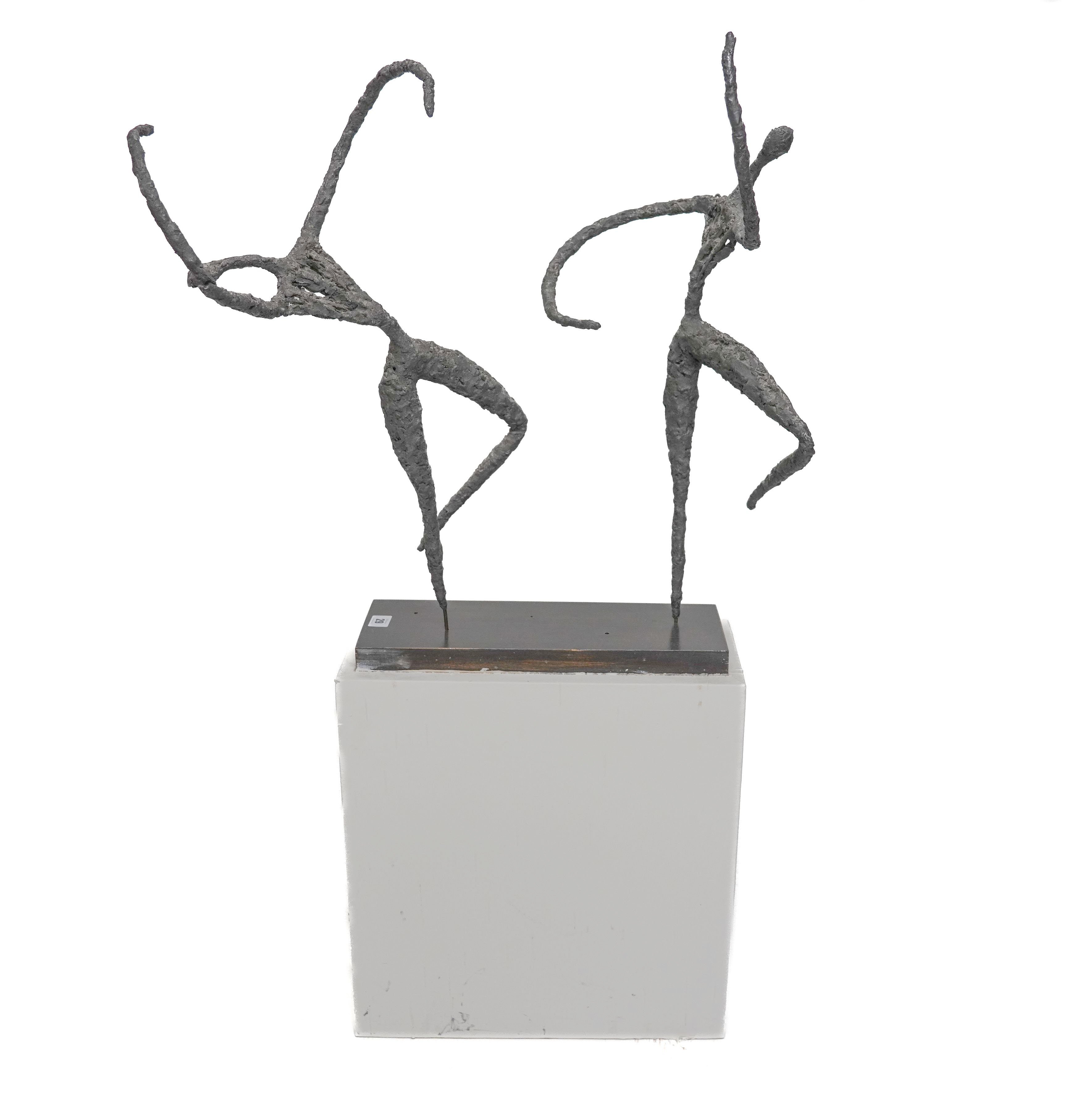 The plaster dancers modelled in motion with arms outstretched, signed on base in chalk, 64cm high, 109cm high including white plinth