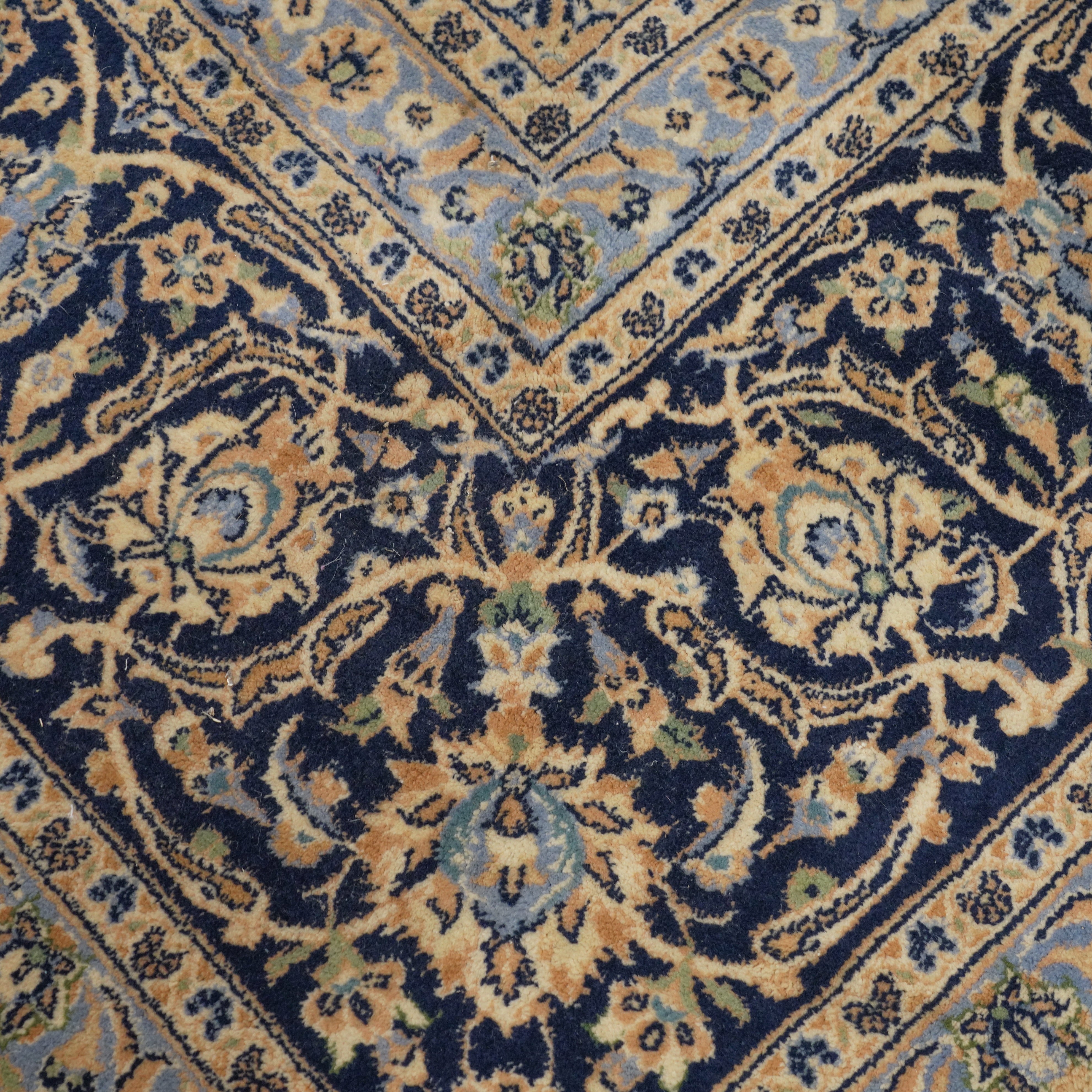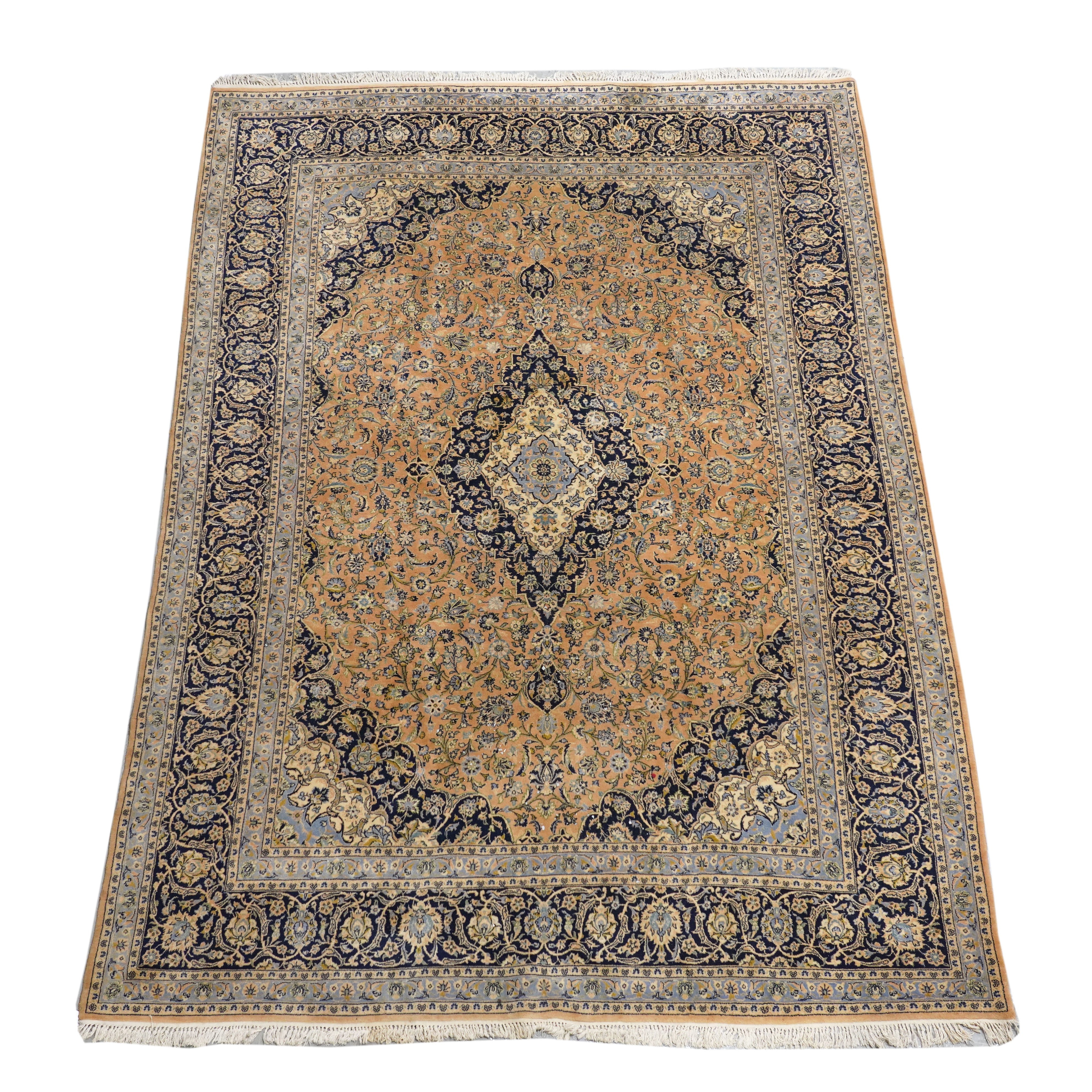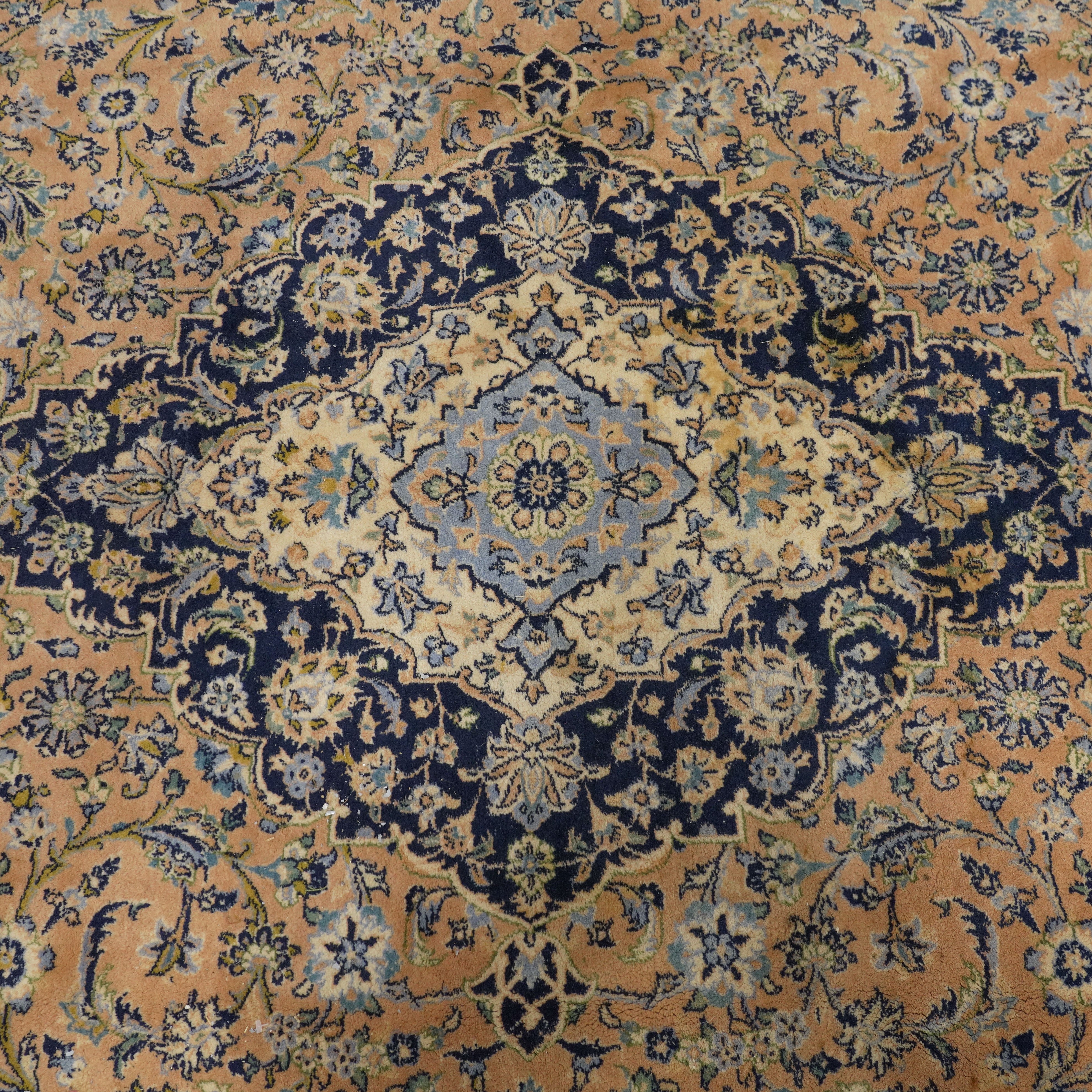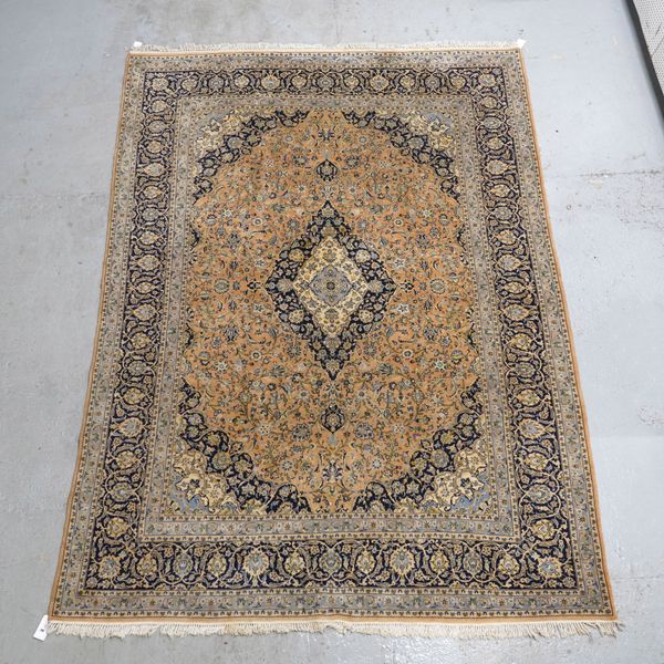 The apricot field with ivory and indigo diamond medallion, matching spandrels all with abundantly floral sprays; a complementary indigo palmette and floral spray border, 406 x 295cm.