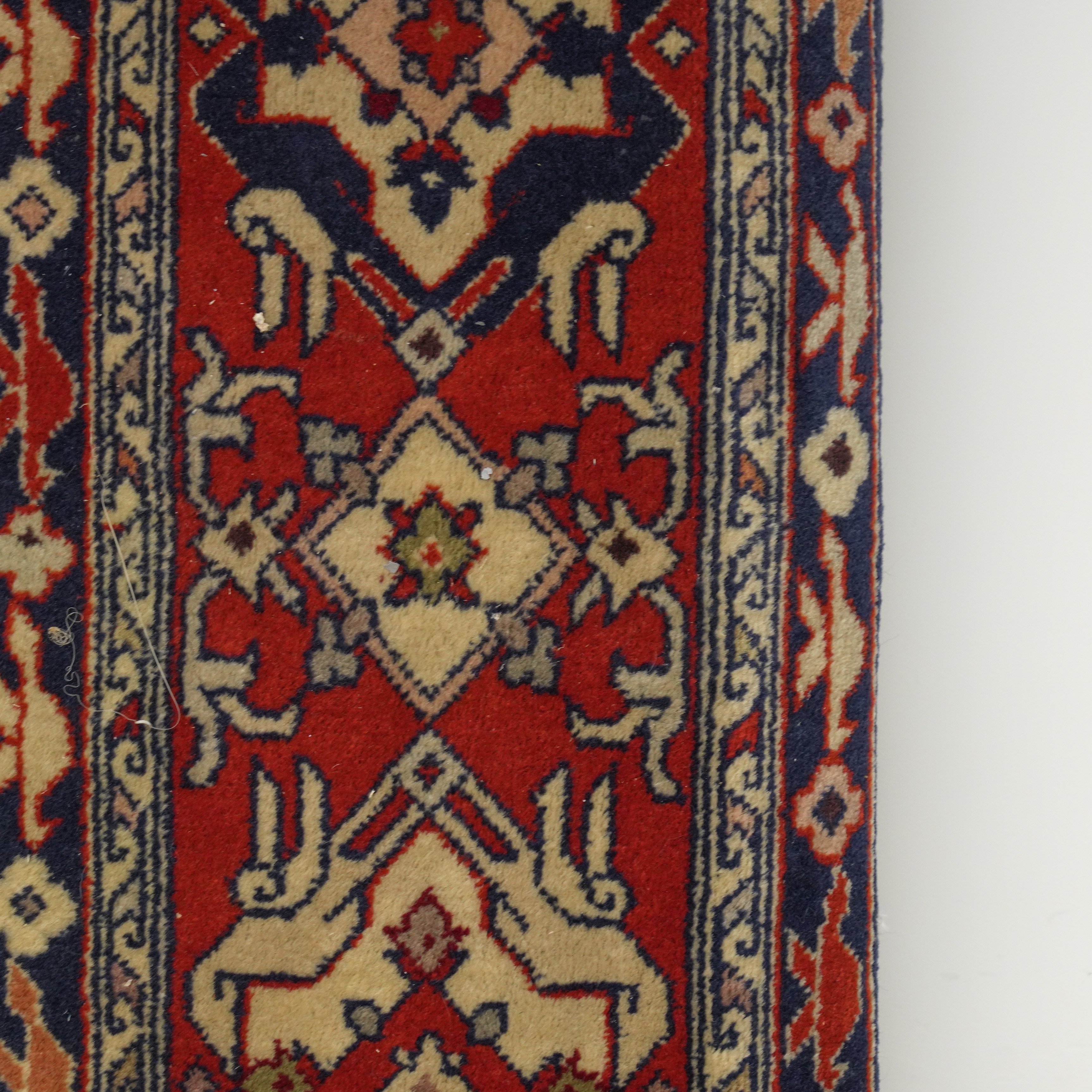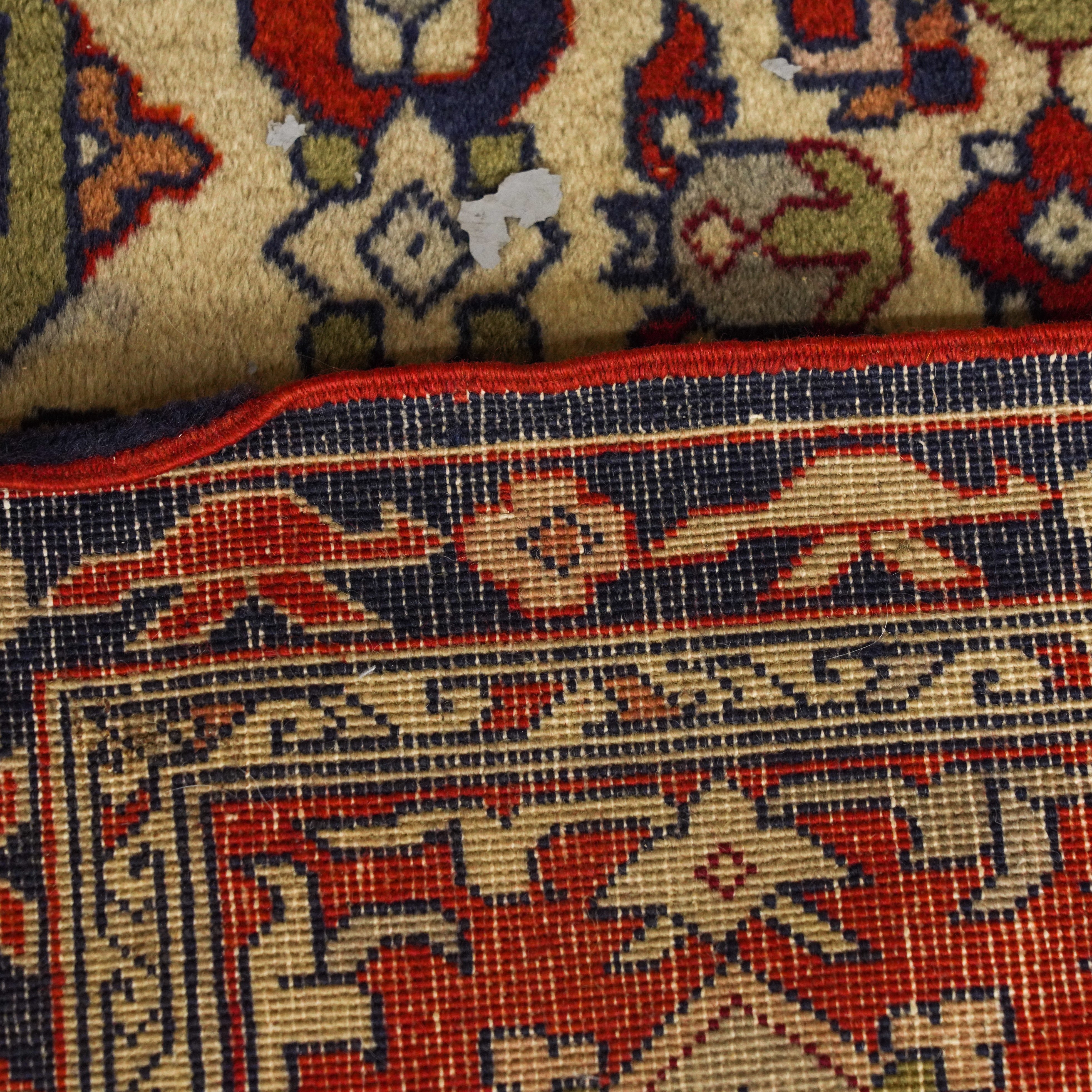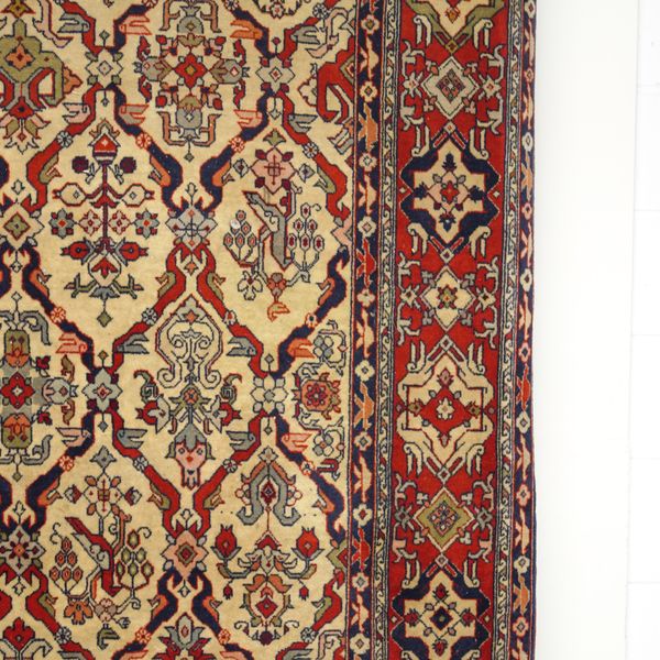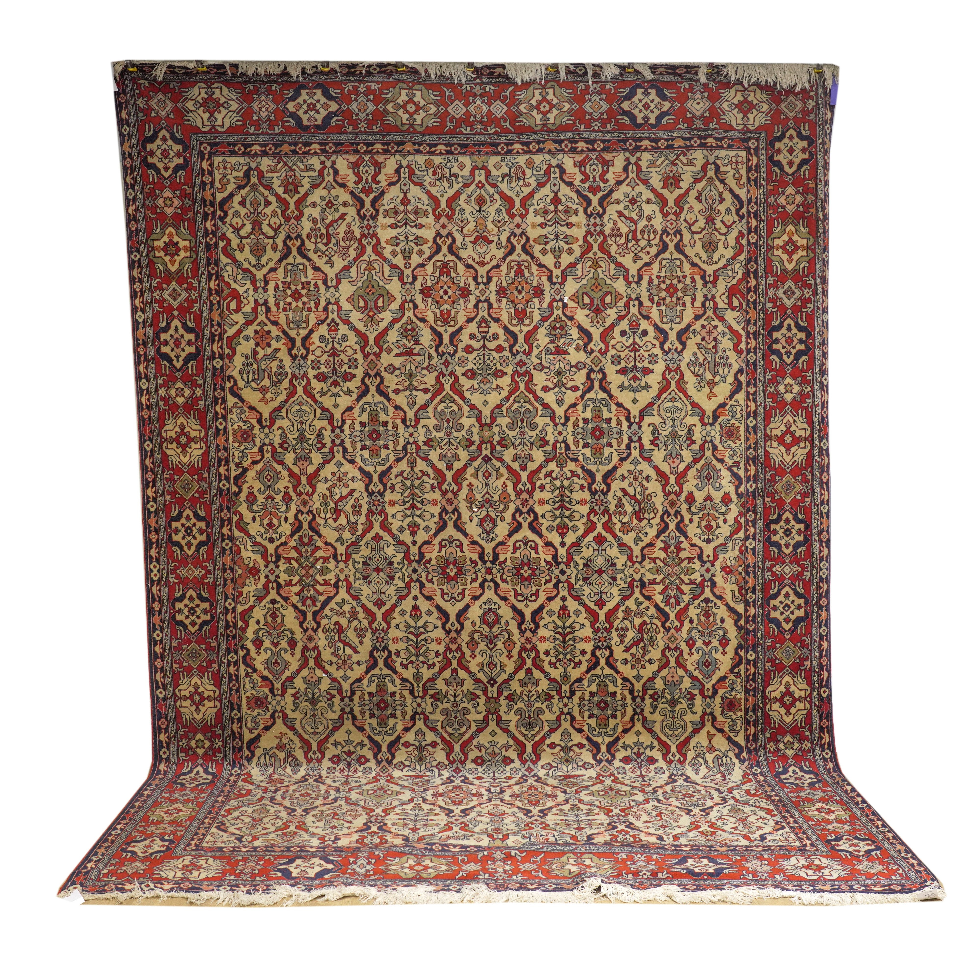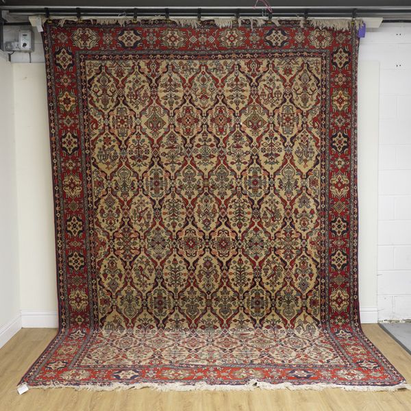 The ivory field with an indigo and madder trellis, each section bearing a stylised flowering plant, some birds, a madder palmette and bracket border, 394 X 270cm.