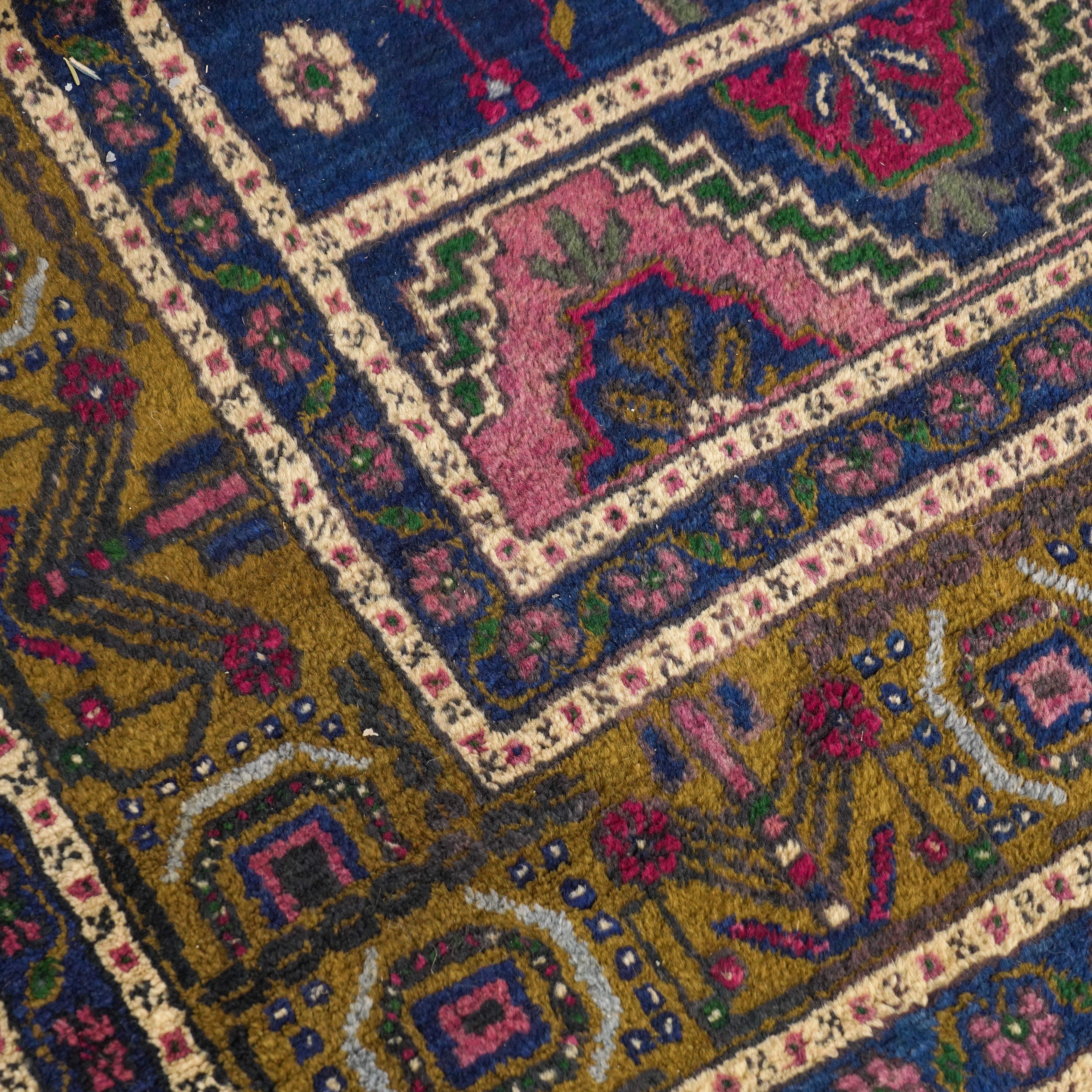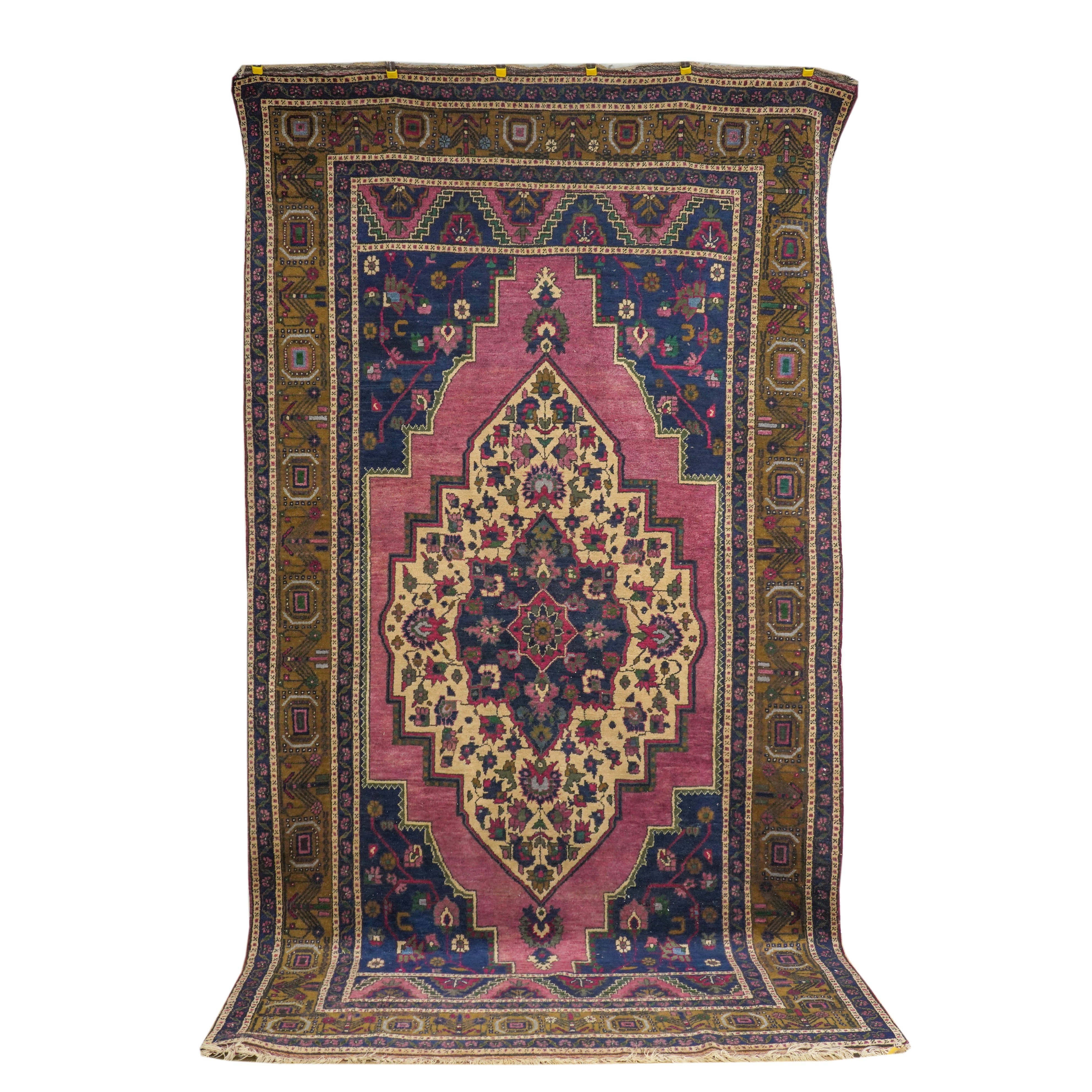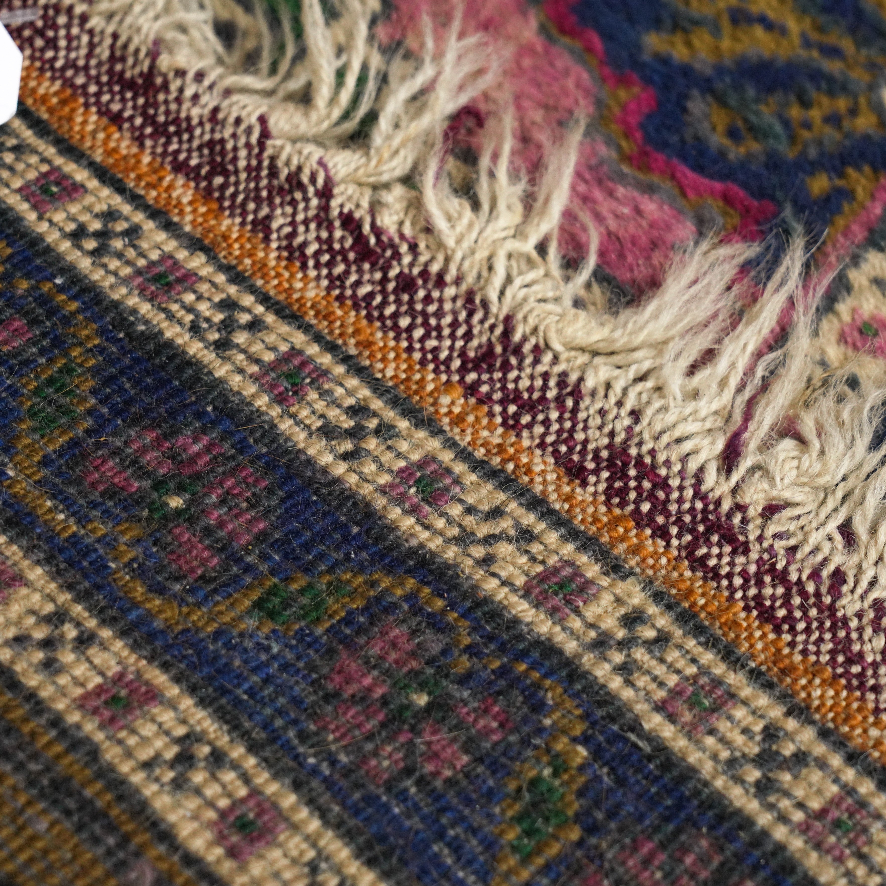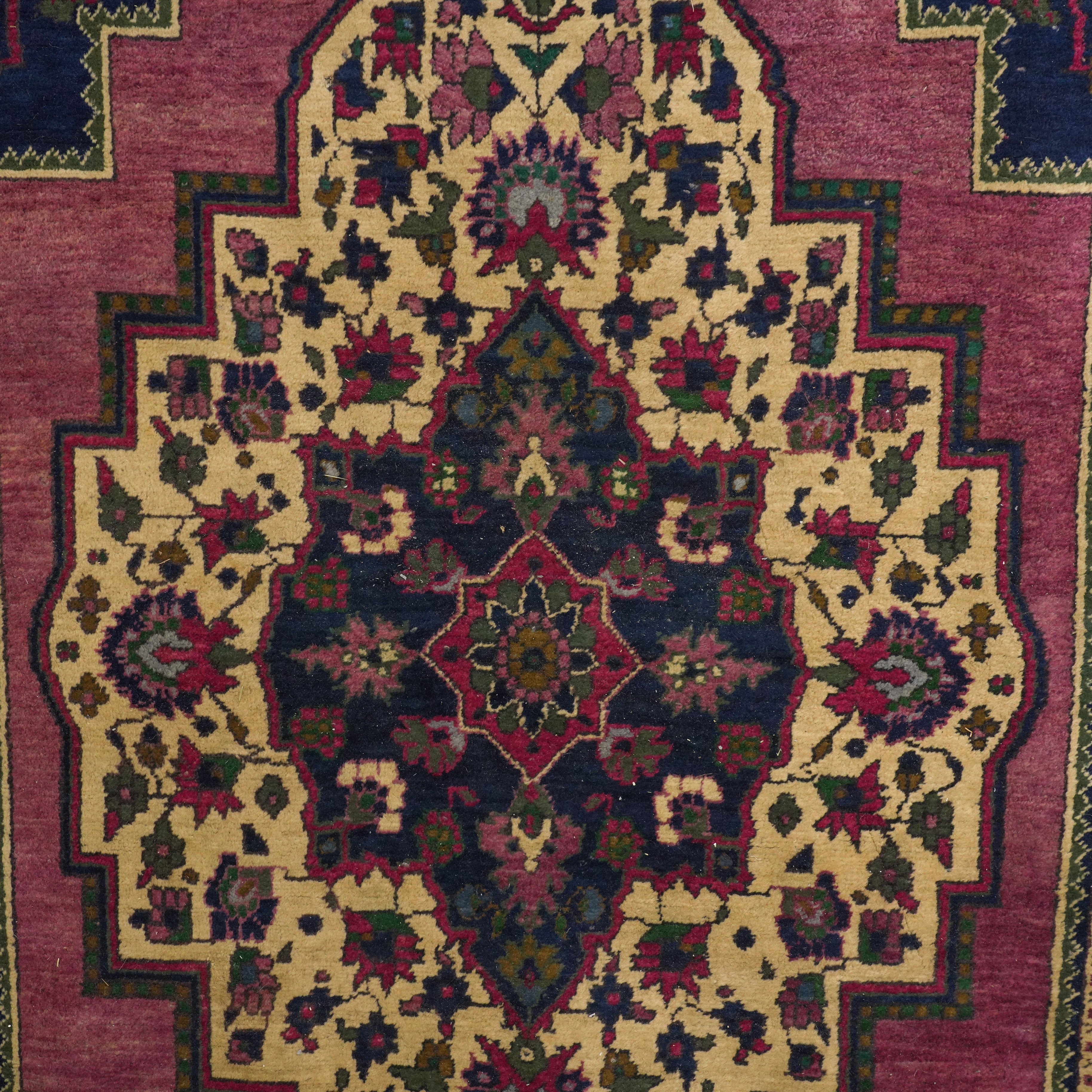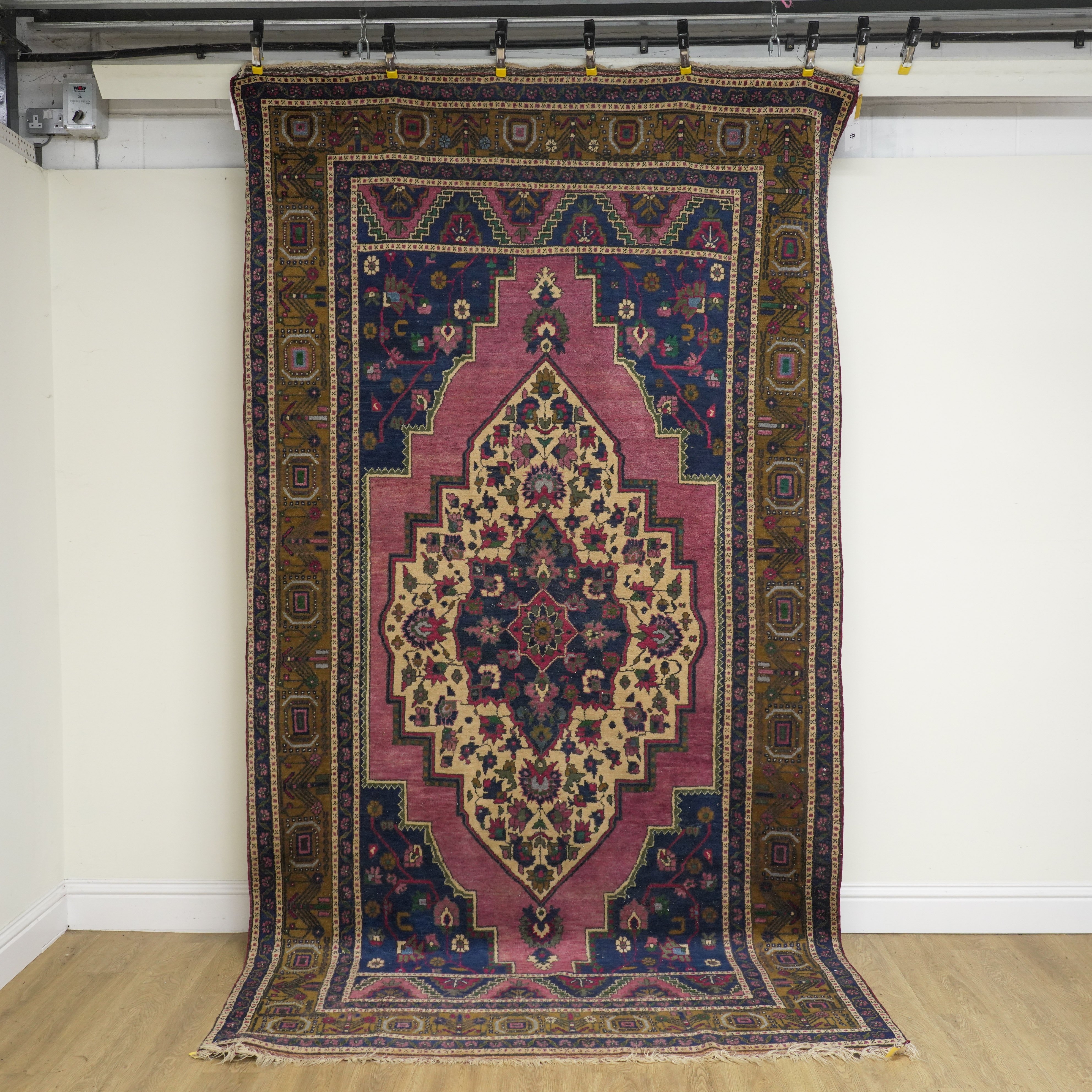 The plain plum coloured field with a bold ivory and indigo medallion, indigo spandrels with floral sprays, a narrow panel to each end and a khaki flowering plant border, 338 x 178cm.