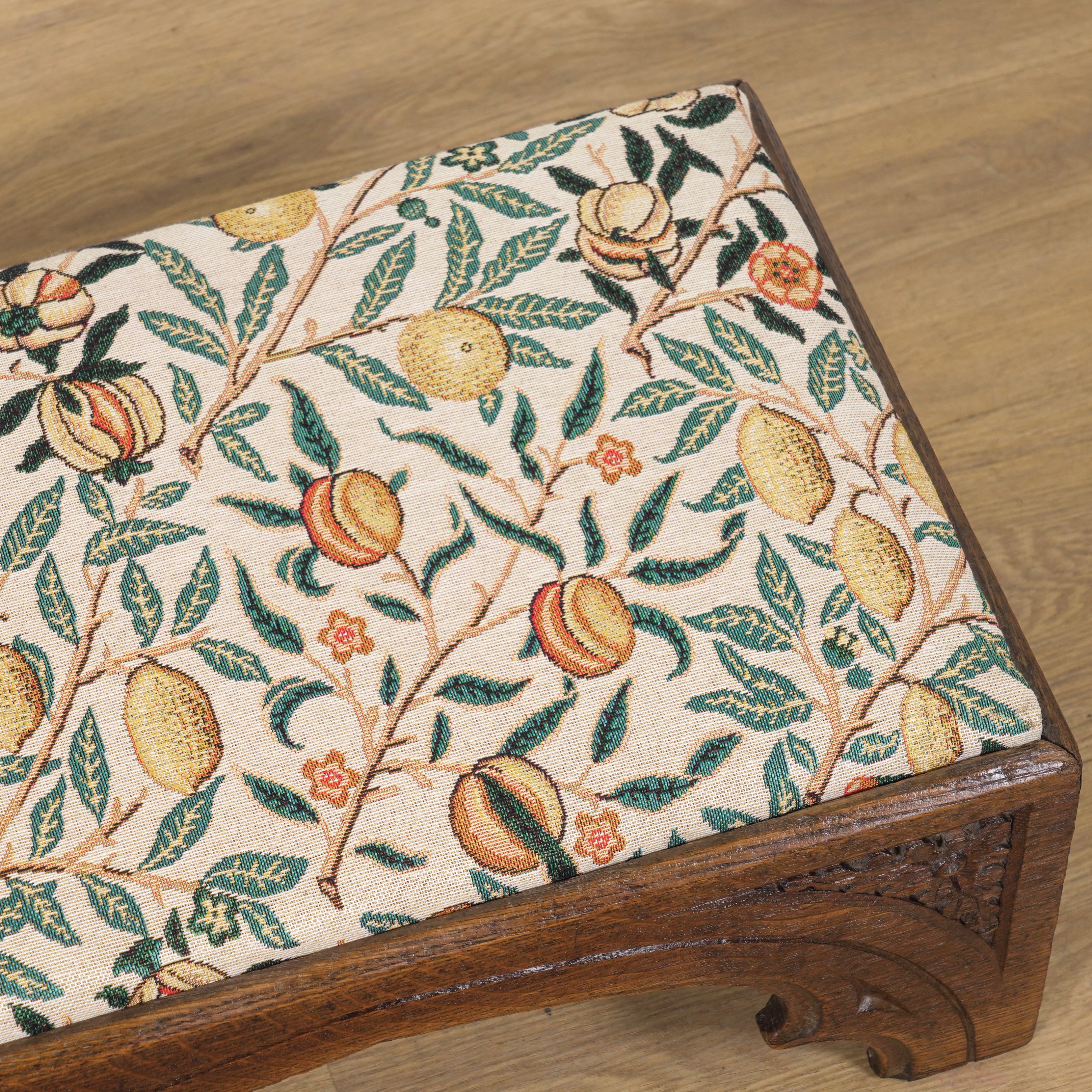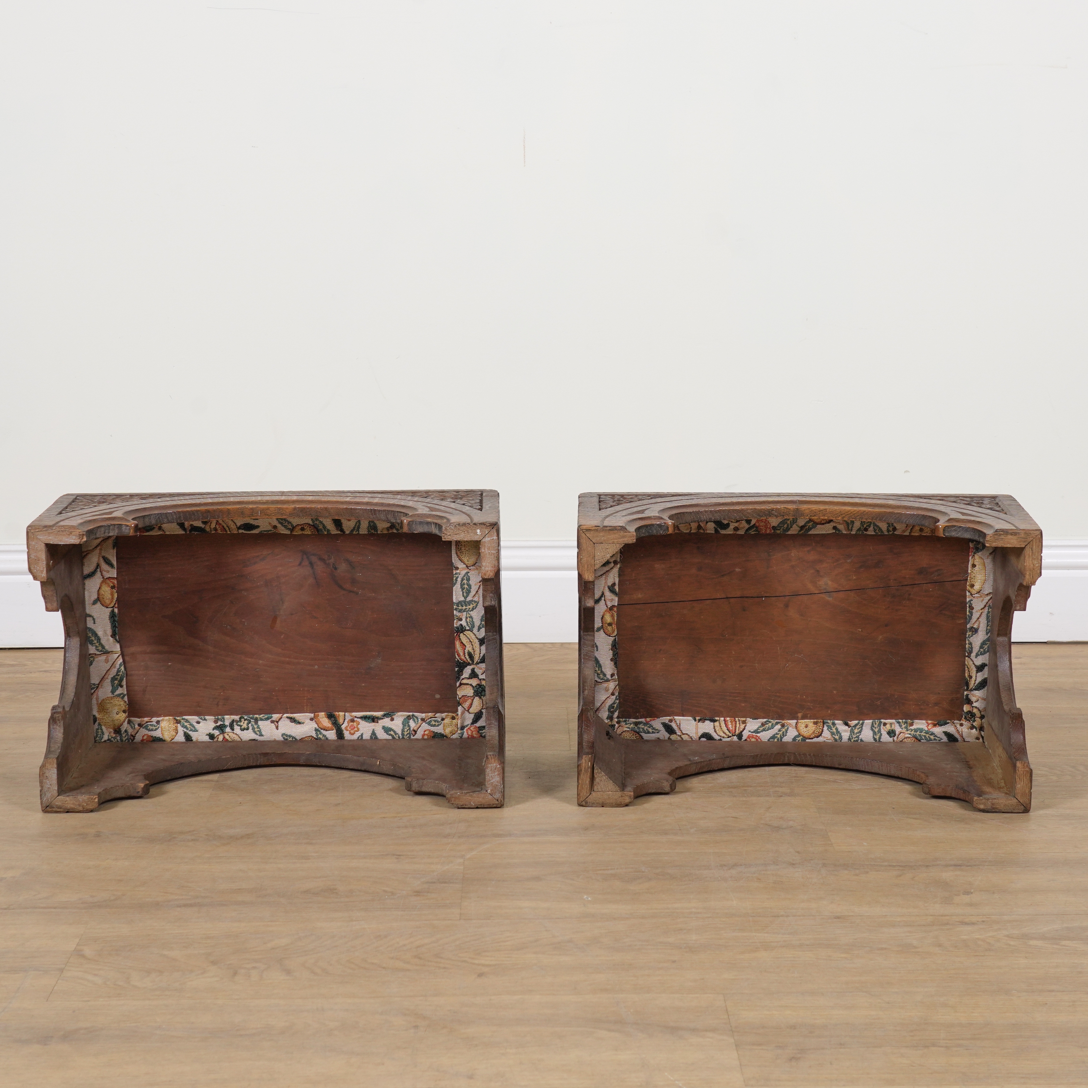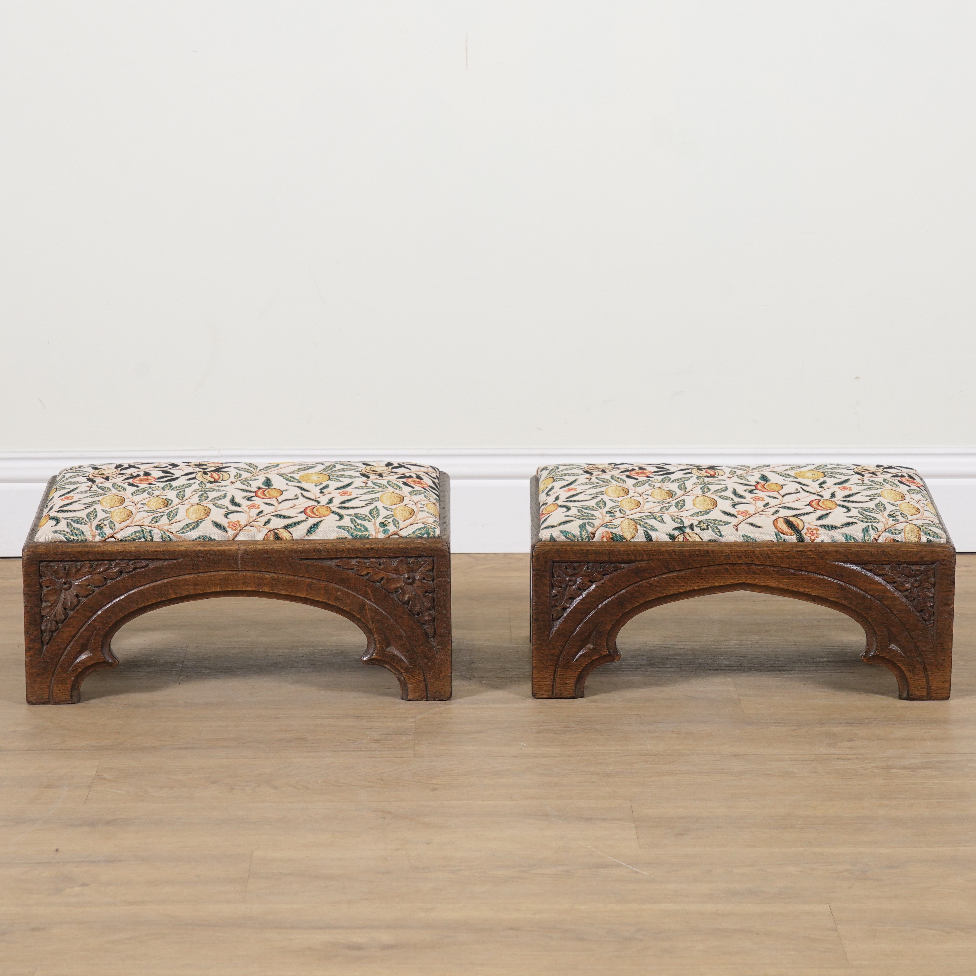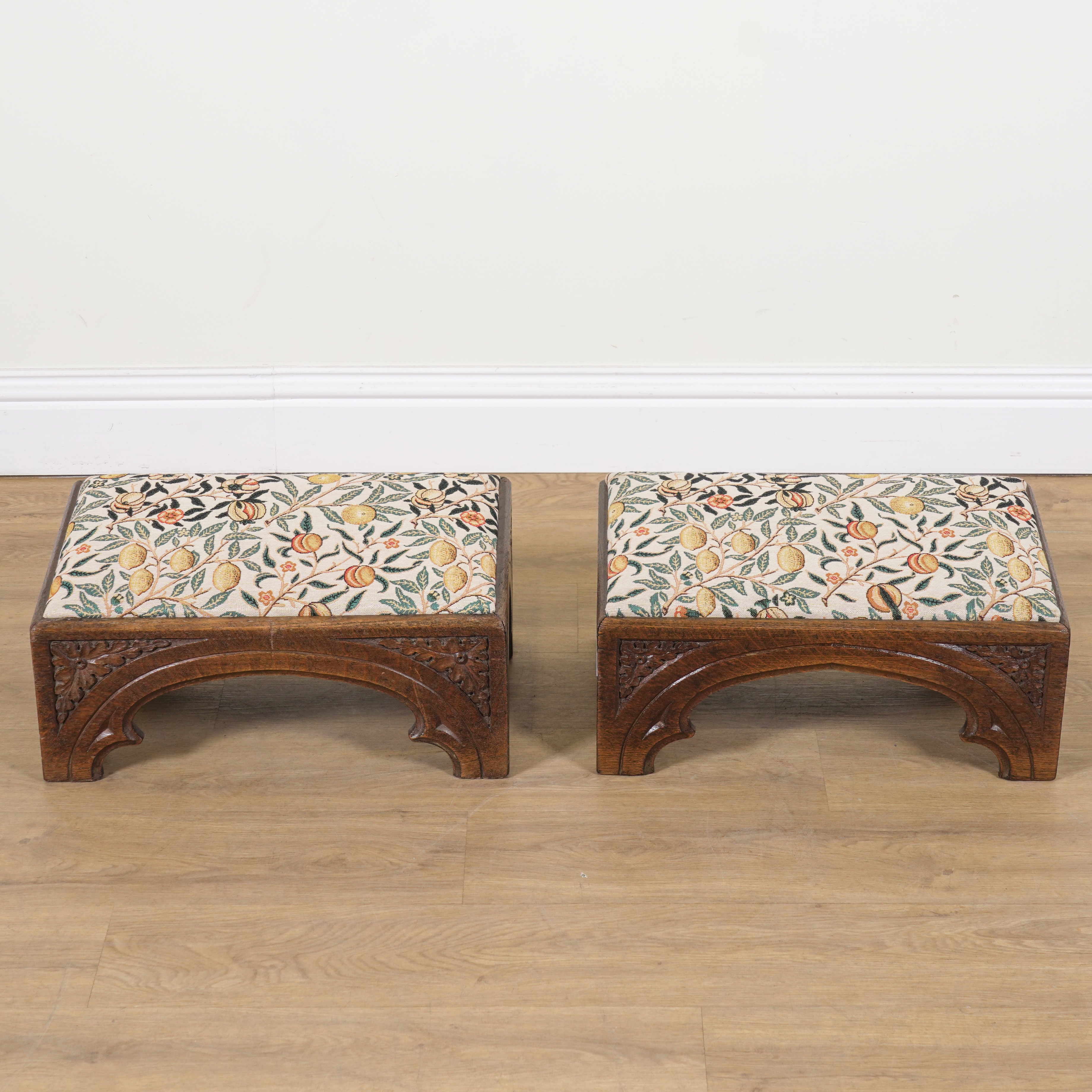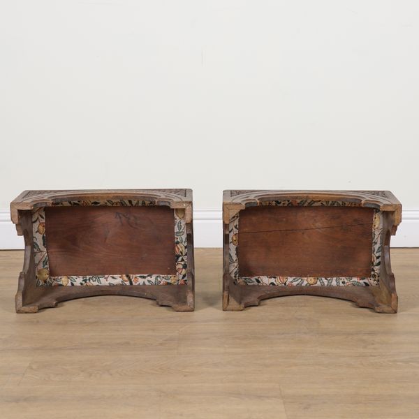 A PAIR OF VICTORIAN AND LATER GOTHIC REVIVAL RECTANGULAR FOOTSTOOLS (2)