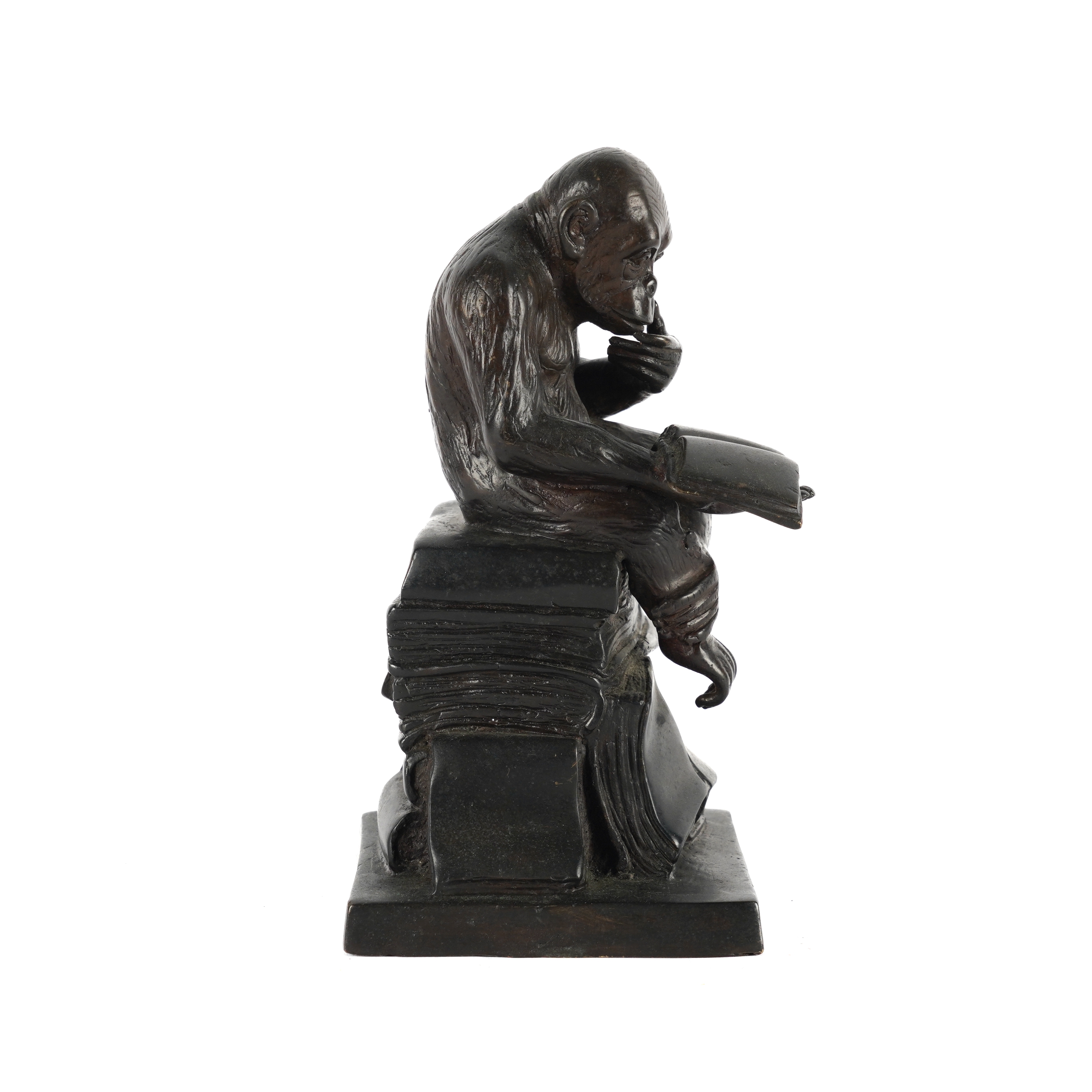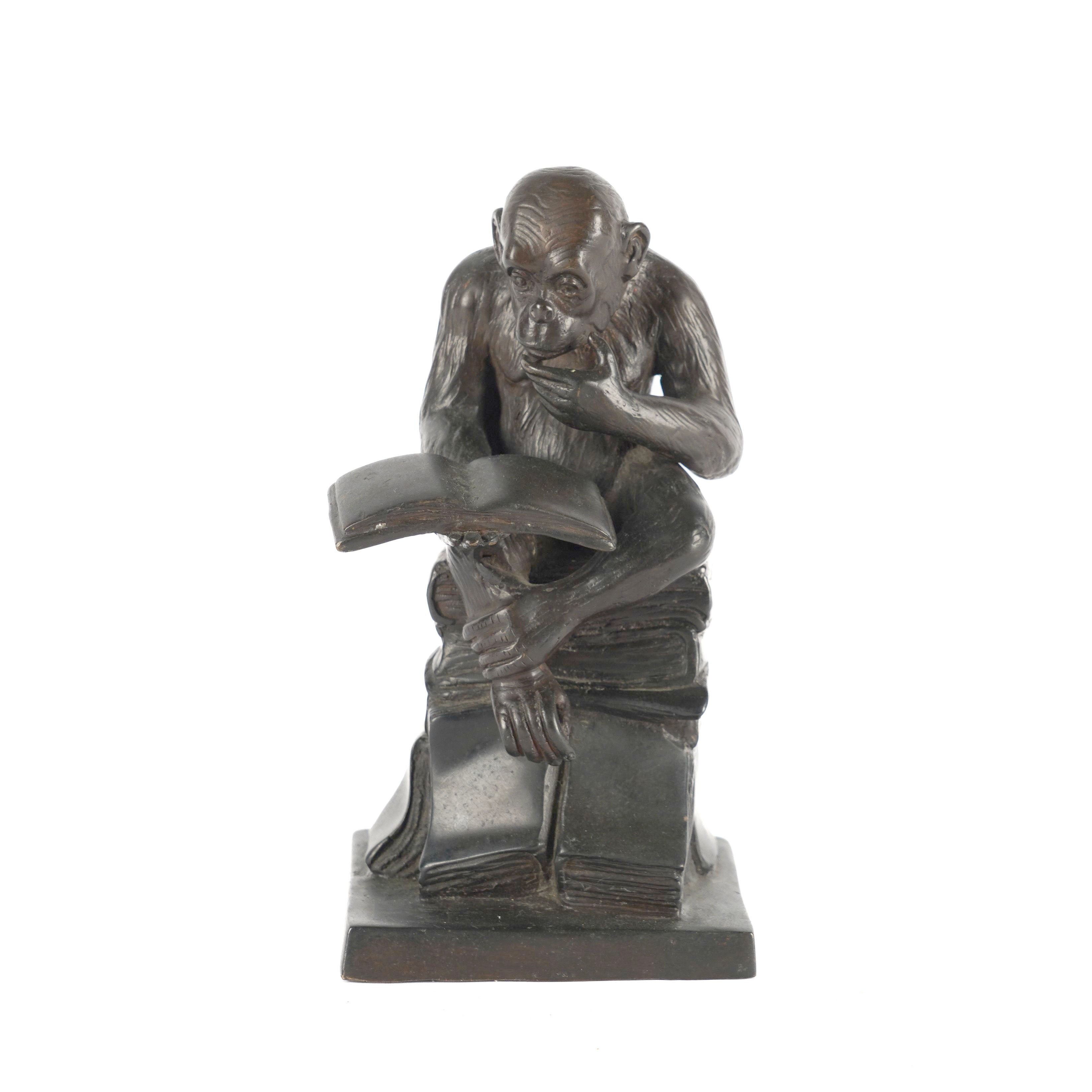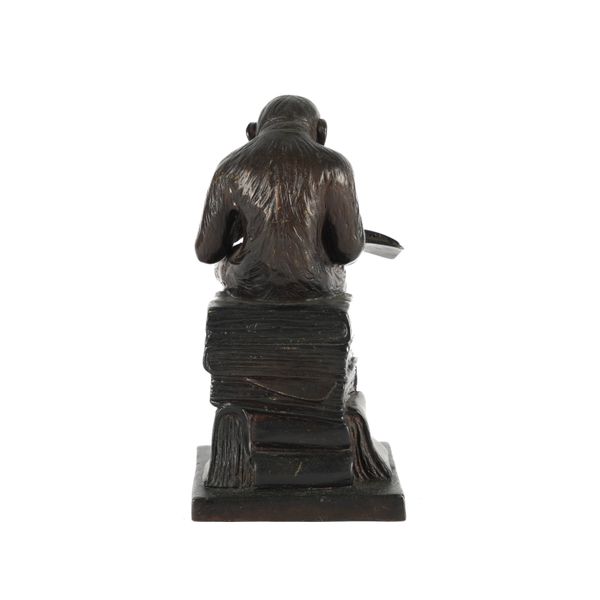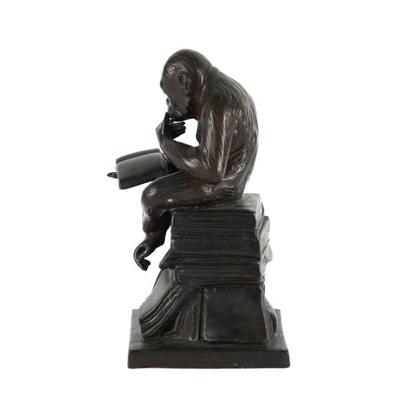 A PATINATED BRONZE FIGURE OF A MONKEY READING