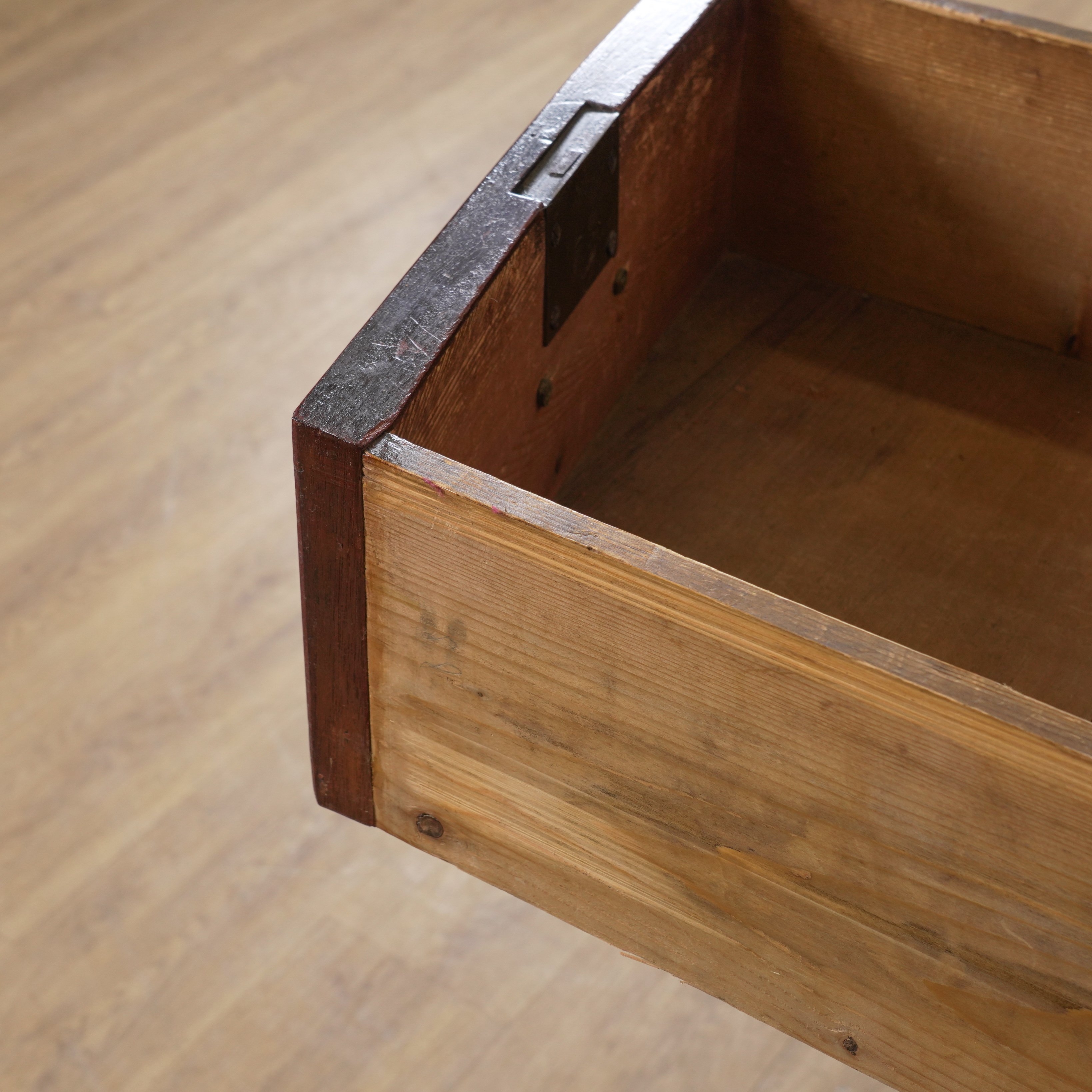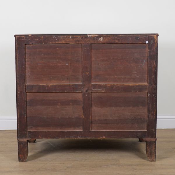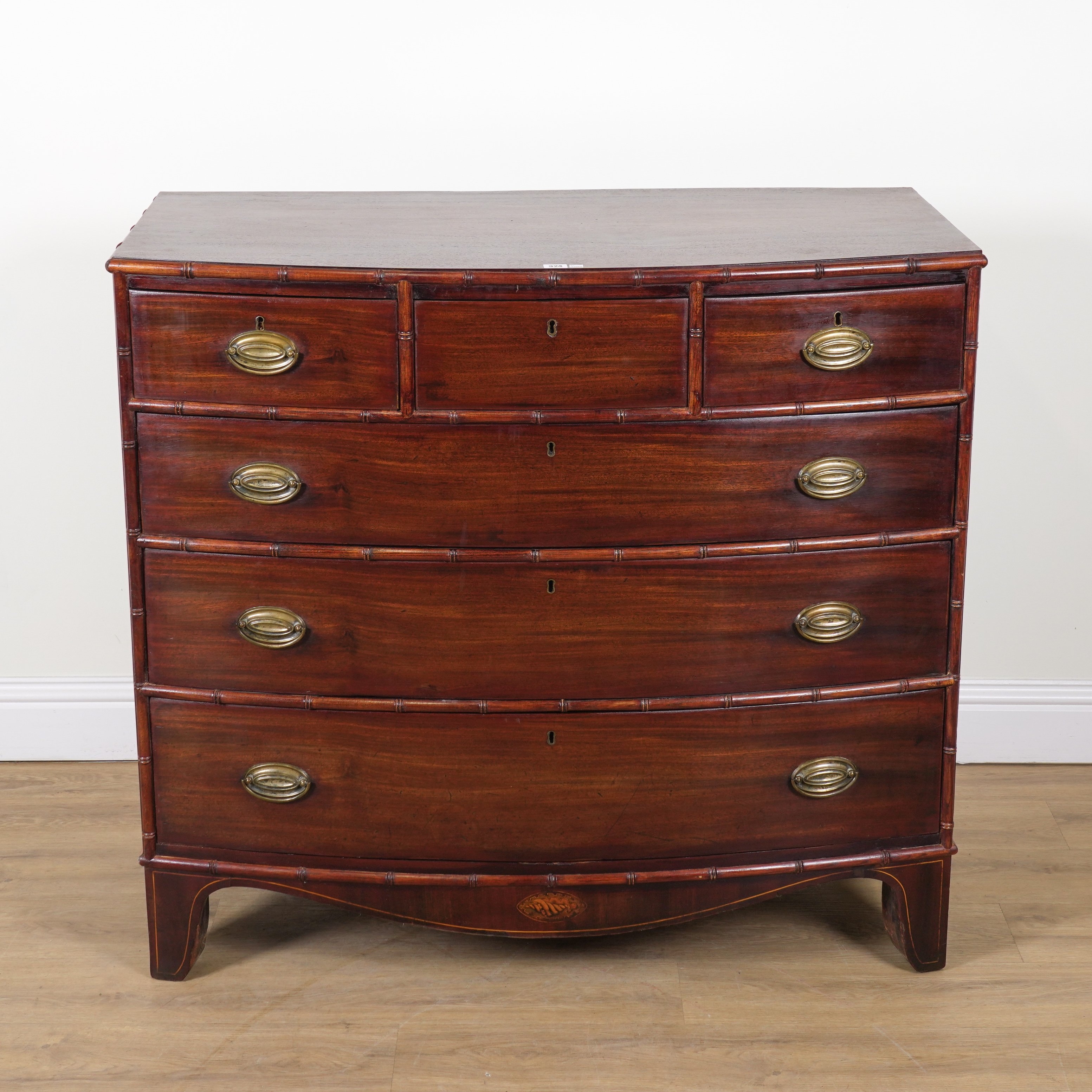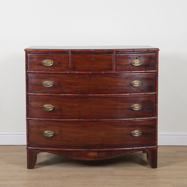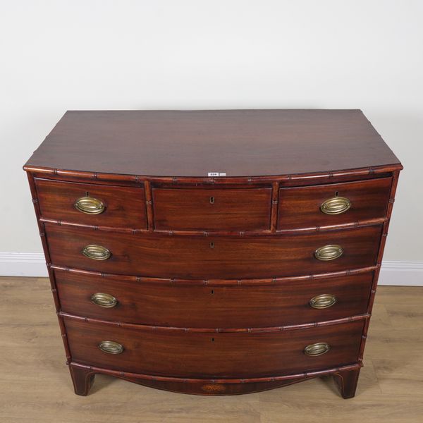 With three short drawers over three long graduated drawers, divided by split faux bamboo moulding, 118cm wide; 59cm deep; 108cm high