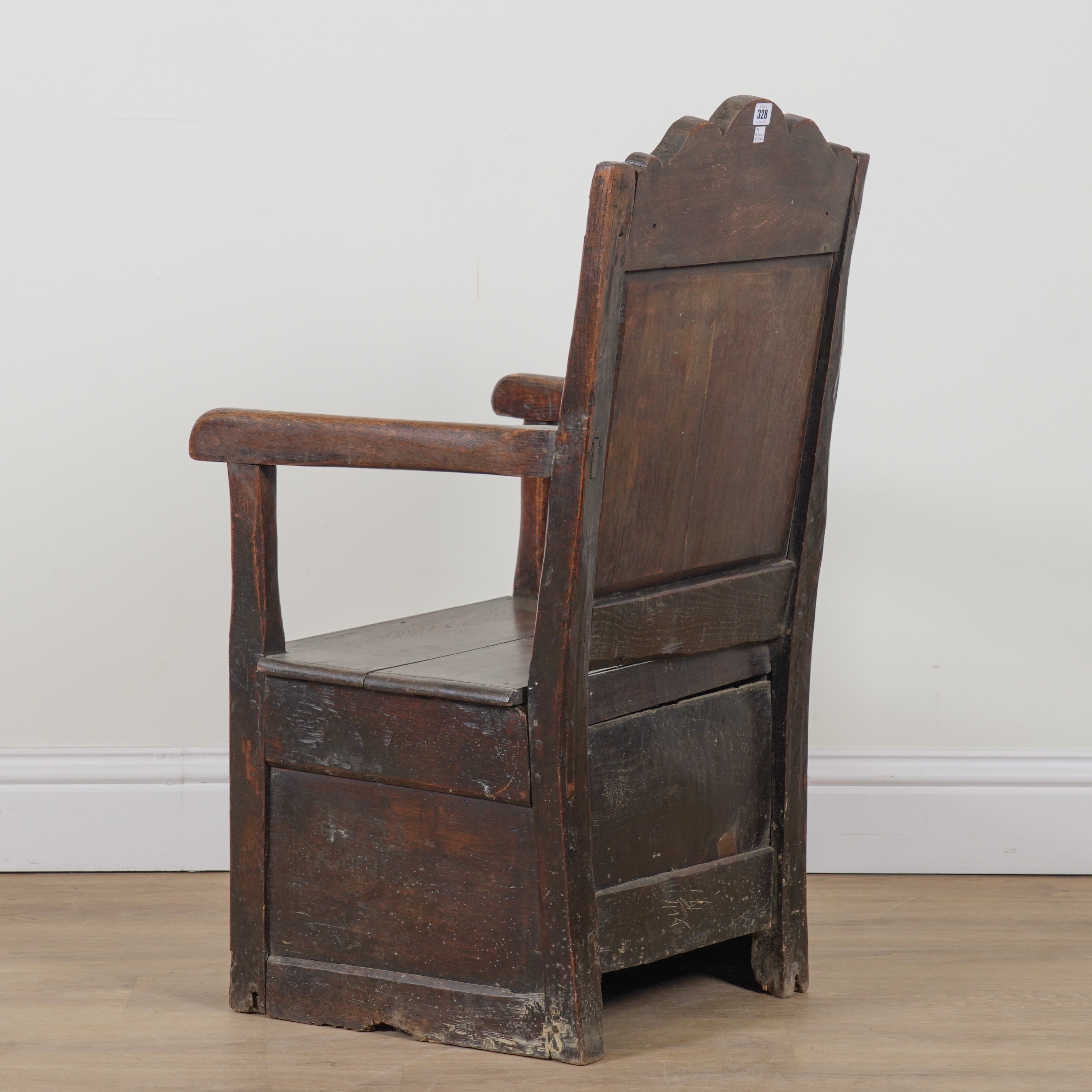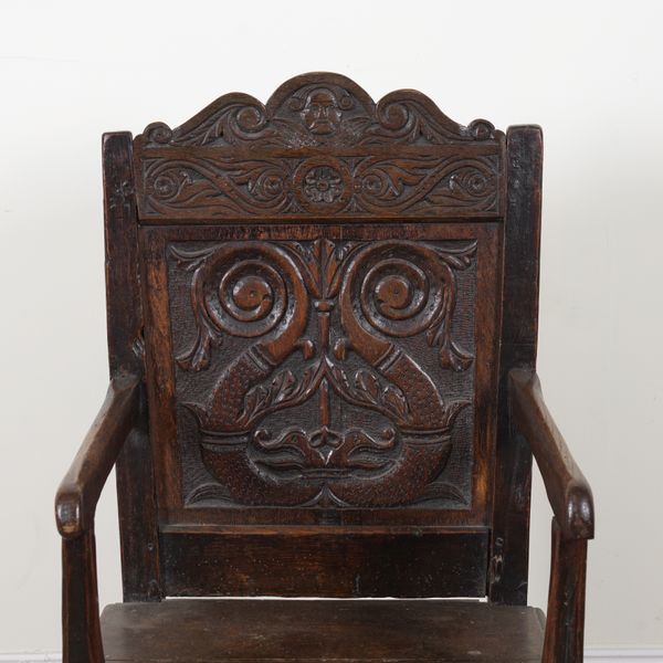 A 17TH CENTURY AND LATER OAK WAINSCOT OPEN ARMCHAIR