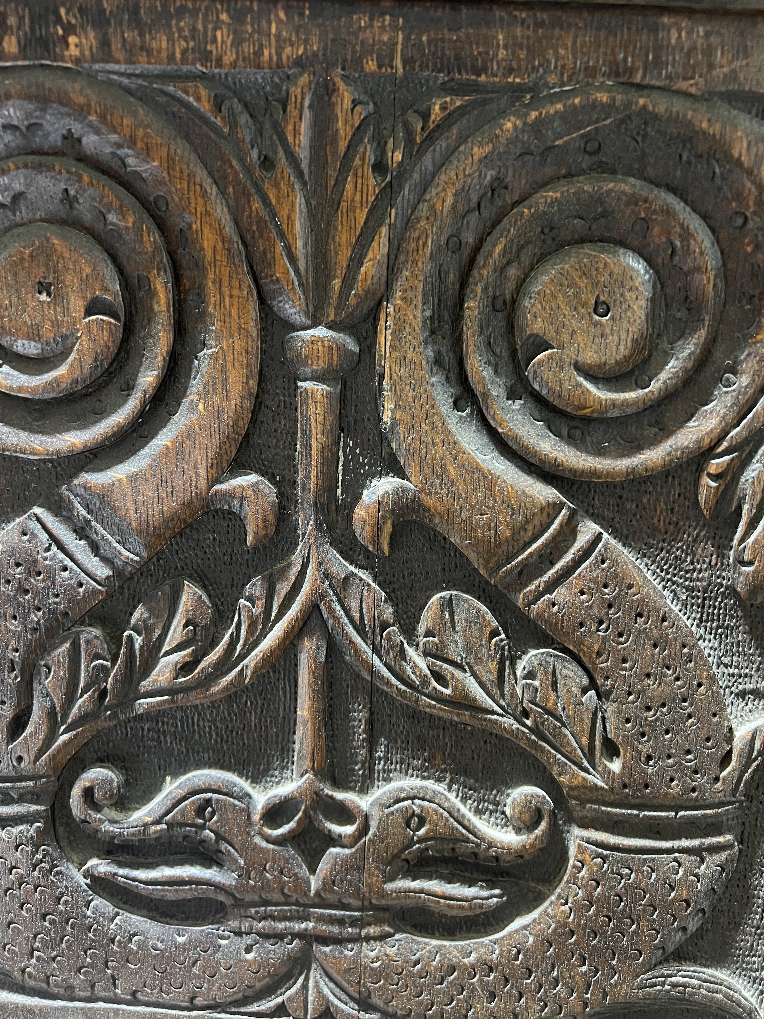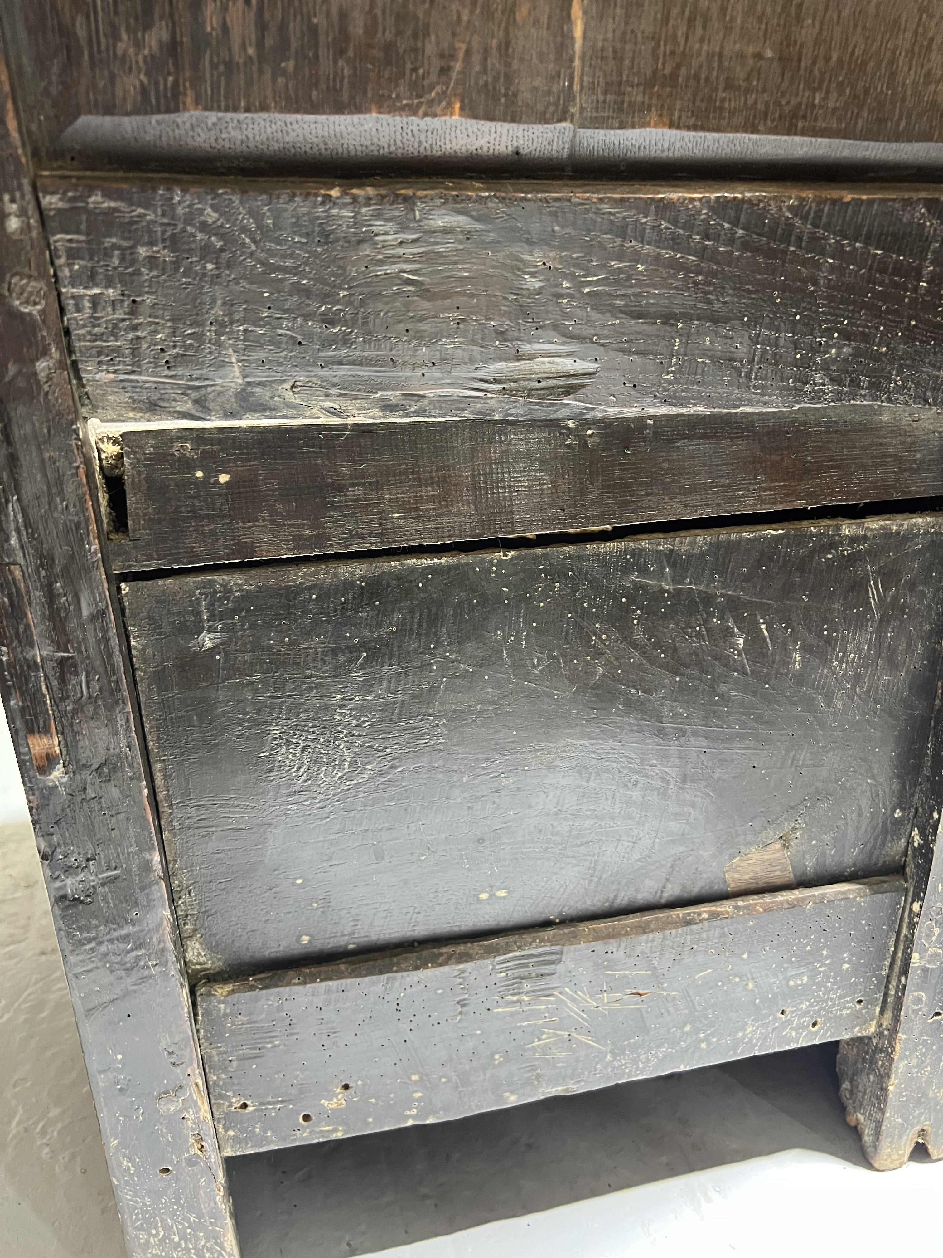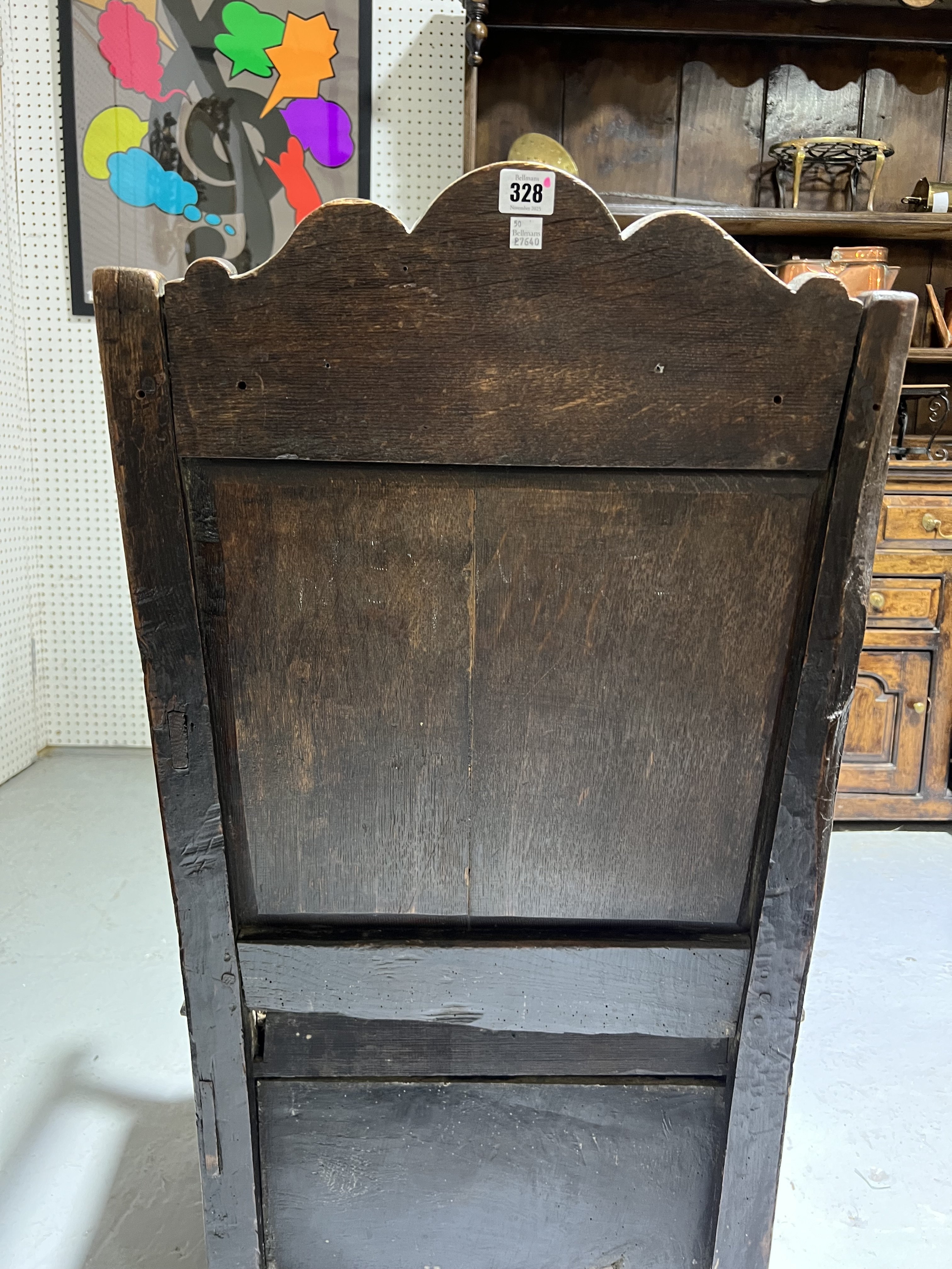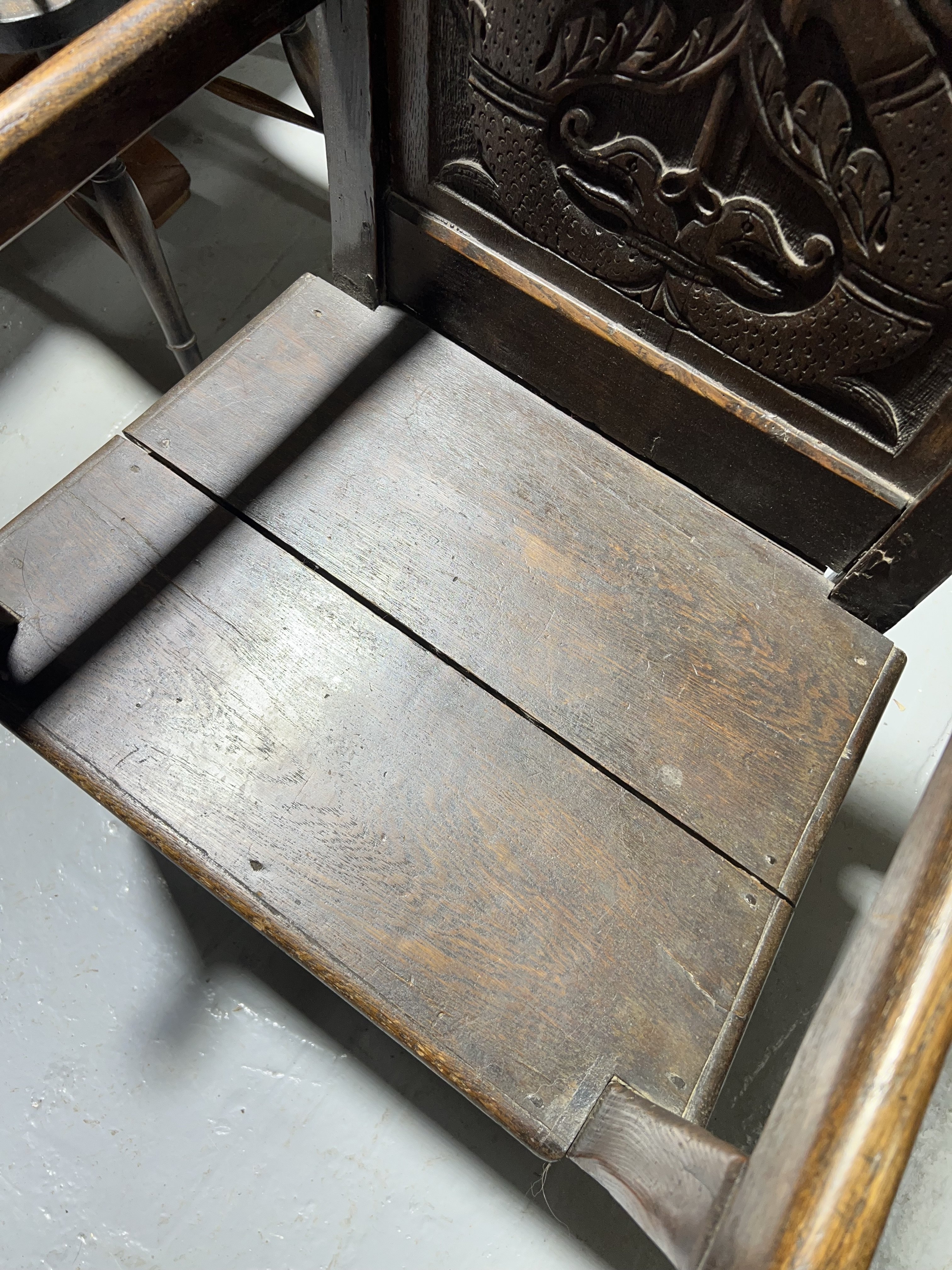 old marks and scratches expected with the age, panelled back and carved top rail are later, split to the seat, traces of old wood worm, frame/ joins are loose so some movement to the frame.
