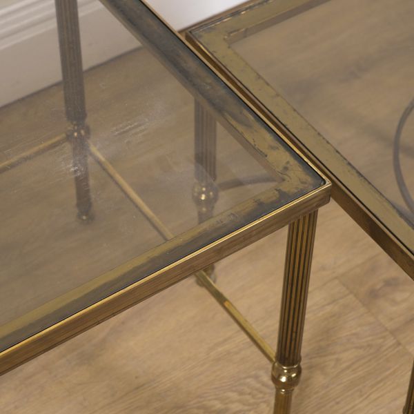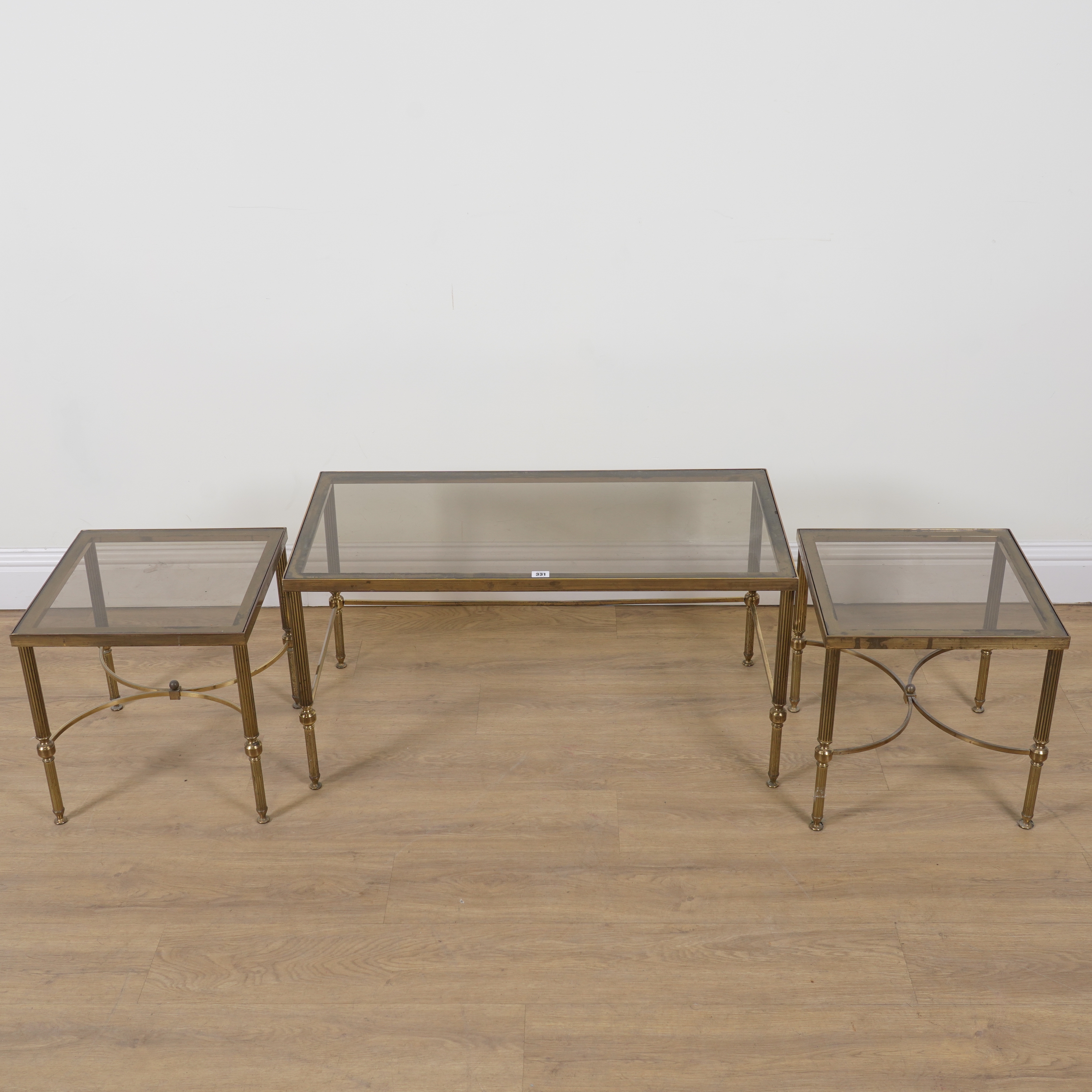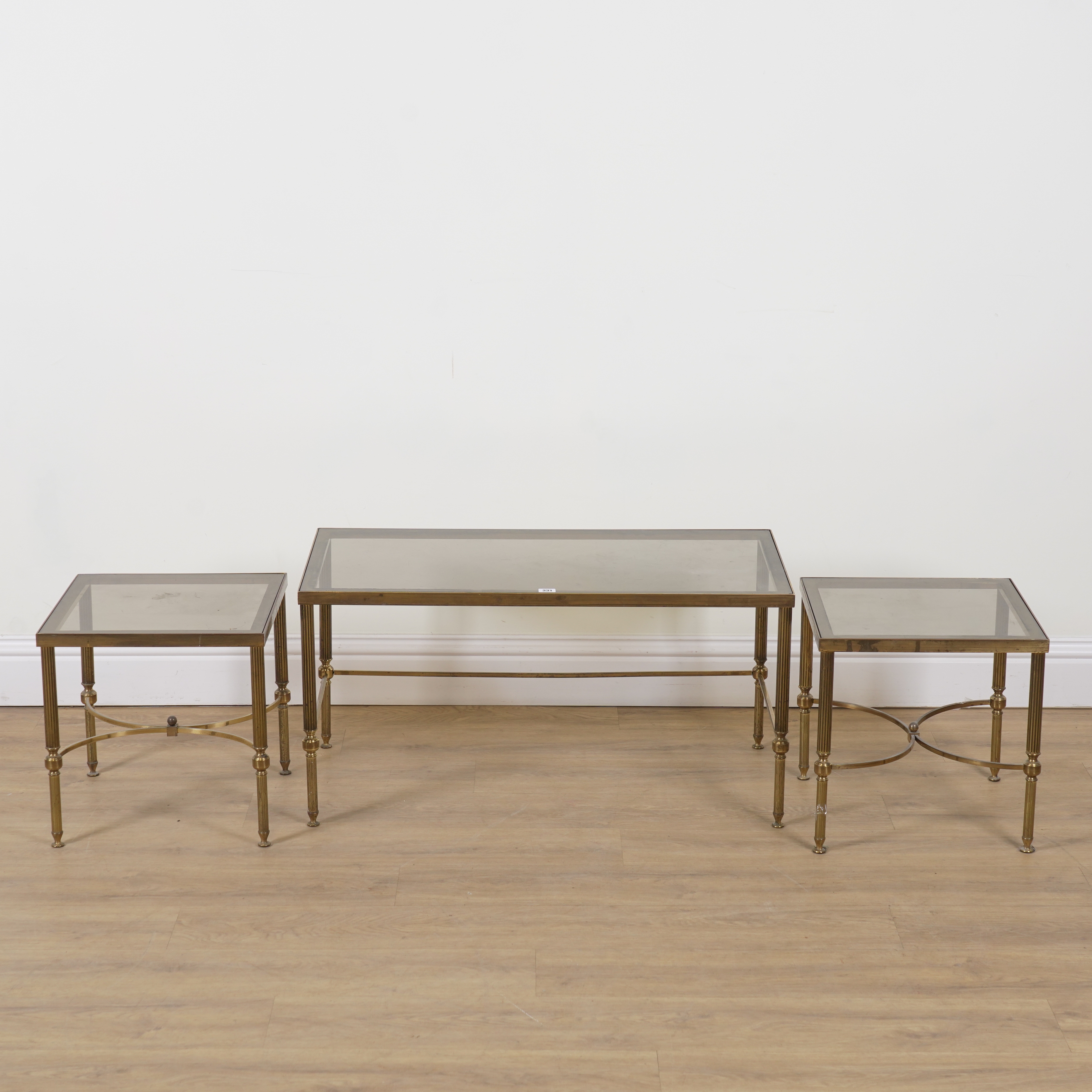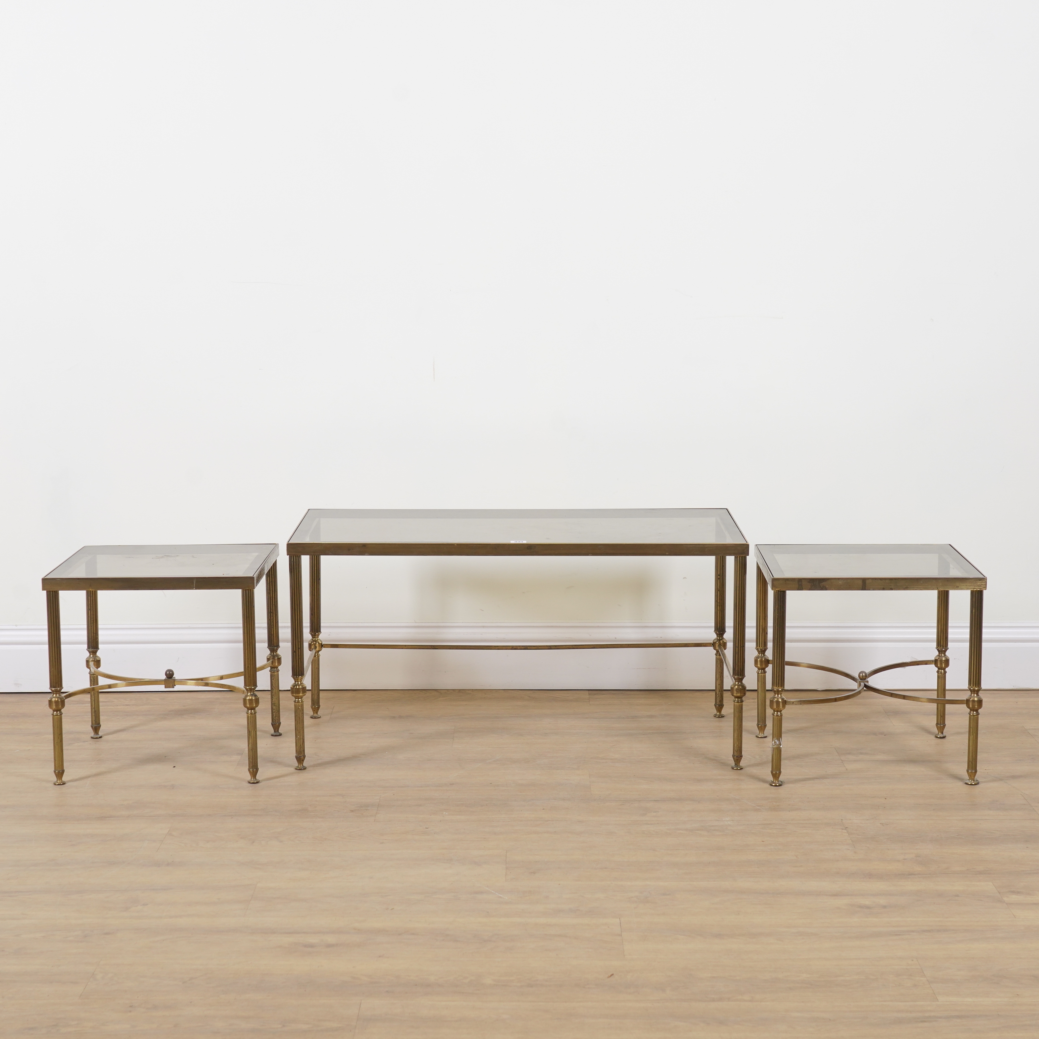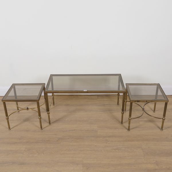 A NEST OF THREE MID 20TH CENTURY LACQUERED BRASS AND SMOKED GLASS OCCASIONAL TABLES