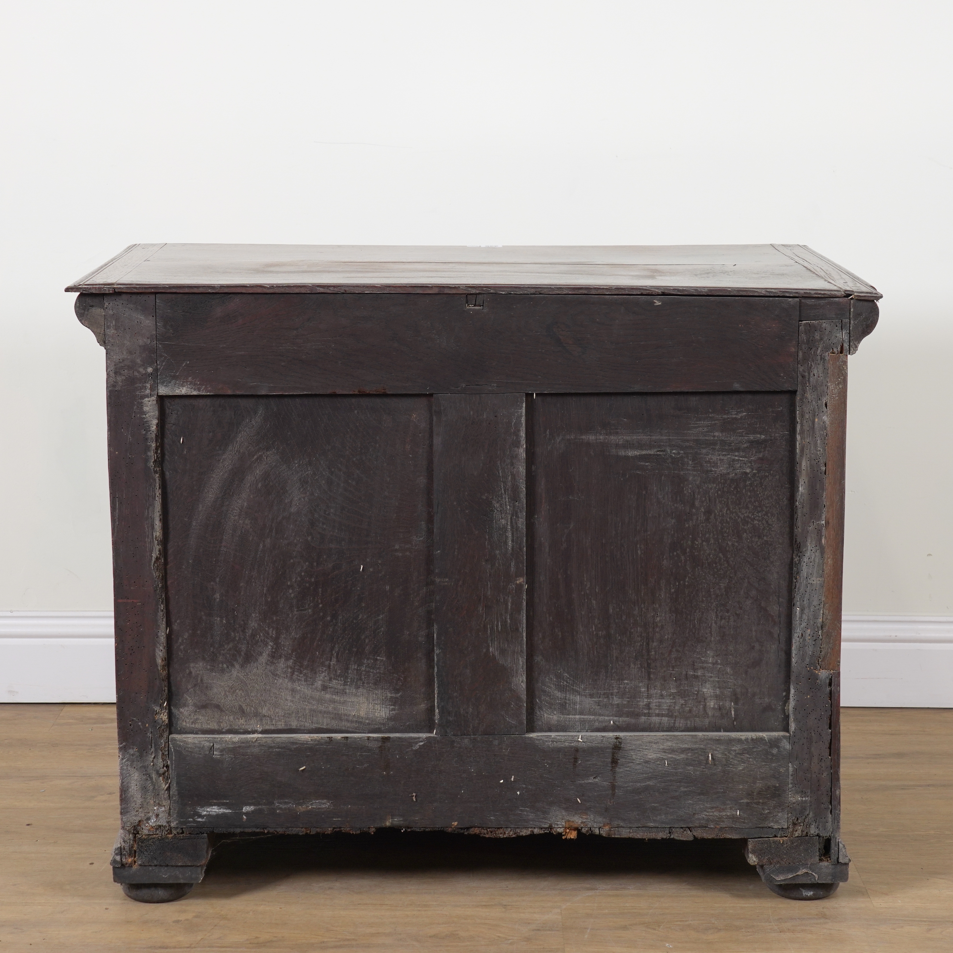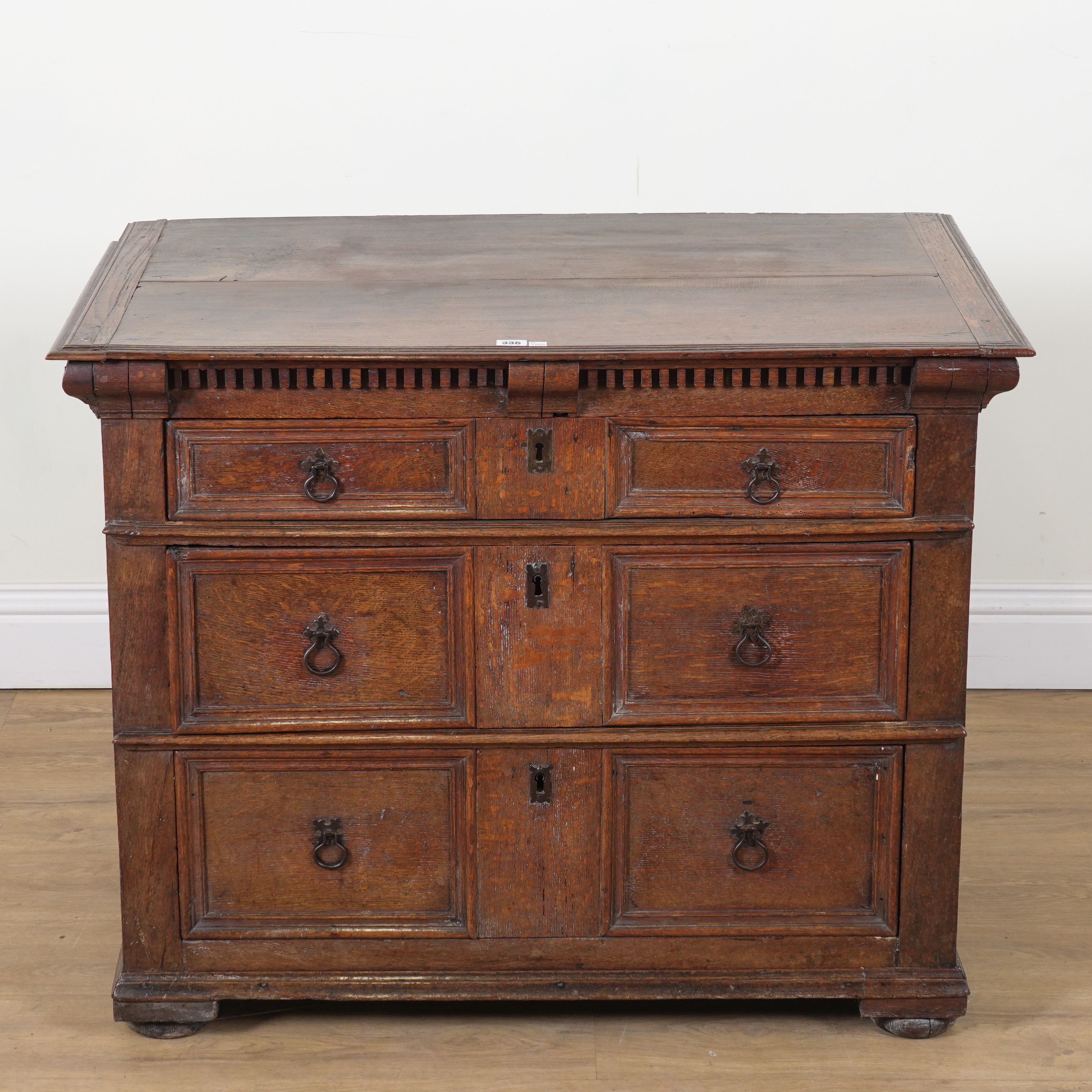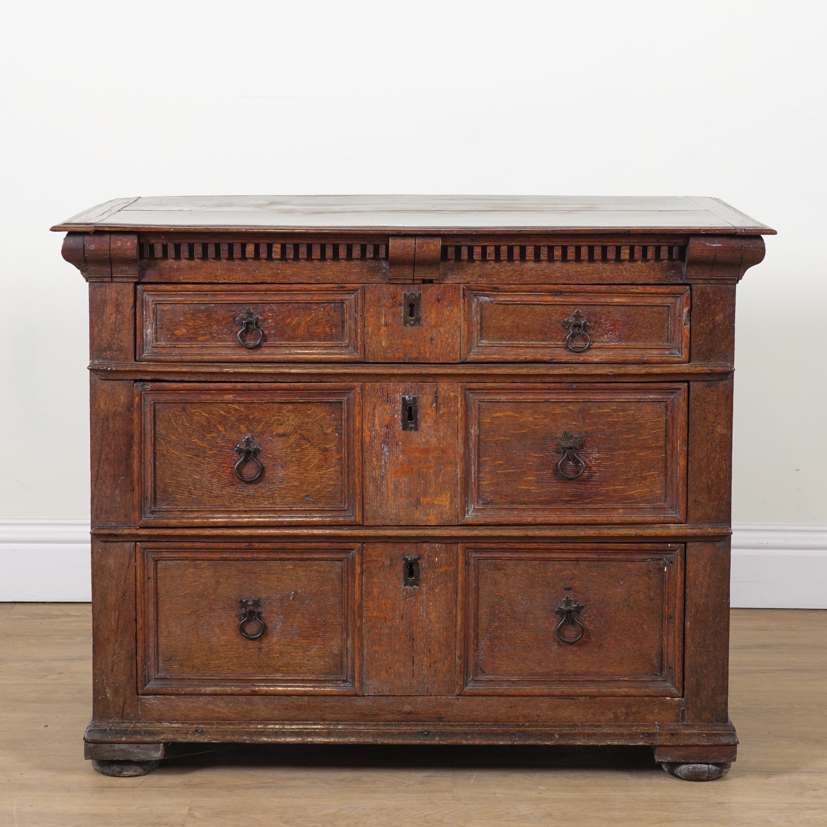 A CHARLES II OAK THREE DRAWER CHEST OF DRAWERS
