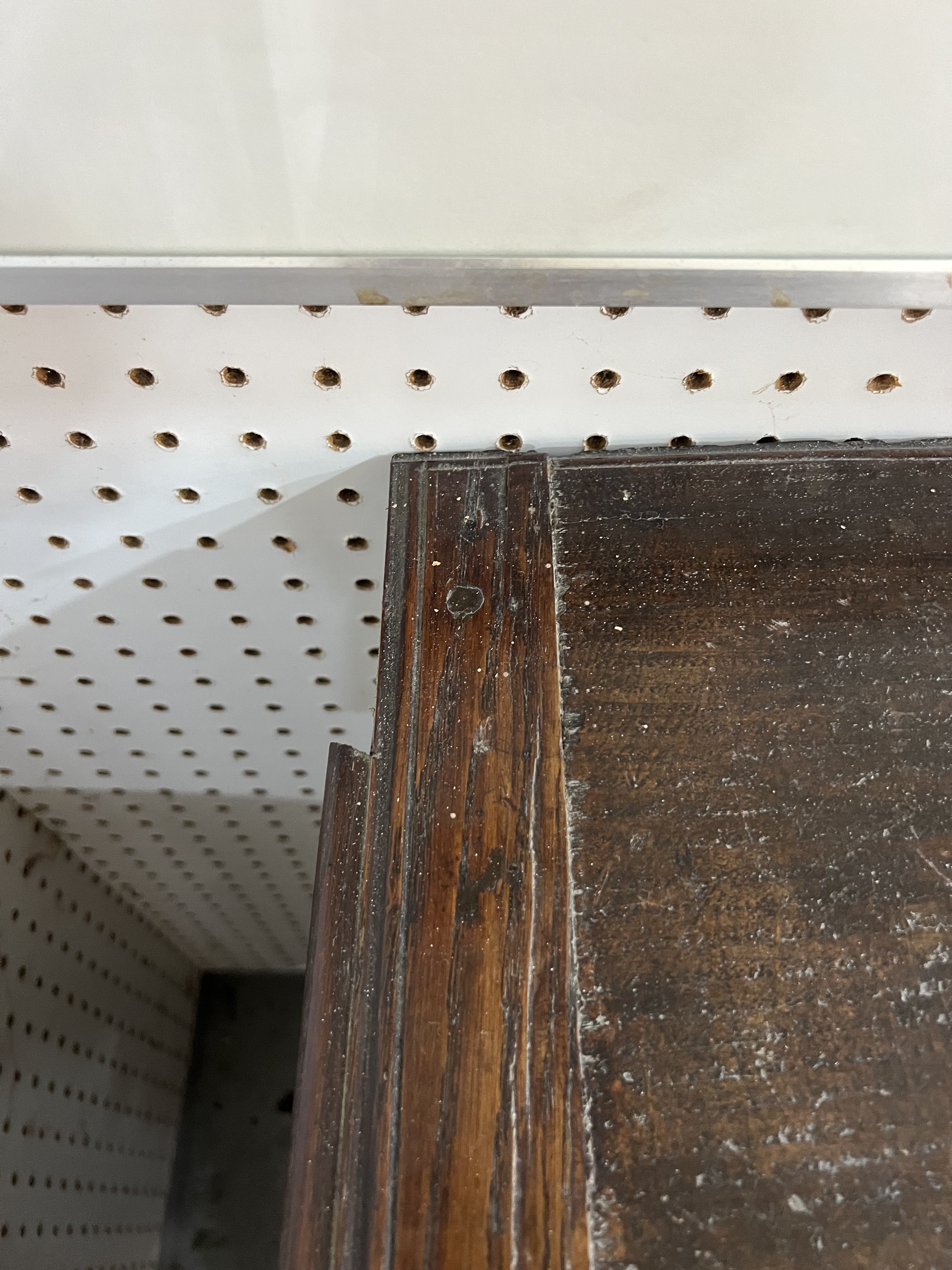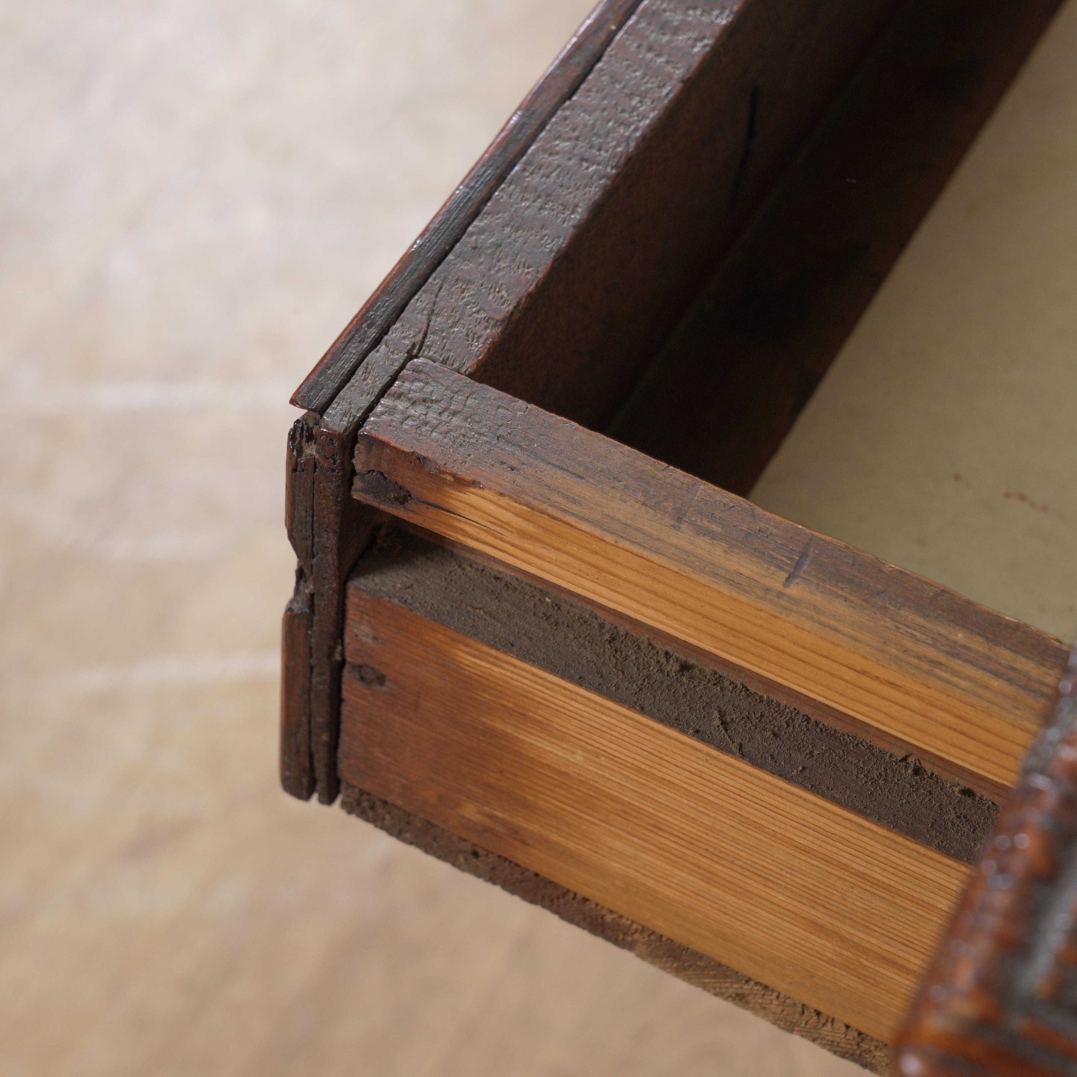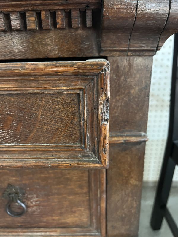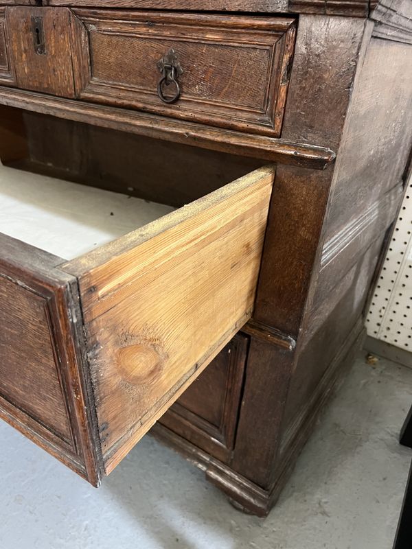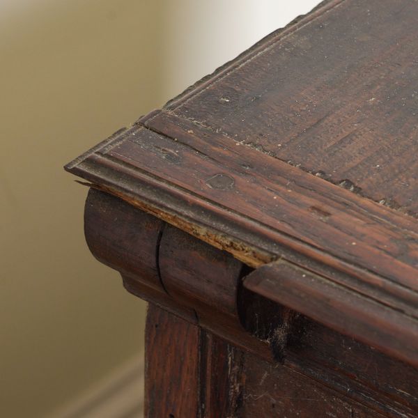 old marks and scratches expected with the age of the item, the top is not original, with later alterations to the drawer linings, loose piece of moulding to back left corner of top, traces of old wood worm, drawers fairly stiff.