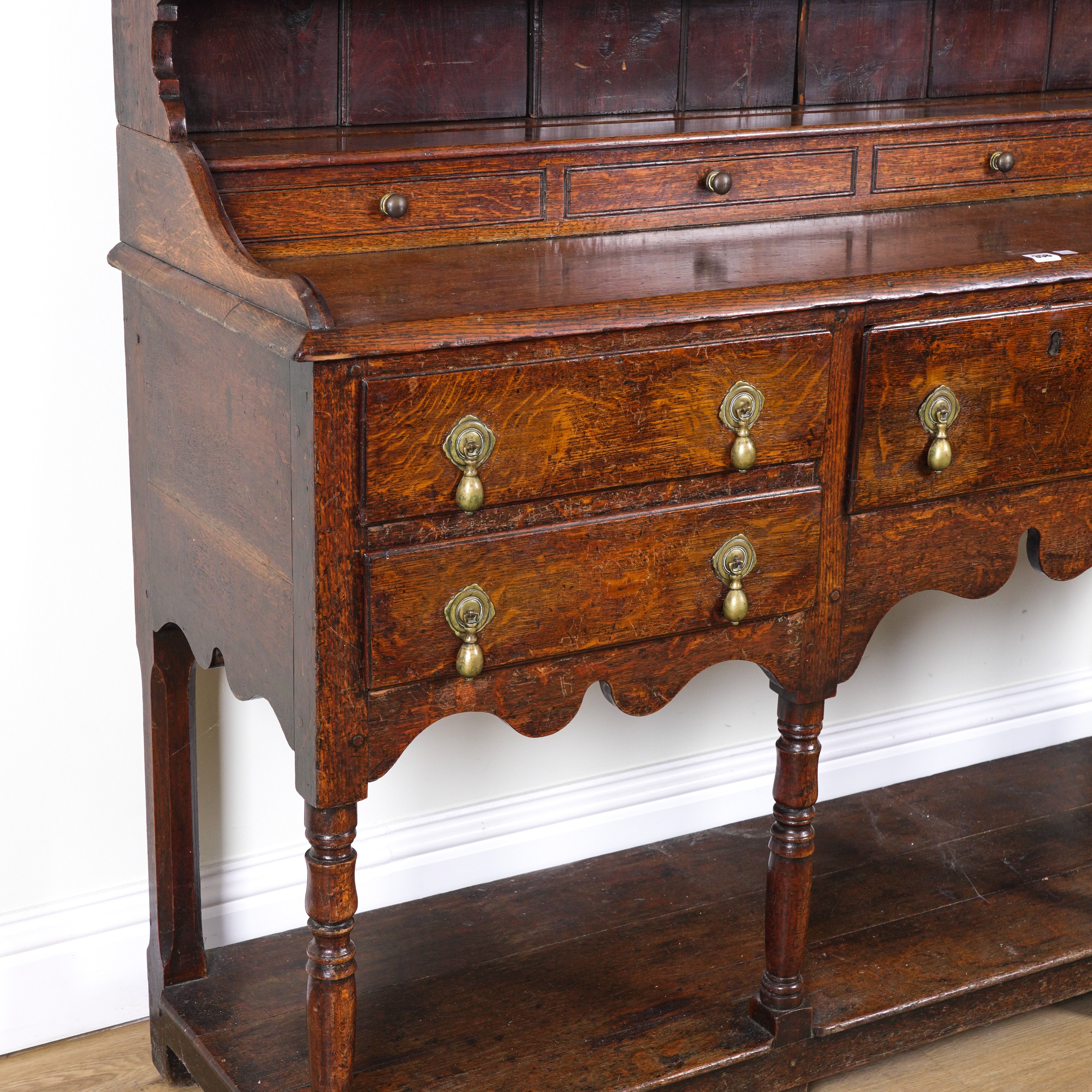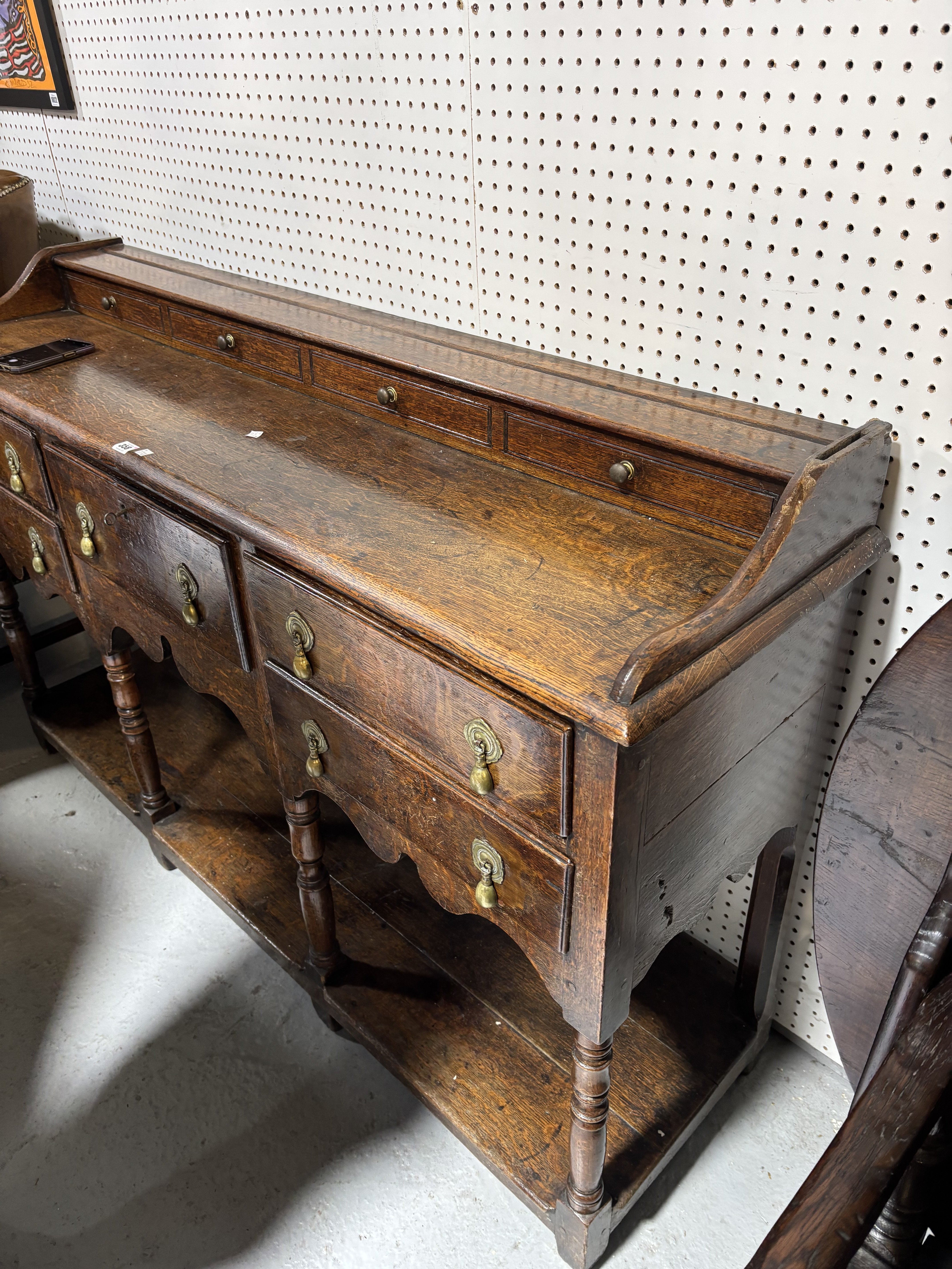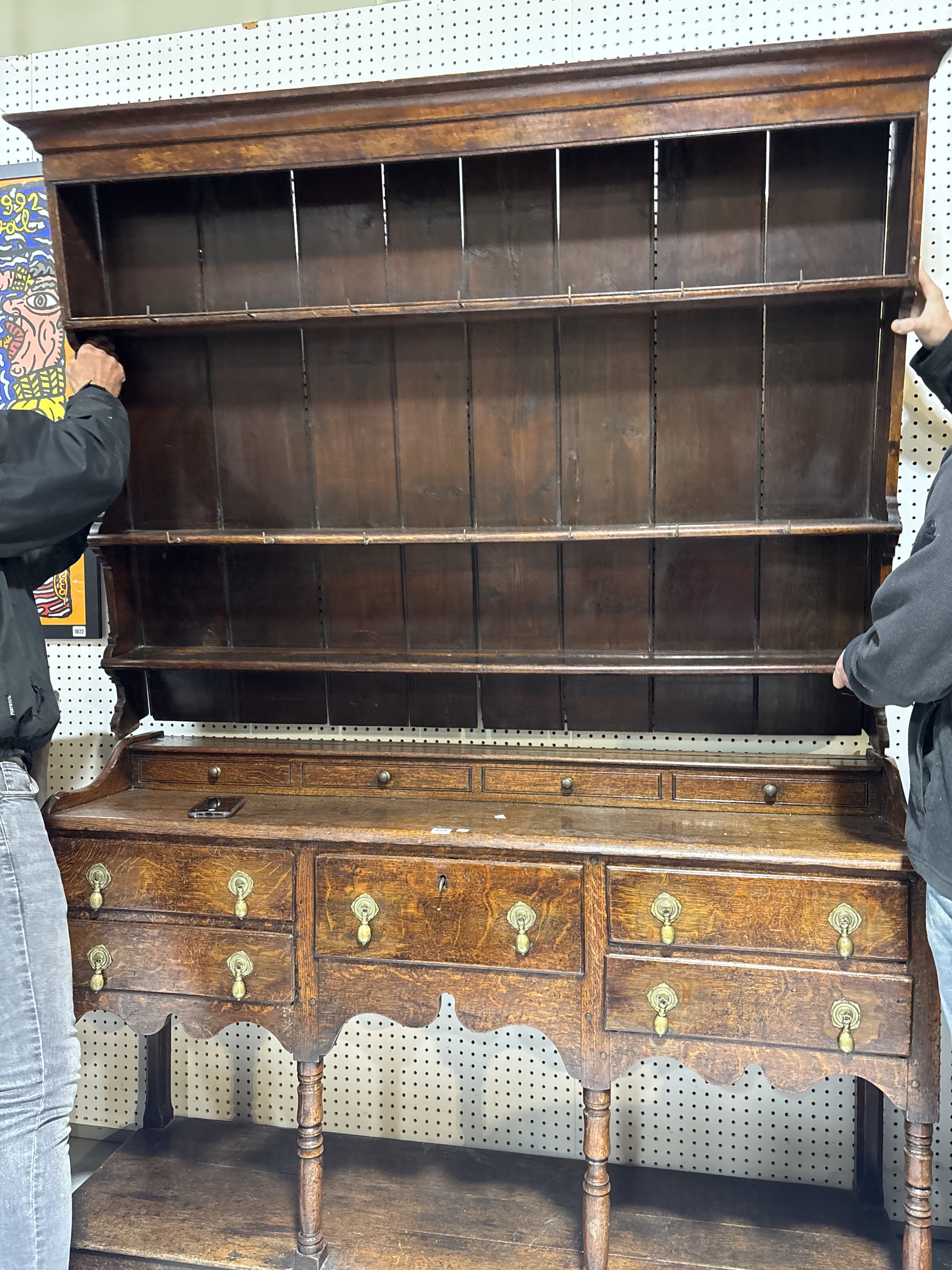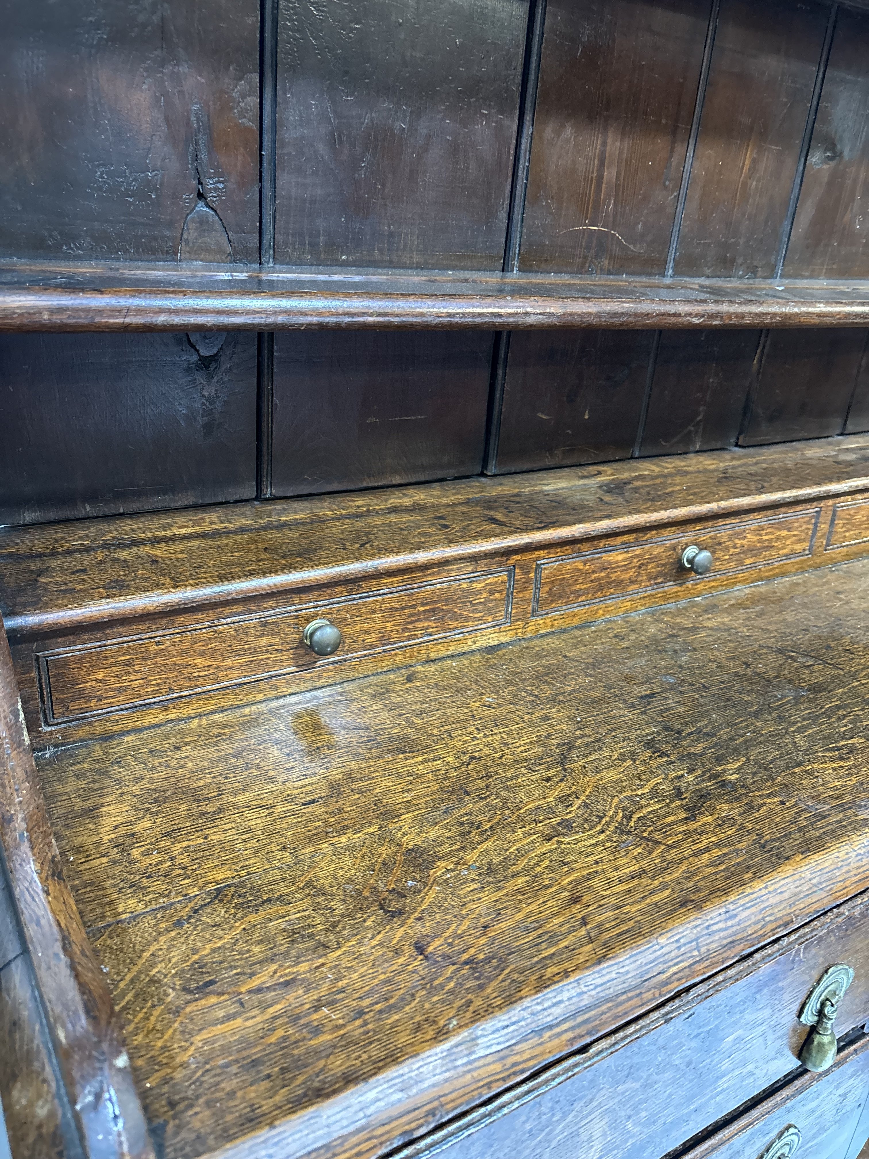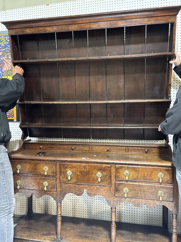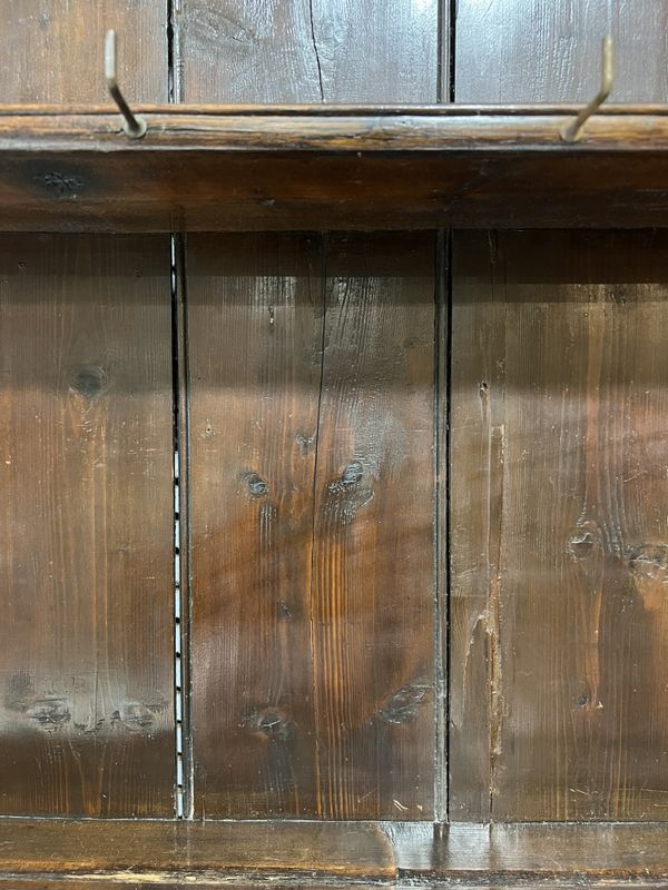 With three tier enclosed plate rack over five drawer pot board base, 153cm wide; 42cm deep; 212cm high