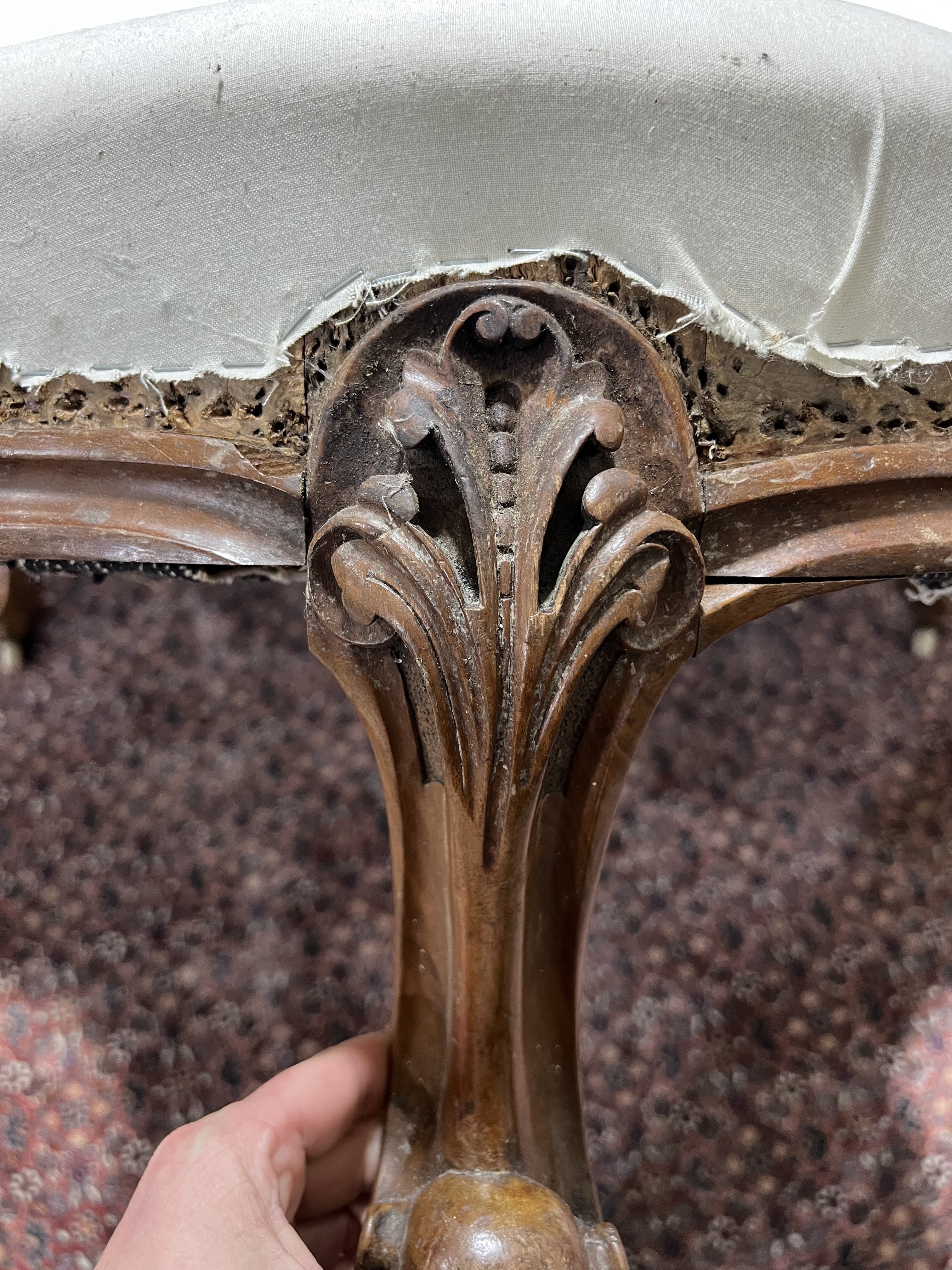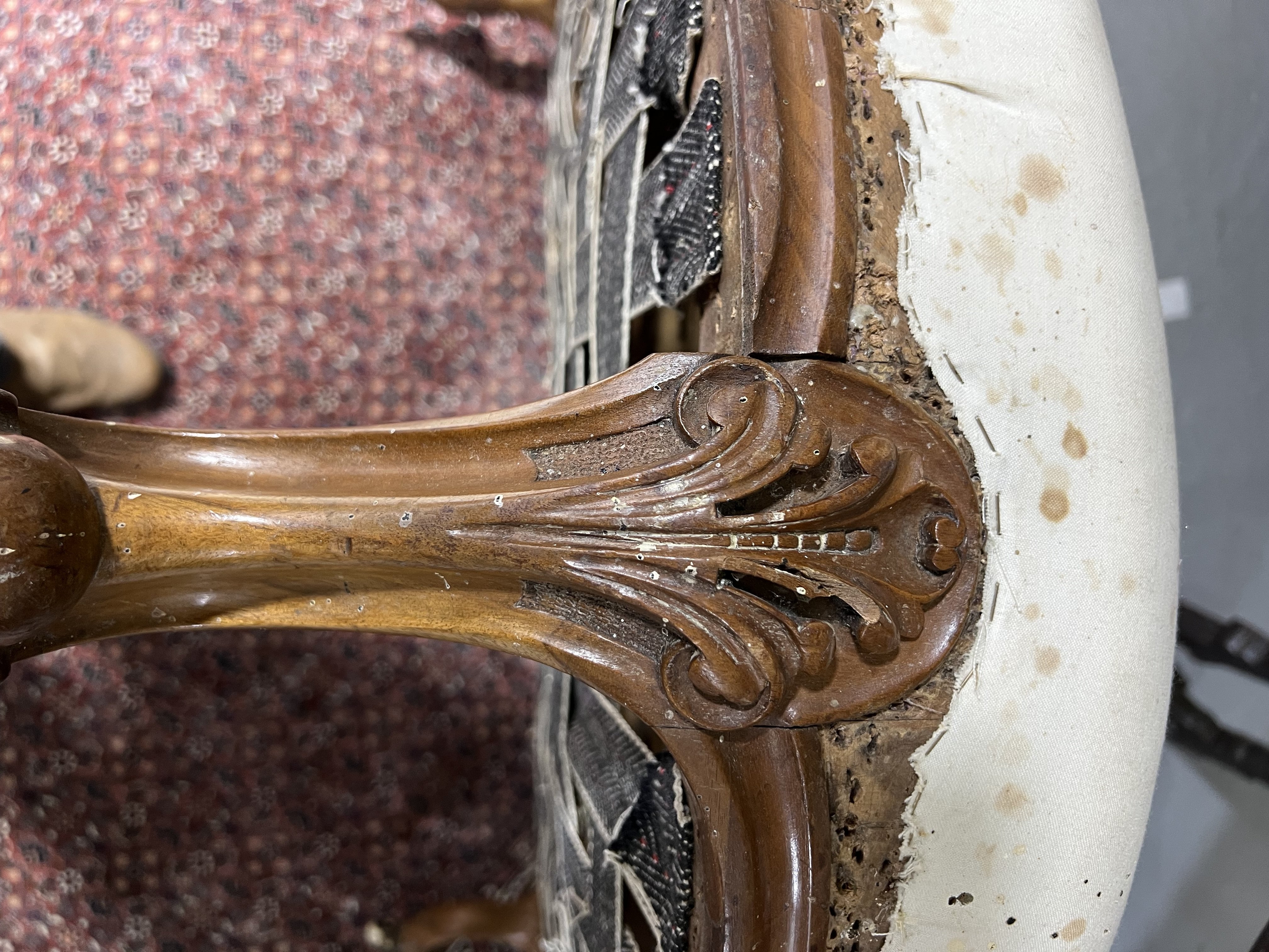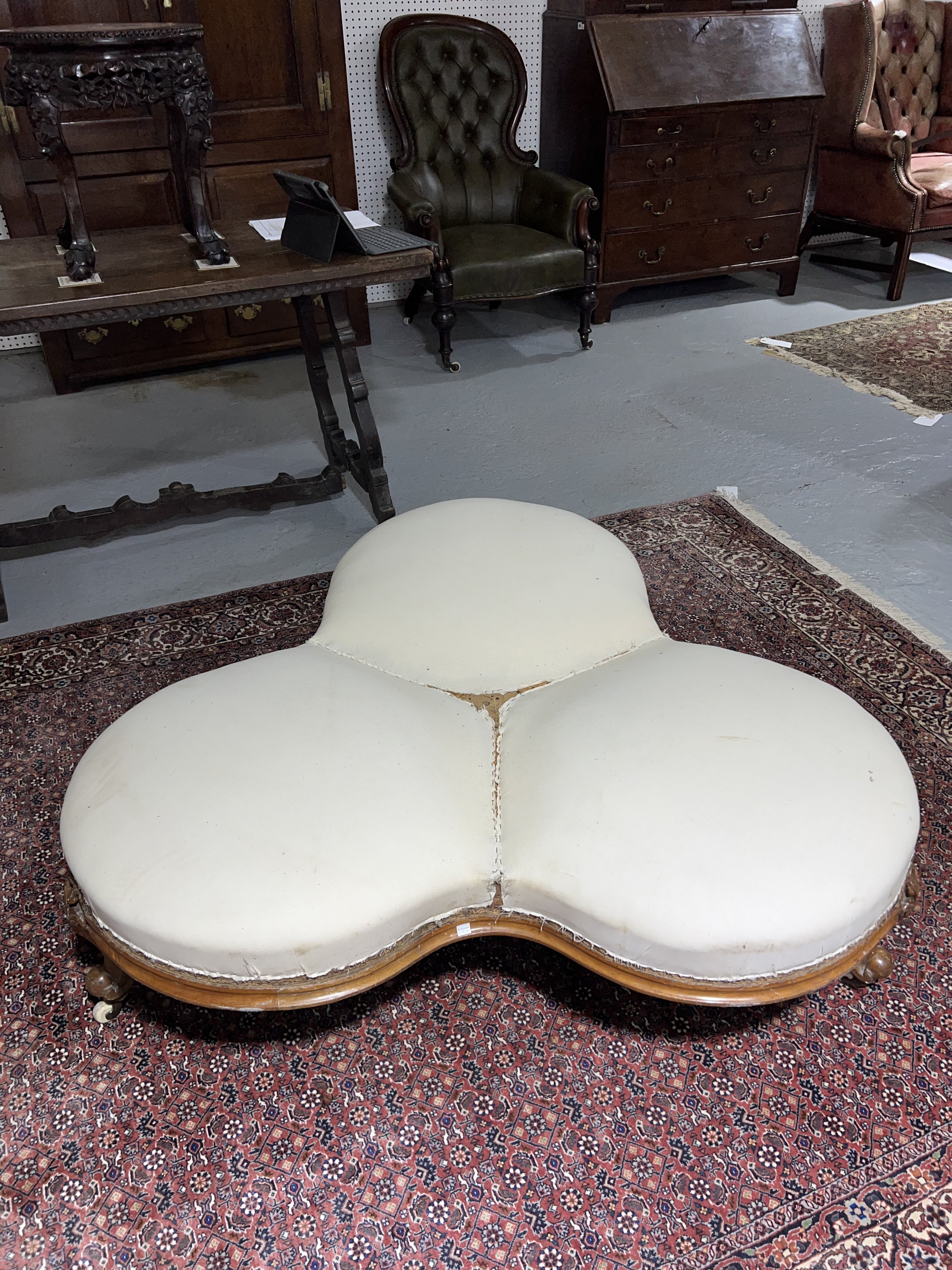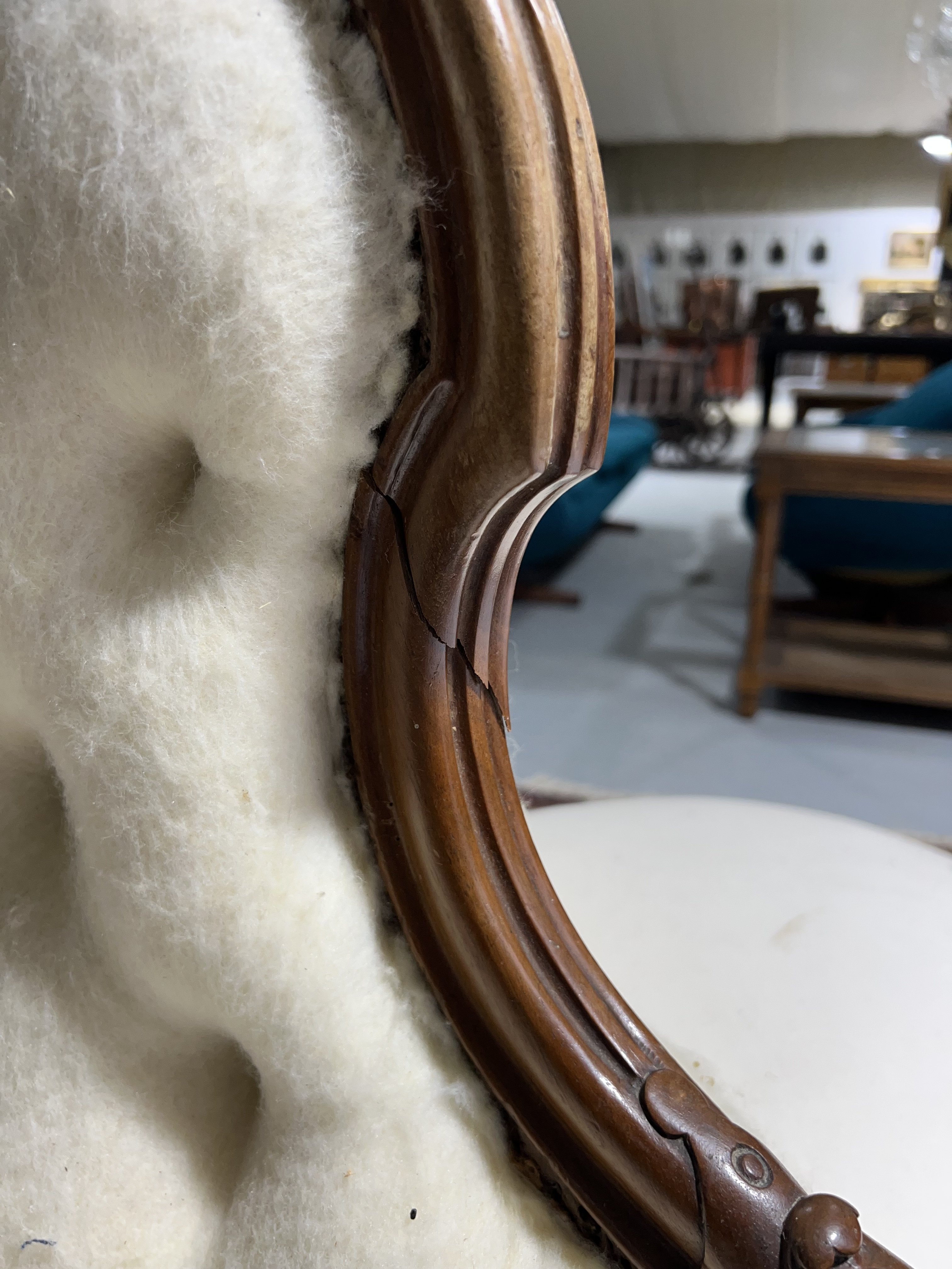 A VICTORIAN WALNUT FRAMED LOVE SEAT/CONVERSATION CHAIR